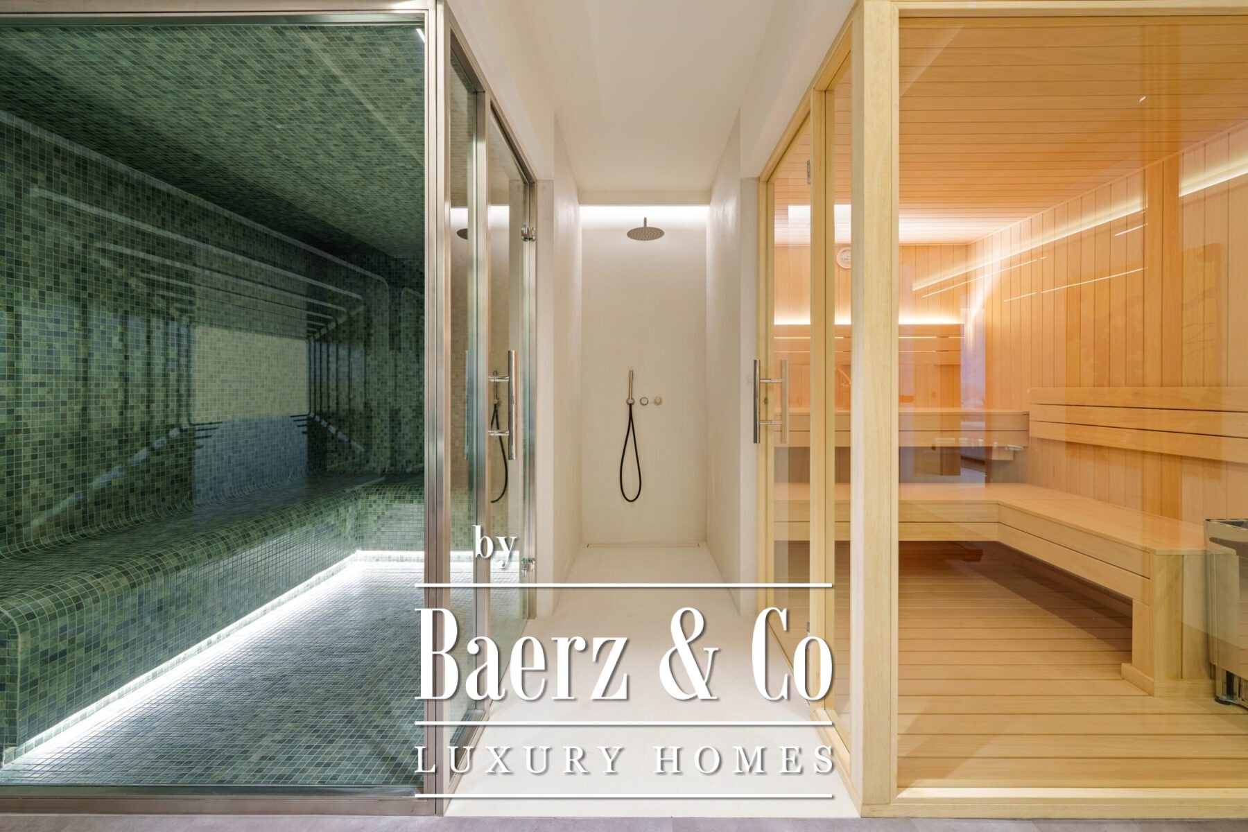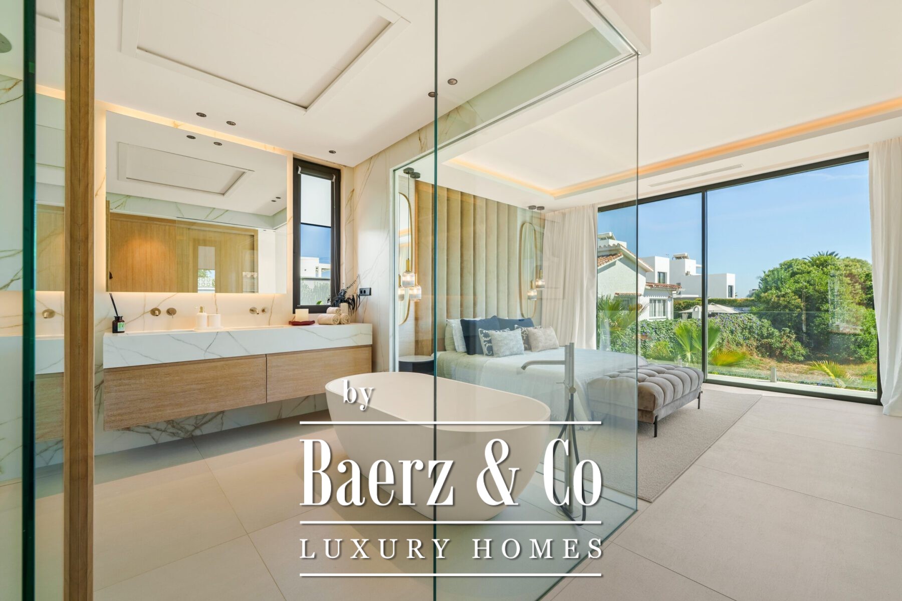 Vijf serene slaapkamers bieden direct toegang tot het terras en zijn ieder voorzien van een en-suite badkamer met marmeren afwerking, zwevende wastafels en vrijstaande baden. De mastersuite onderscheidt zich door zijn royale omvang en een zonnig privéterras, perfect als rustige schuilplaats. Op de benedenverdieping bevindt zich een volledig uitgeruste fitnessruimte, glazen sauna en stoombad voor een persoonlijke wellnessbeleving. Een beveiligde garage, luxe entree en uitzicht op de bergen geven verdere verfijning aan dit perceel van 612 m², waarmee het moderne comfort zich op steenworp afstand bevindt van Marbella’s golfbanen, stranden en lokale voorzieningen. Deze luxe villa te koop in Marbella vertegenwoordigt een verheven benadering van eigentijds mediterraan wonen.
