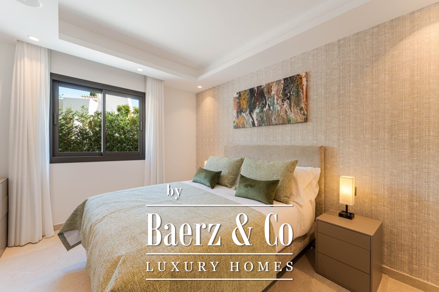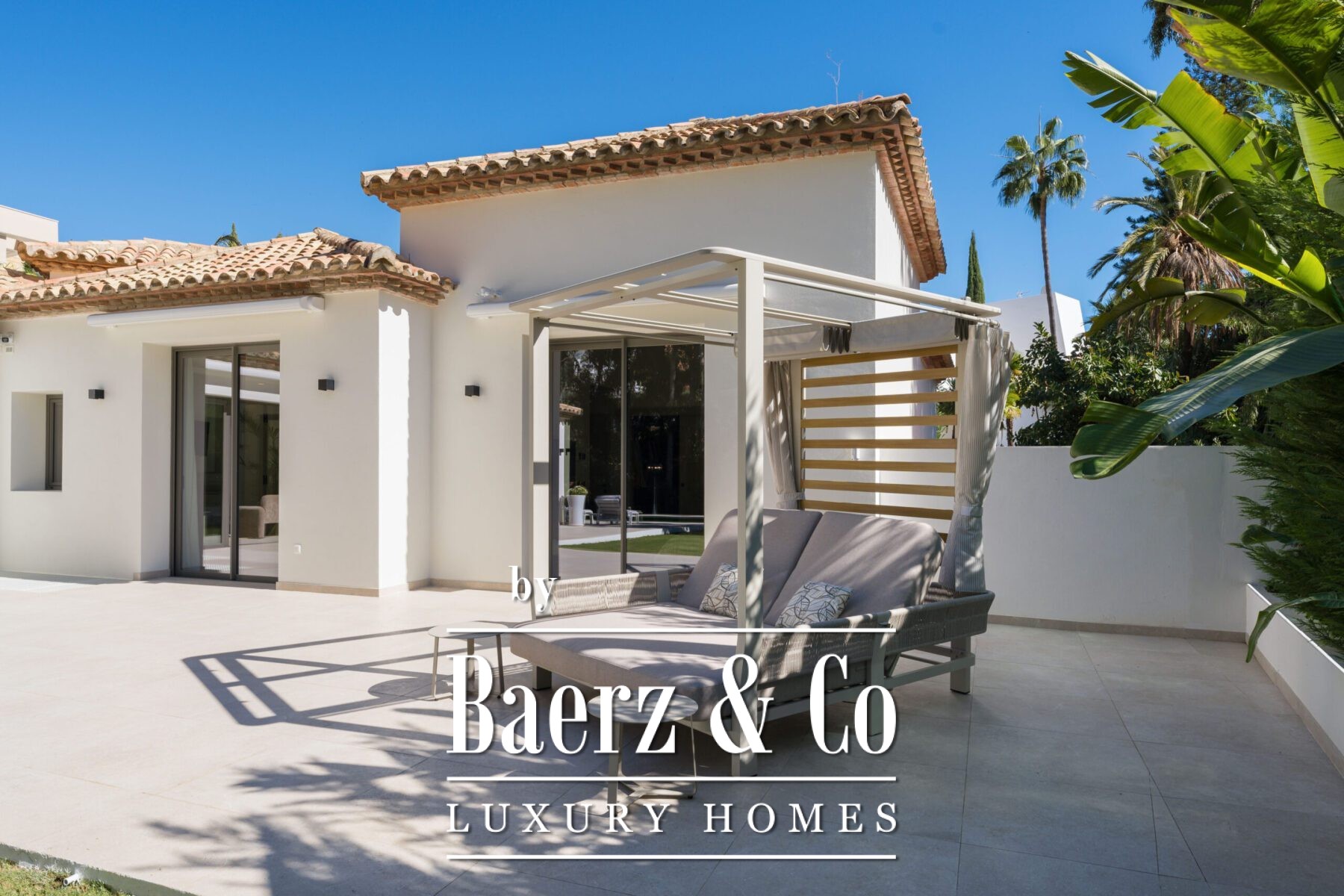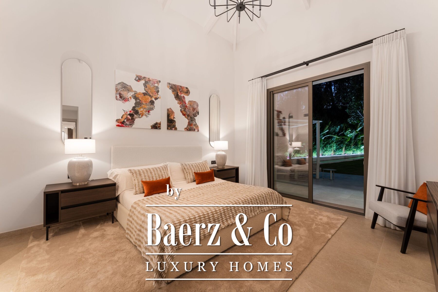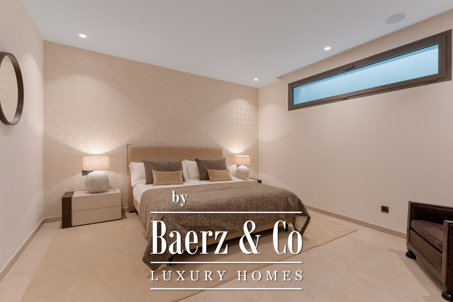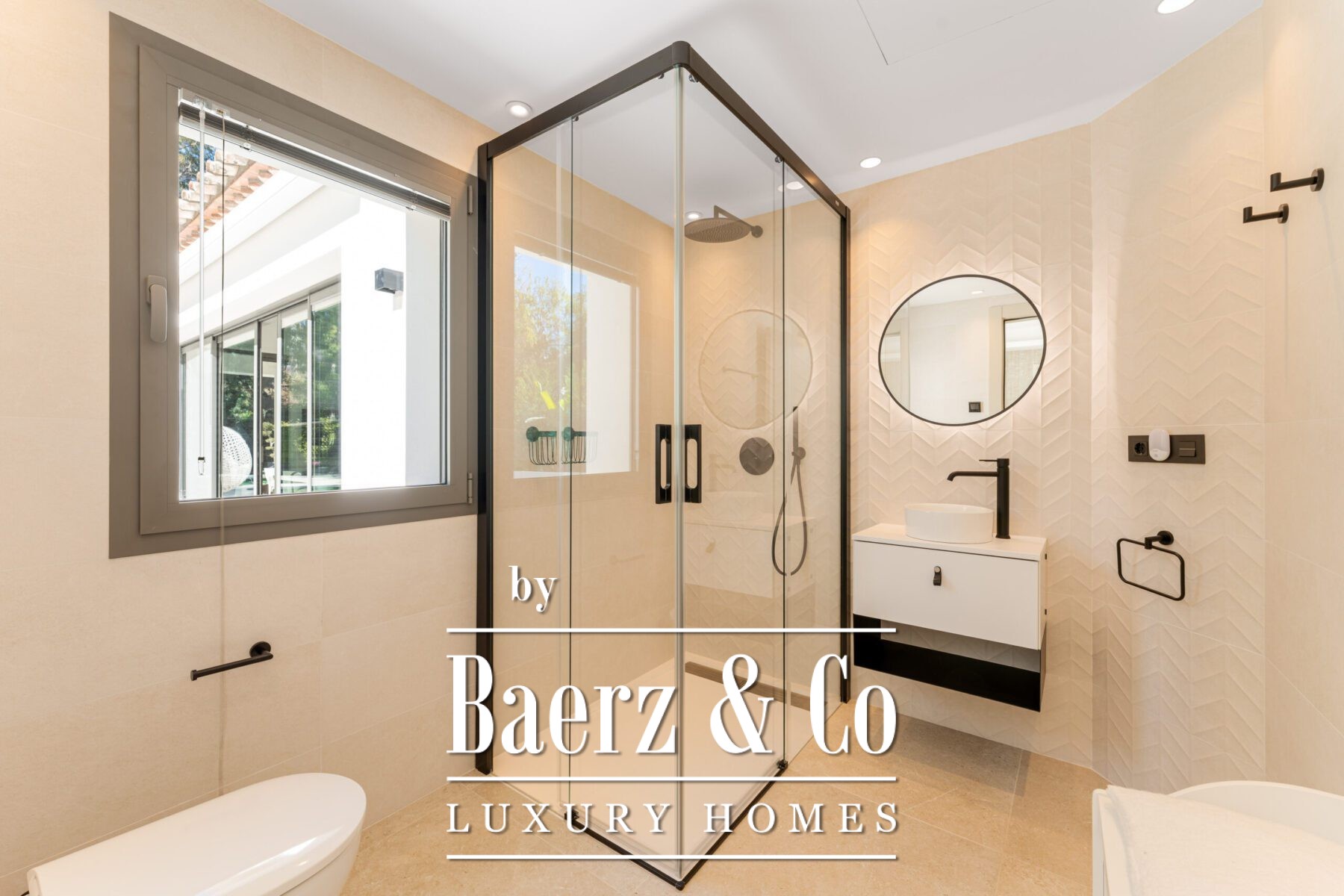De doordacht aangelegde tuin omsluit een privé, verwarmd zwembad en royale terrassen die uitgerust zijn met een buitenkeuken, eetgedeelte en diverse zitplekken voor tijdloos buitenleven. Voorzieningen als vloerverwarming, zone airconditioning en geavanceerde beveiliging voldoen aan de wensen van internationale kopers. De villa waarborgt totale privacy en is toch dichtbij toonaangevende internationale scholen, Marbella Sports & Tennis Club en biedt directe aansluiting op de AP-7.
