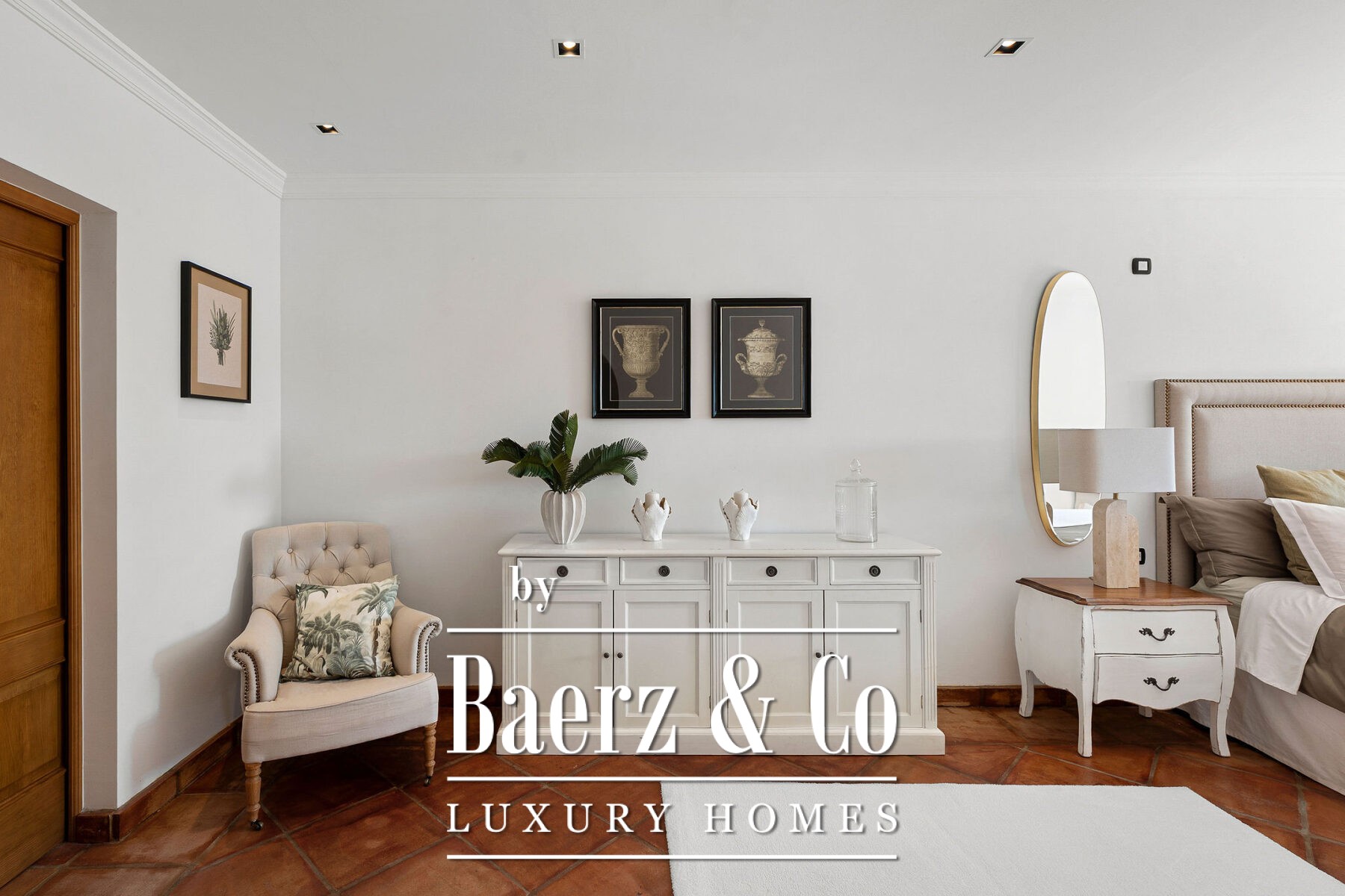 Het interieur ademt mediterrane elegantie, gekenmerkt door hoge plafonds, gracieuze bogen en open ruimtes die vloeiend overlopen van formeel naar informeel wonen. De vier slaapkamers en vier badkamers zijn zo gesitueerd dat privacy en comfort samengaan, terwijl de master suite beschikt over een inloopkast. Vloerverwarming, airconditioning voor zowel warm als koud, en een geïntegreerd surround sound systeem waarborgen gemoedsrust en welzijn. Daarnaast biedt de privé bioscoopruimte en de TV-lounge ultieme flexibiliteit voor ontspanning of gezelschap.
