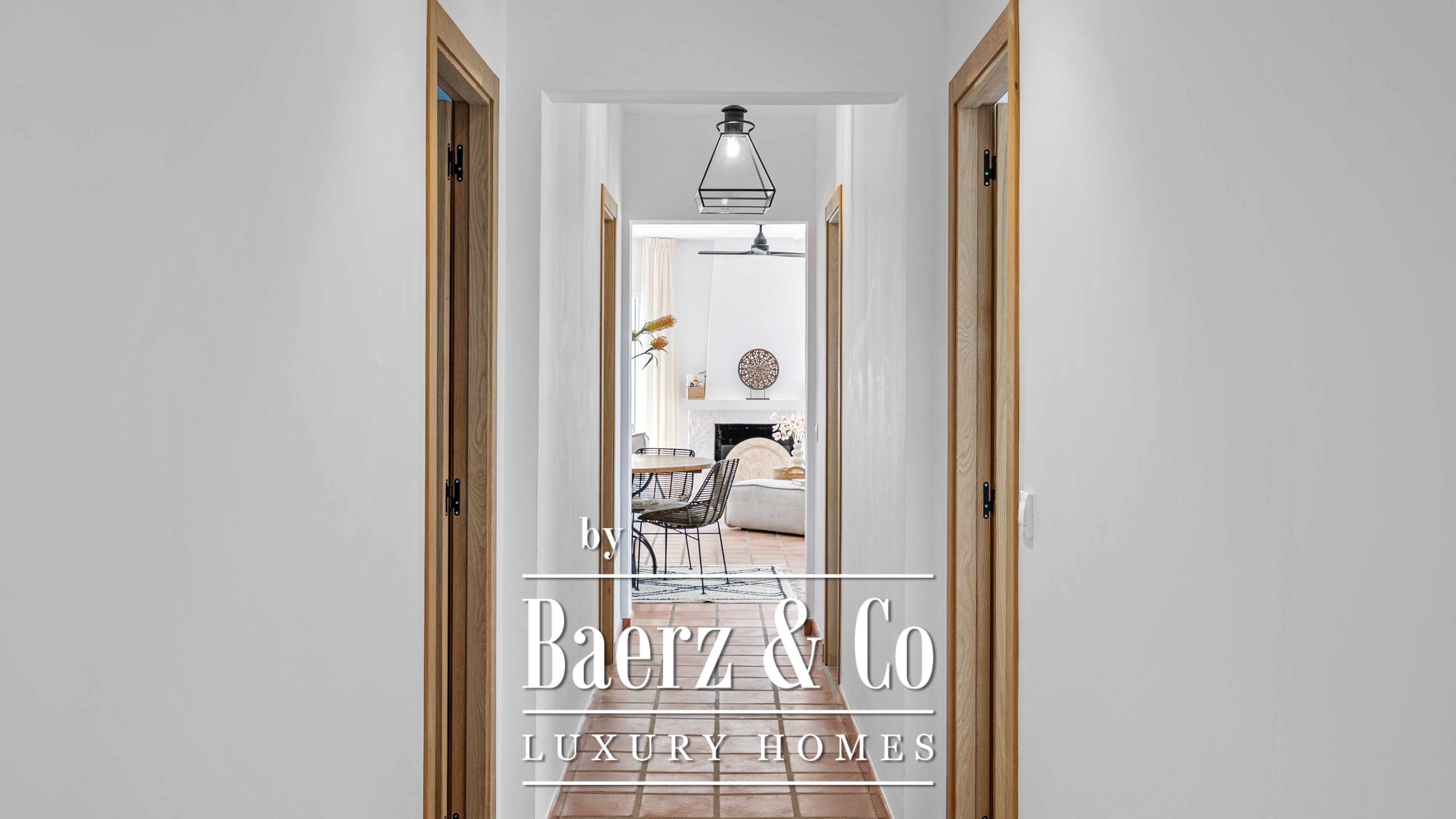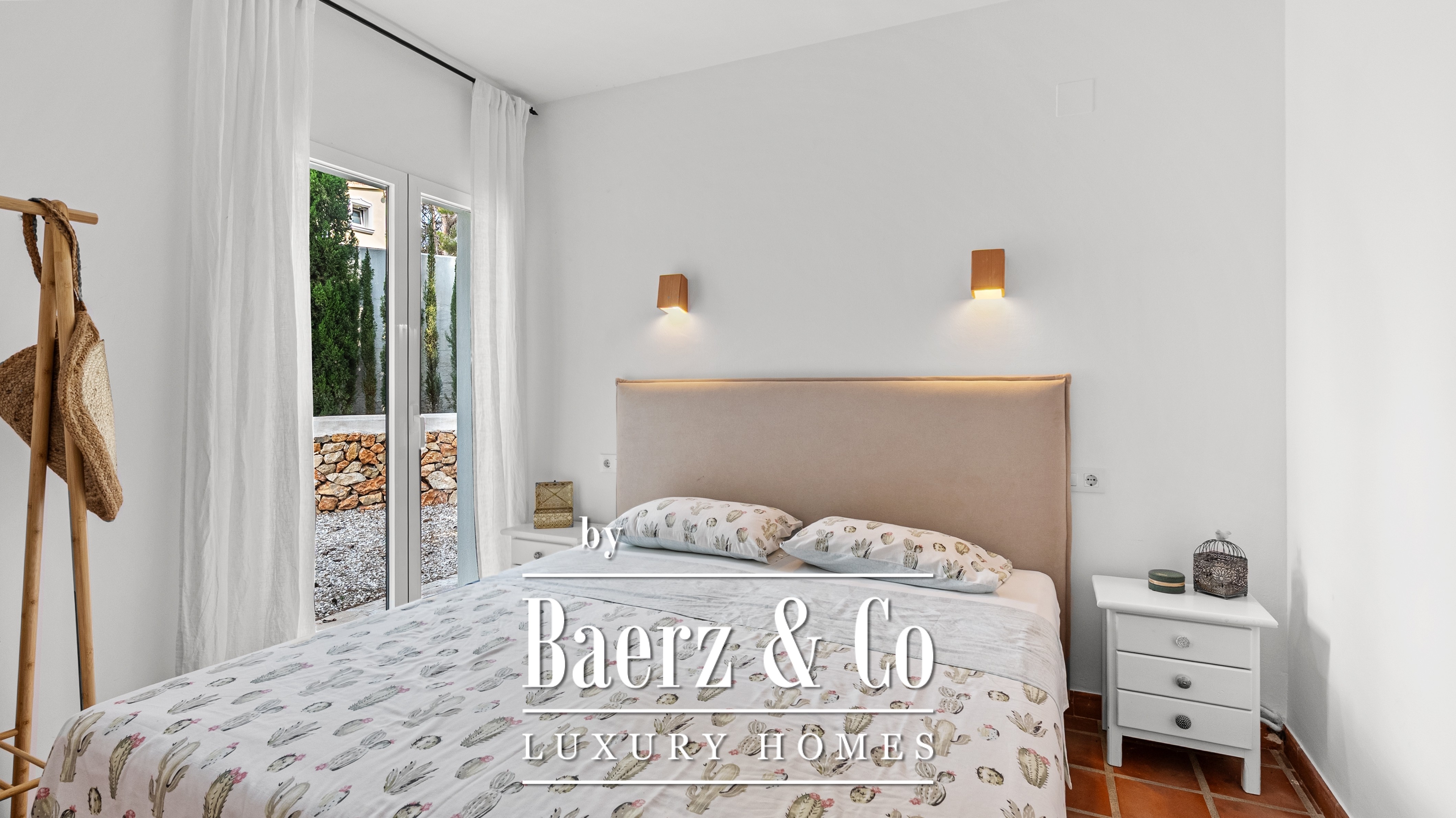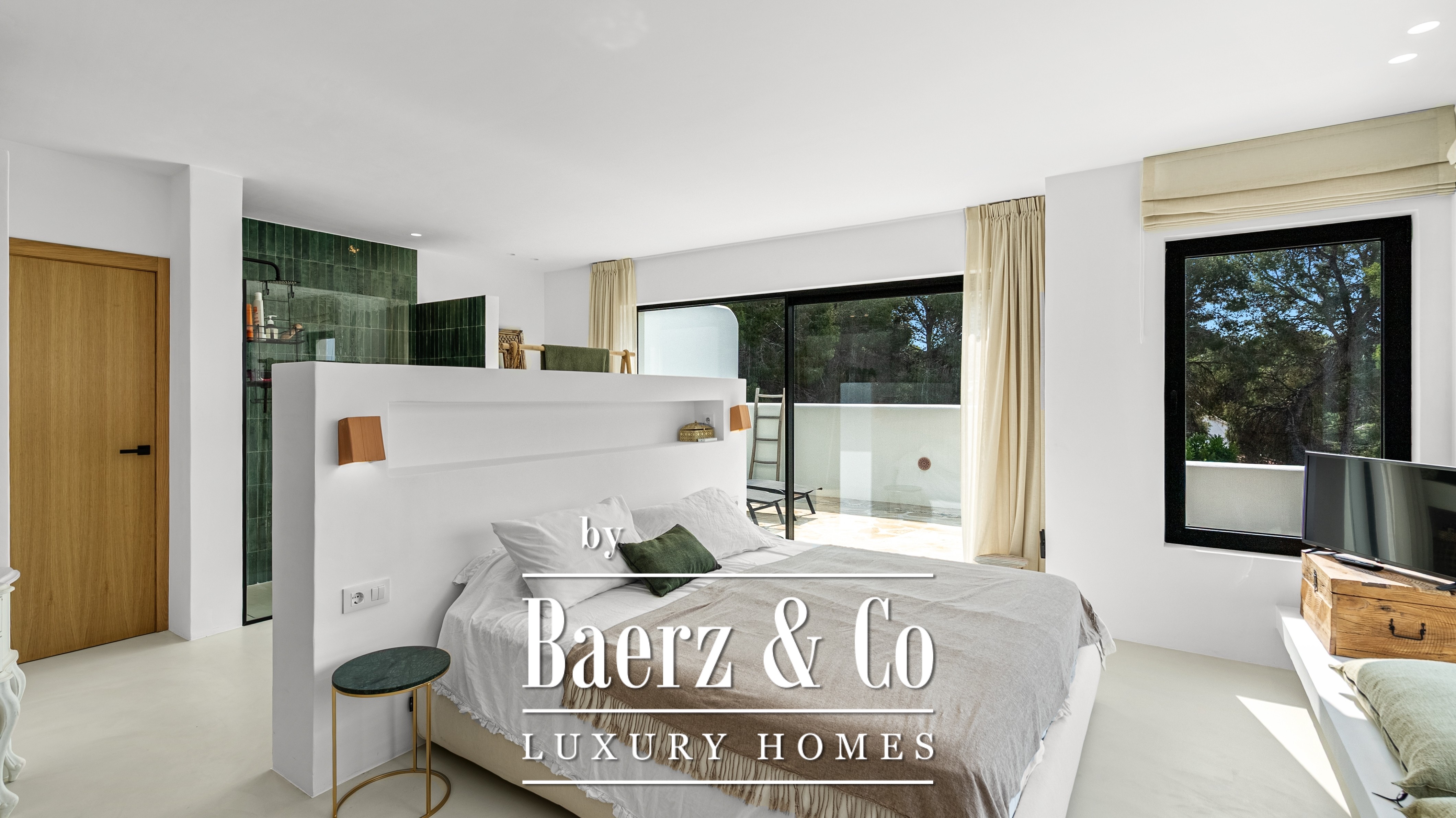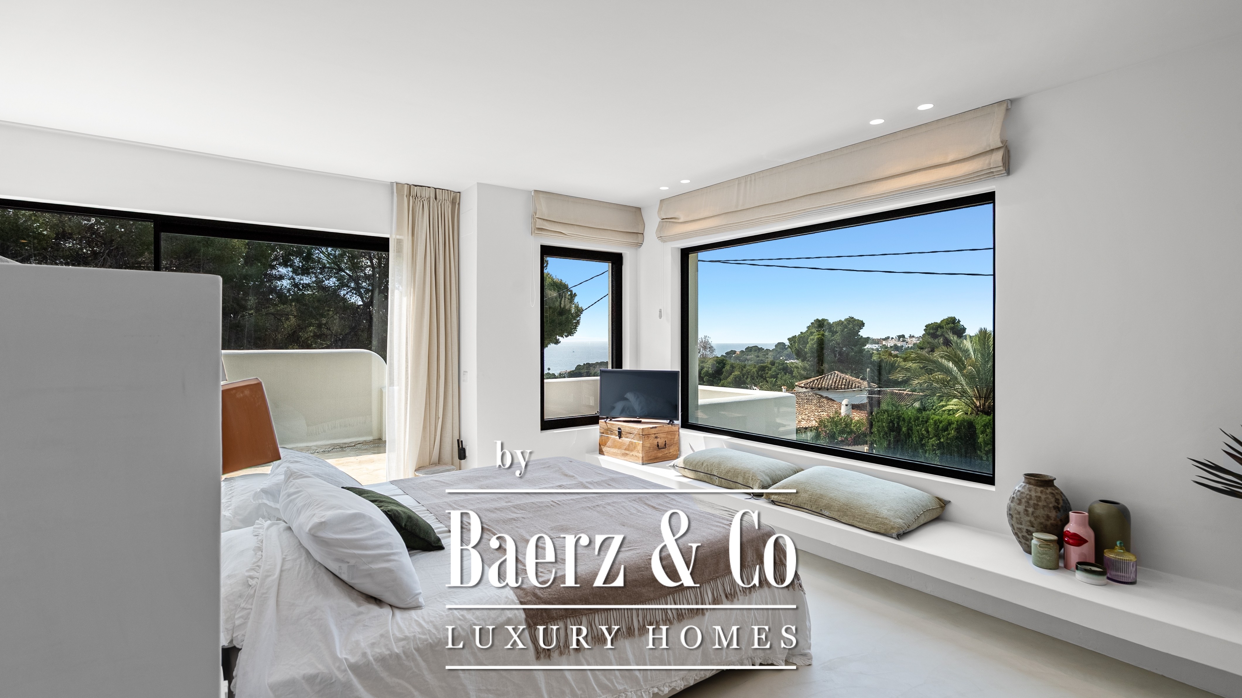 De villa beschikt over vier ruime slaapkamers en drie verfijnde badkamers, waaronder een master suite met een uniek detail: uitzicht op zee, zelfs vanuit de douche – een dagelijkse dosis luxe.