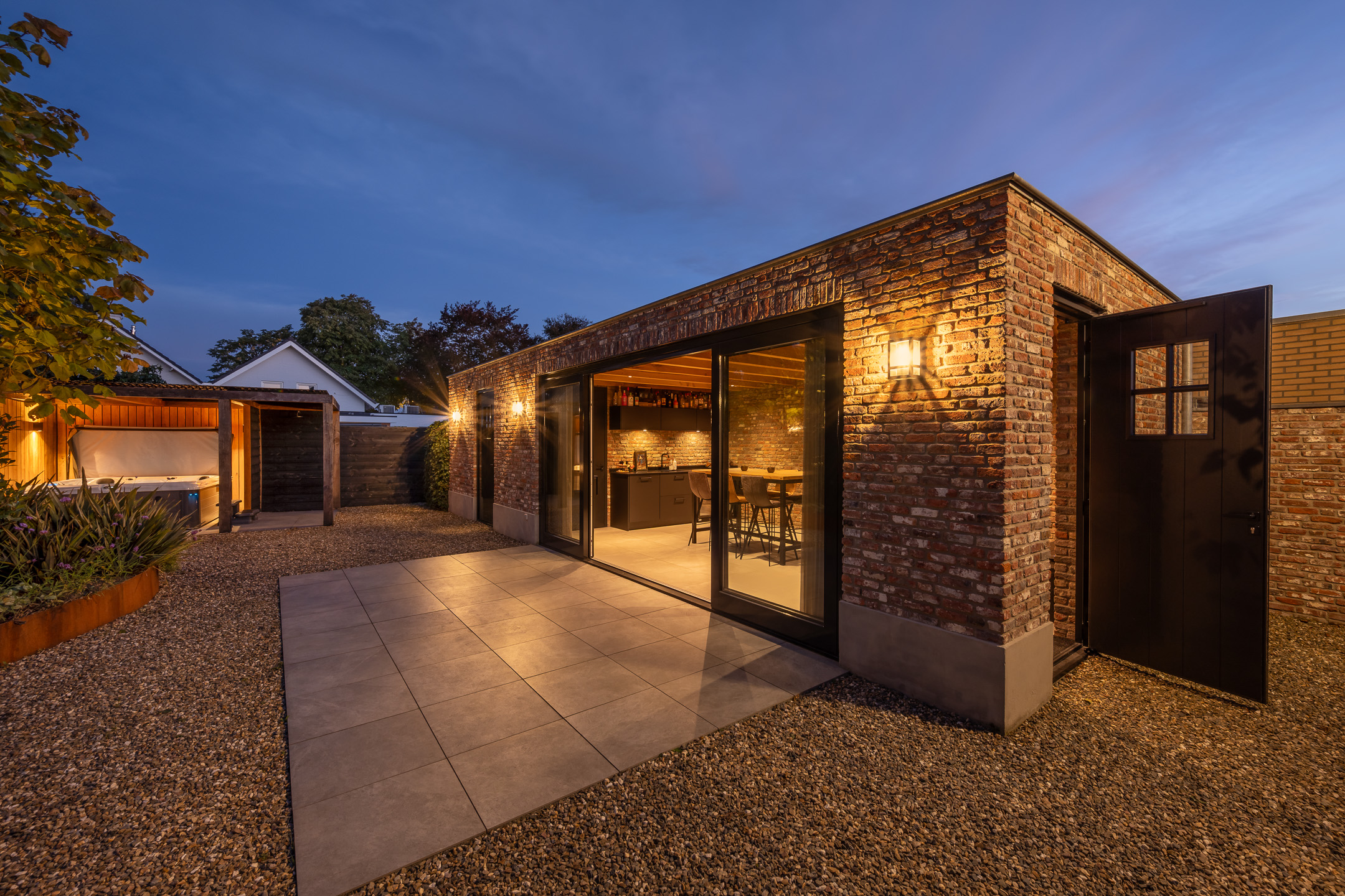In de tuin bevindt zich een volledig geïsoleerd guesthouse, voorzien van een bar en een toilet. Deze ruimte is uitermate geschikt als gastenverblijf, kantoor aan huis of ontspanningsruimte.