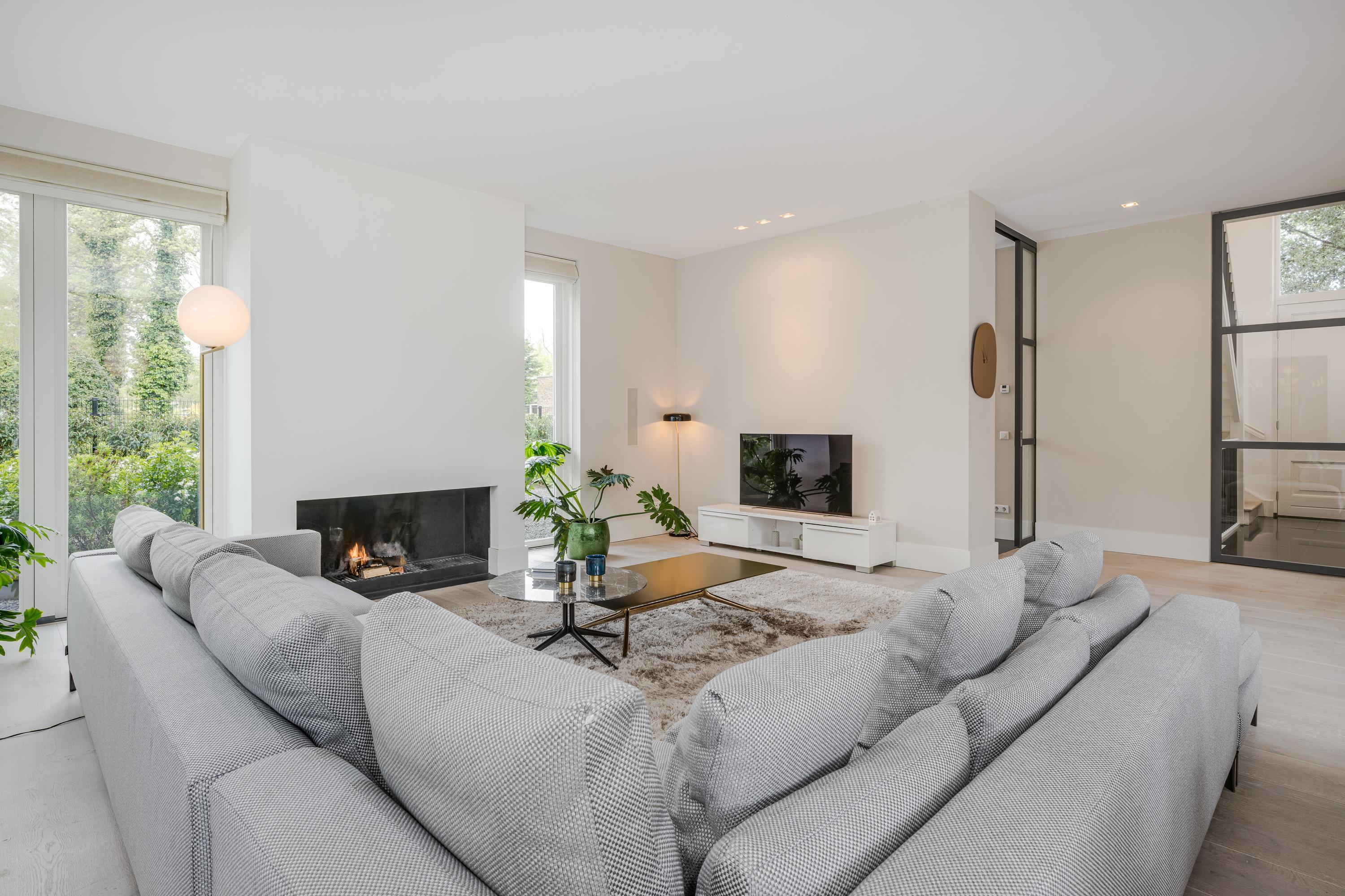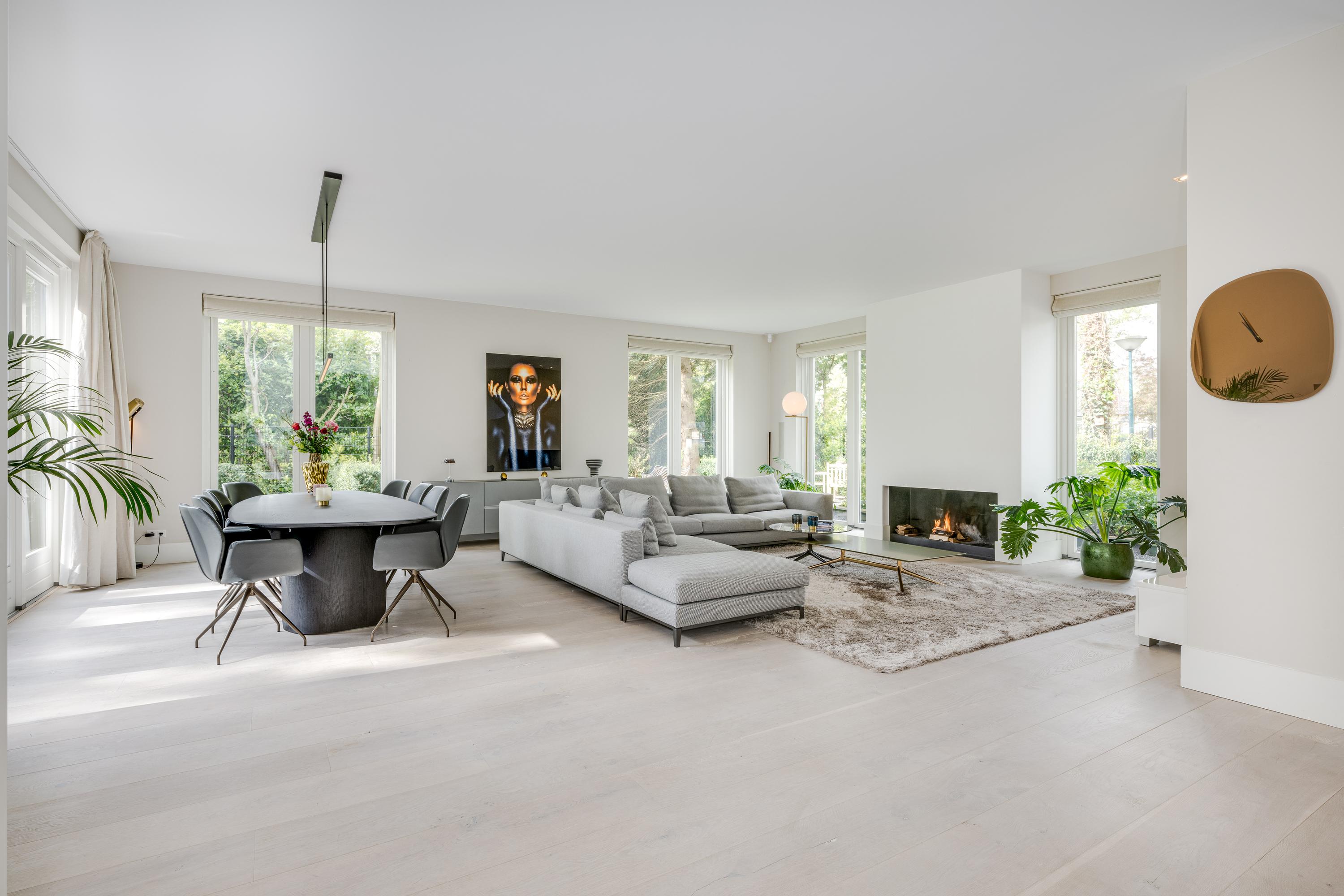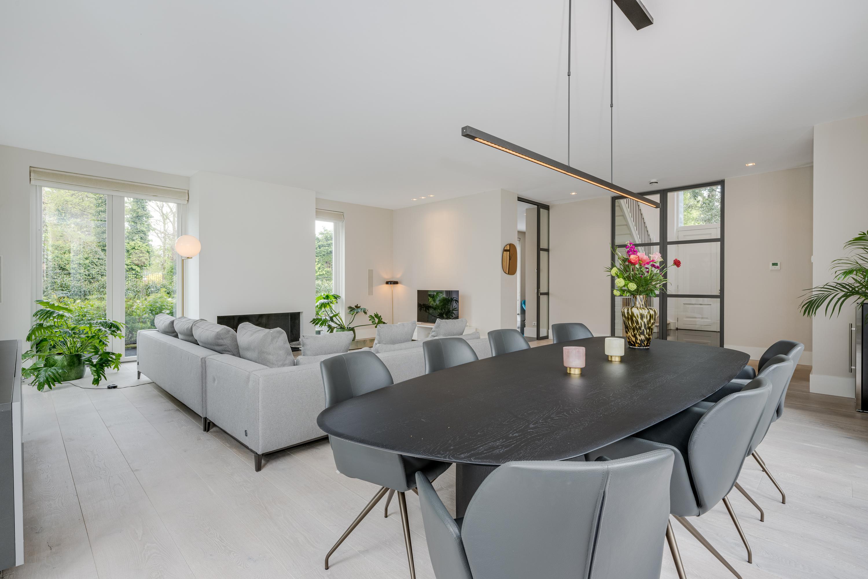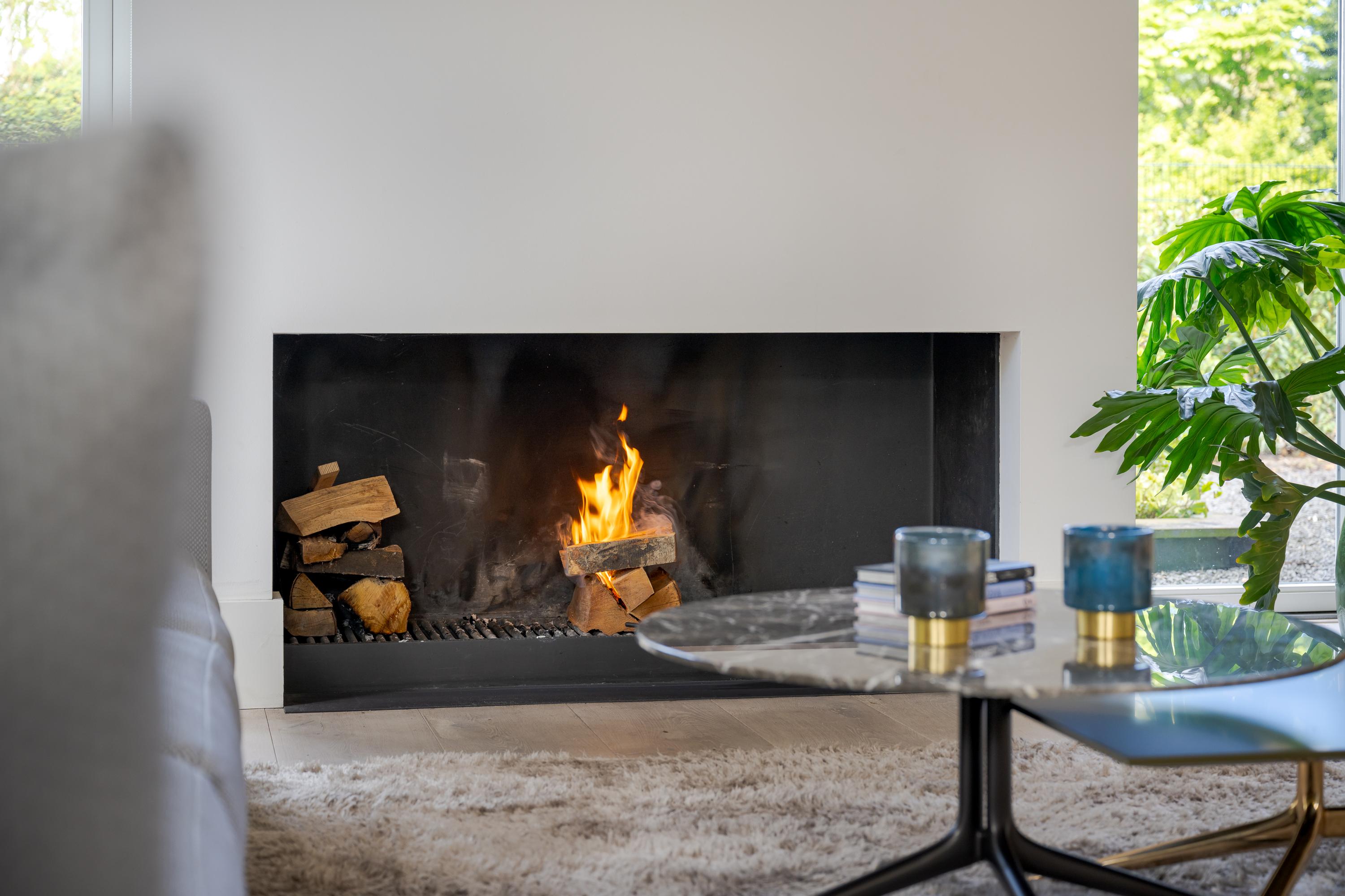 De woonkamer heeft een lichte eiken vloer met een moderne open haard (hout gestookt), hoge ramen en dubbele openslaande deuren naar het terras, waardoor er op elk moment van de dag licht binnenvalt vanuit alle kanten en zicht is op de omliggende tuin. De keuken en de studeerkamer kunnen door moderne schuifdeuren gescheiden worden van de woonkamer, maar geopend vormen deze ruimtes één geheel. De vloer in keuken en werkkamer zijn van hardsteen, welke samen met de elementen van eikenhout en kleuren een fraai effect geven. De werkkamer/bibliotheek is ruim en heeft een ingebouwde boekenwand in L-vorm.