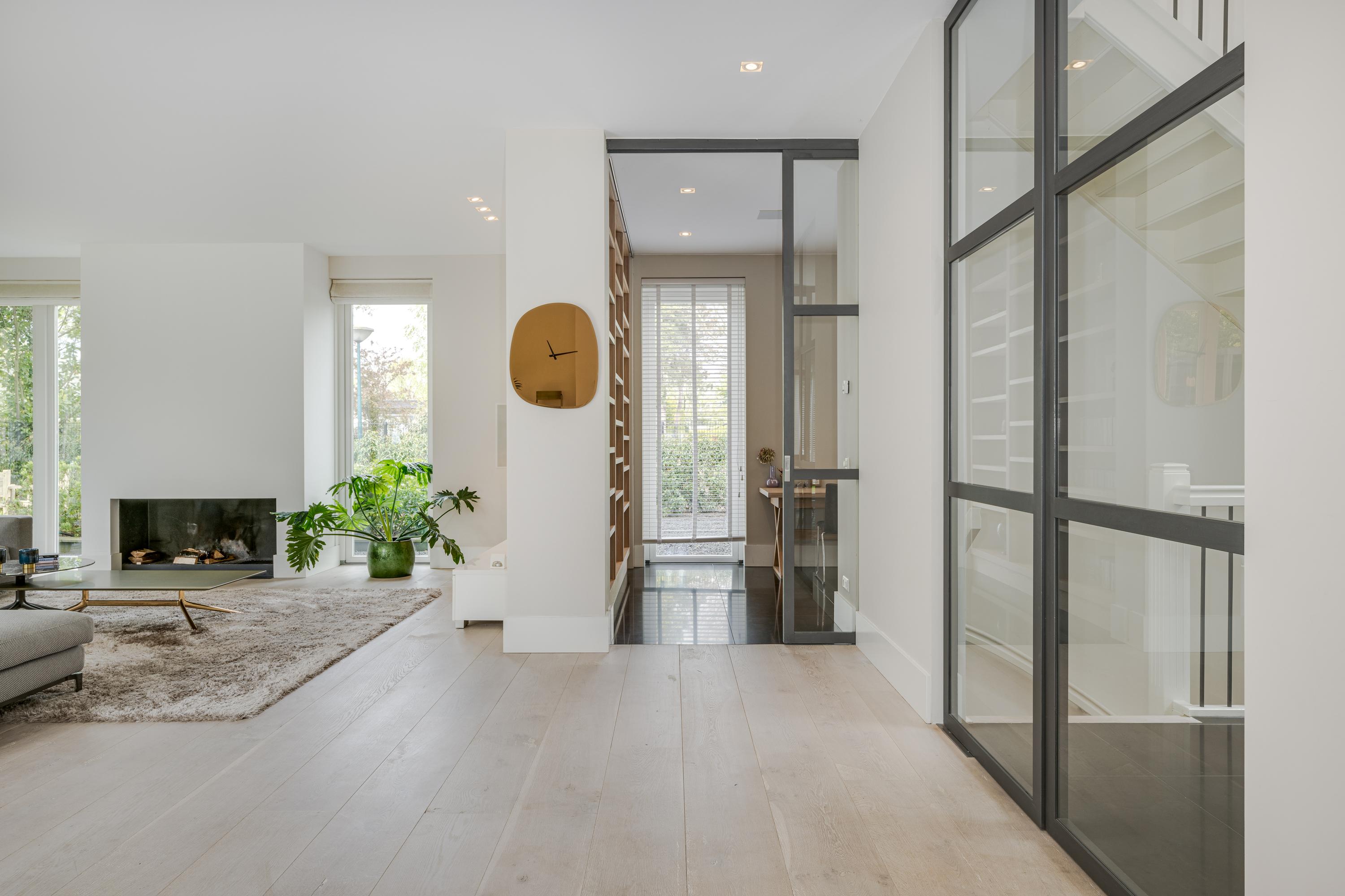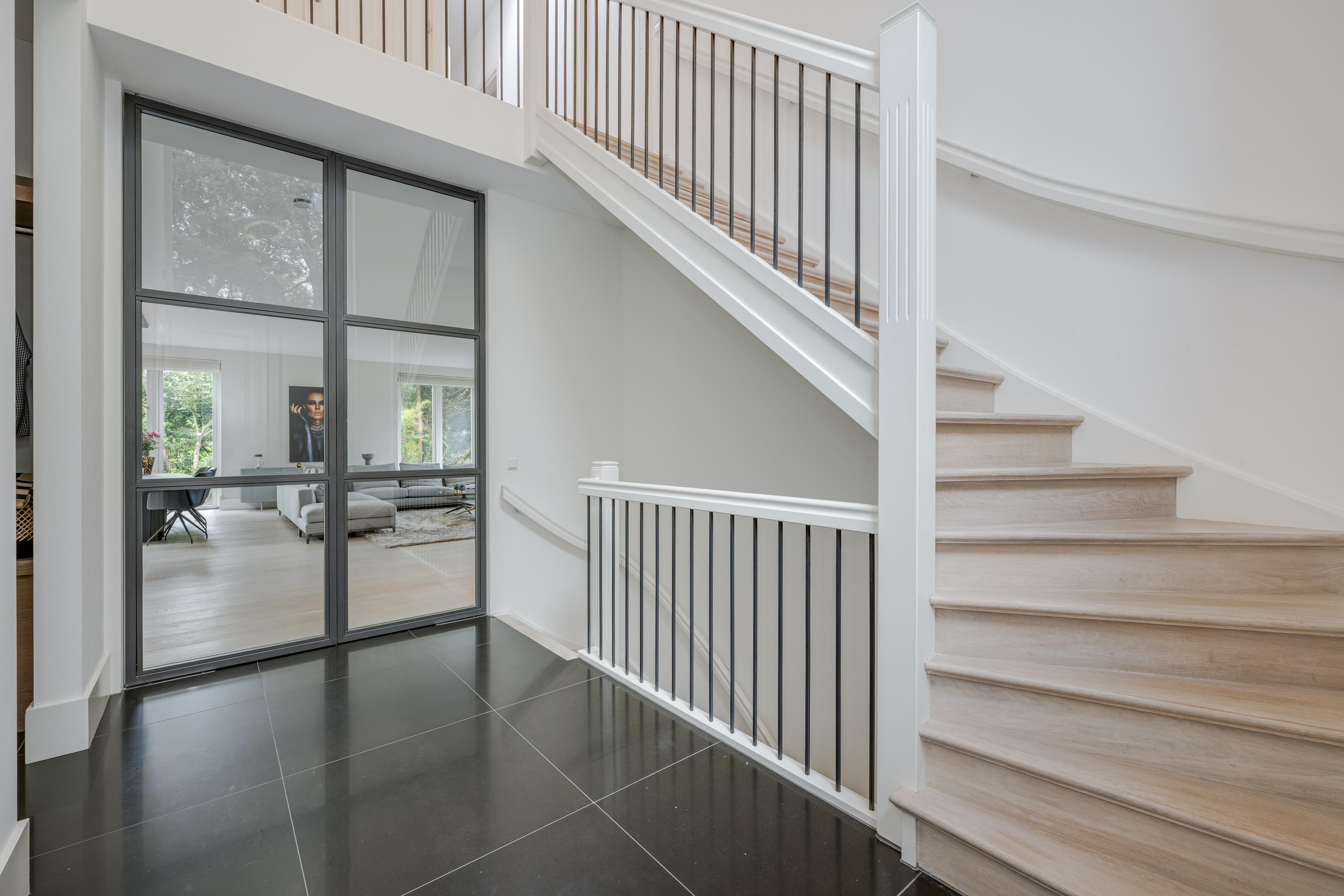 Het bordes met dubbele entreedeur geeft toegang tot de ruime hal waarin centraal het trappenhuis en vide zijn gesitueerd. In de hal vindt u tevens de wc voor de gasten, een ruime garderobe en de meterkast. Ook bevindt zich hier de trap die leidt naar de kelder en de bordestrap naar de bovengelegen verdieping. De dubbele glazen deuren bieden een doorkijk naar de moderne woonkamer.