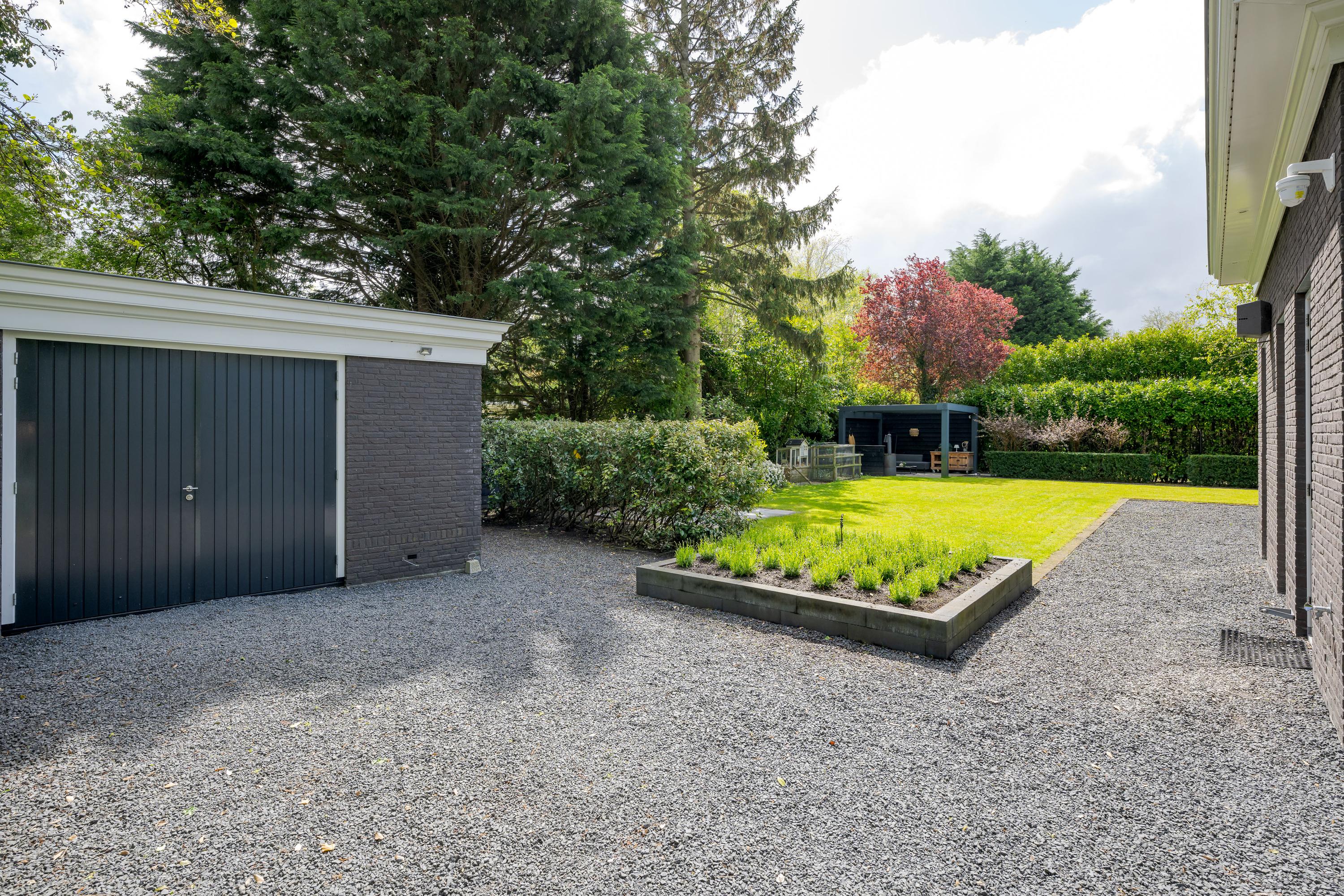De oprit naar de garage toe is bereikbaar middels het elektrische hek en biedt plaats aan meerdere auto's. Achteraan de oprit ligt de garage, welk is voorzien van dubbele openslaande deuren, een venster en een zijdeur. De garage is geschikt voor een auto, alsmede fietsen en tuingereedschap. Achter de garage bevinden zich de afvalcontainers.