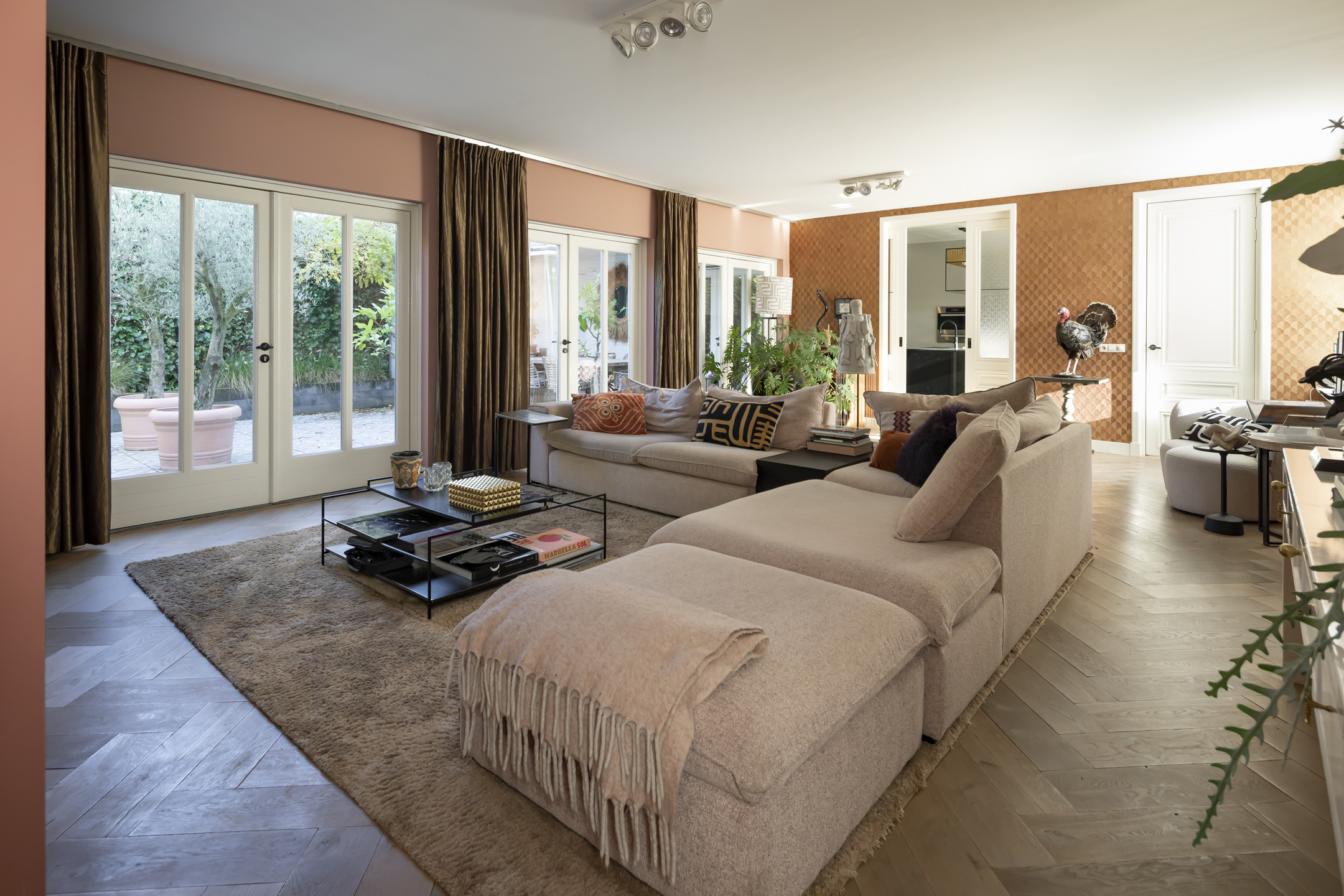 Met de openslaande deuren in de woonkamer naar de patiotuin is er een fijne verbinding met buiten.