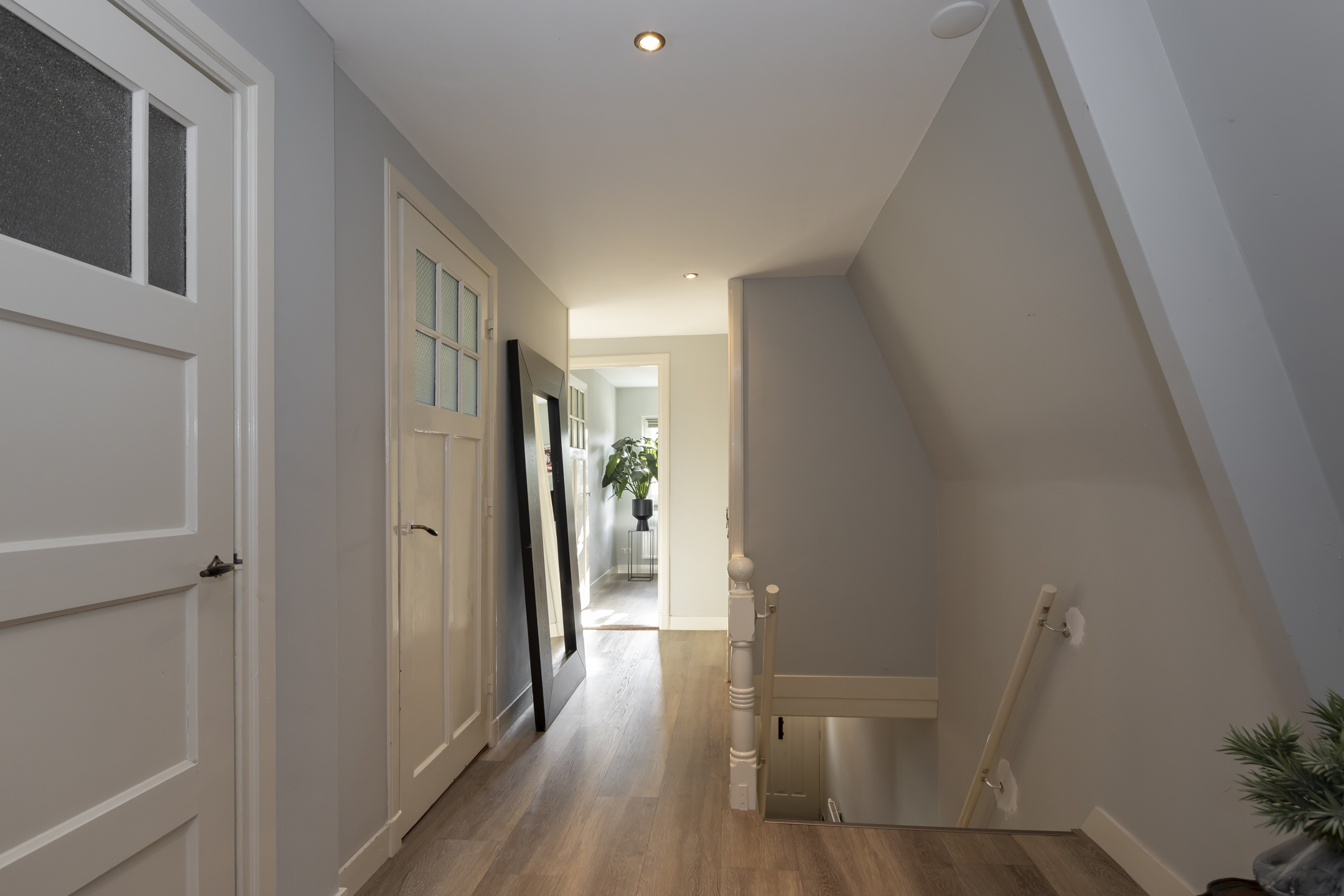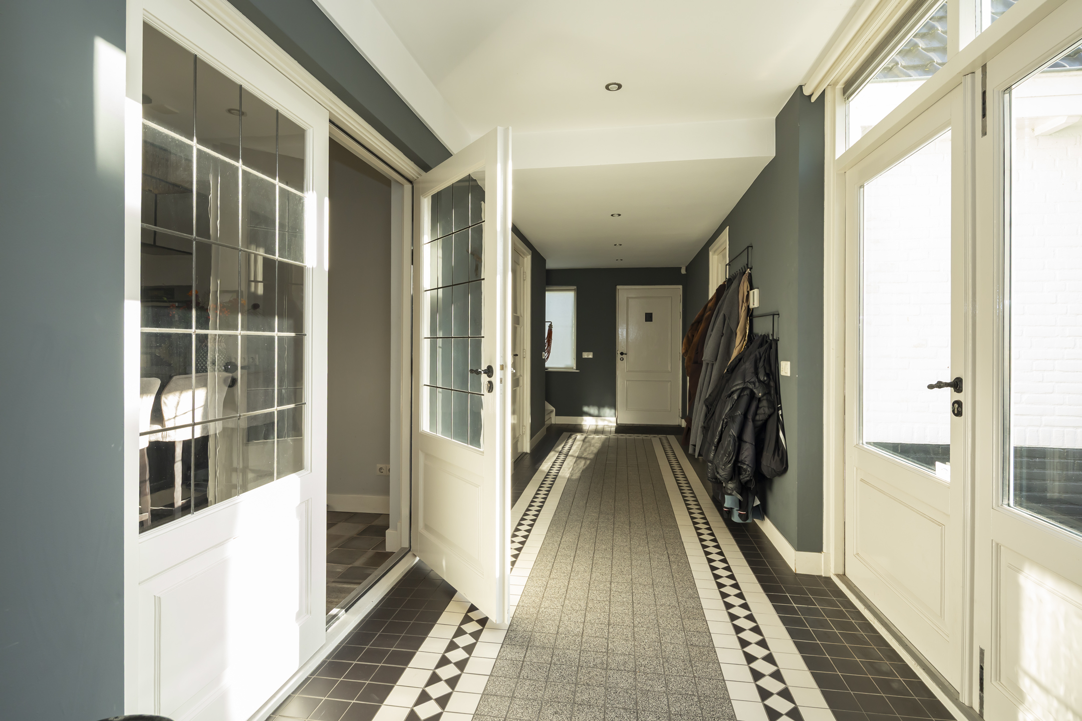 Aangezien het vroeger 2 woonhuizen waren, zijn er in feite 2 voordeuren, 2 entrées en dus 2 hallen met een trapopgang naar de verdieping.