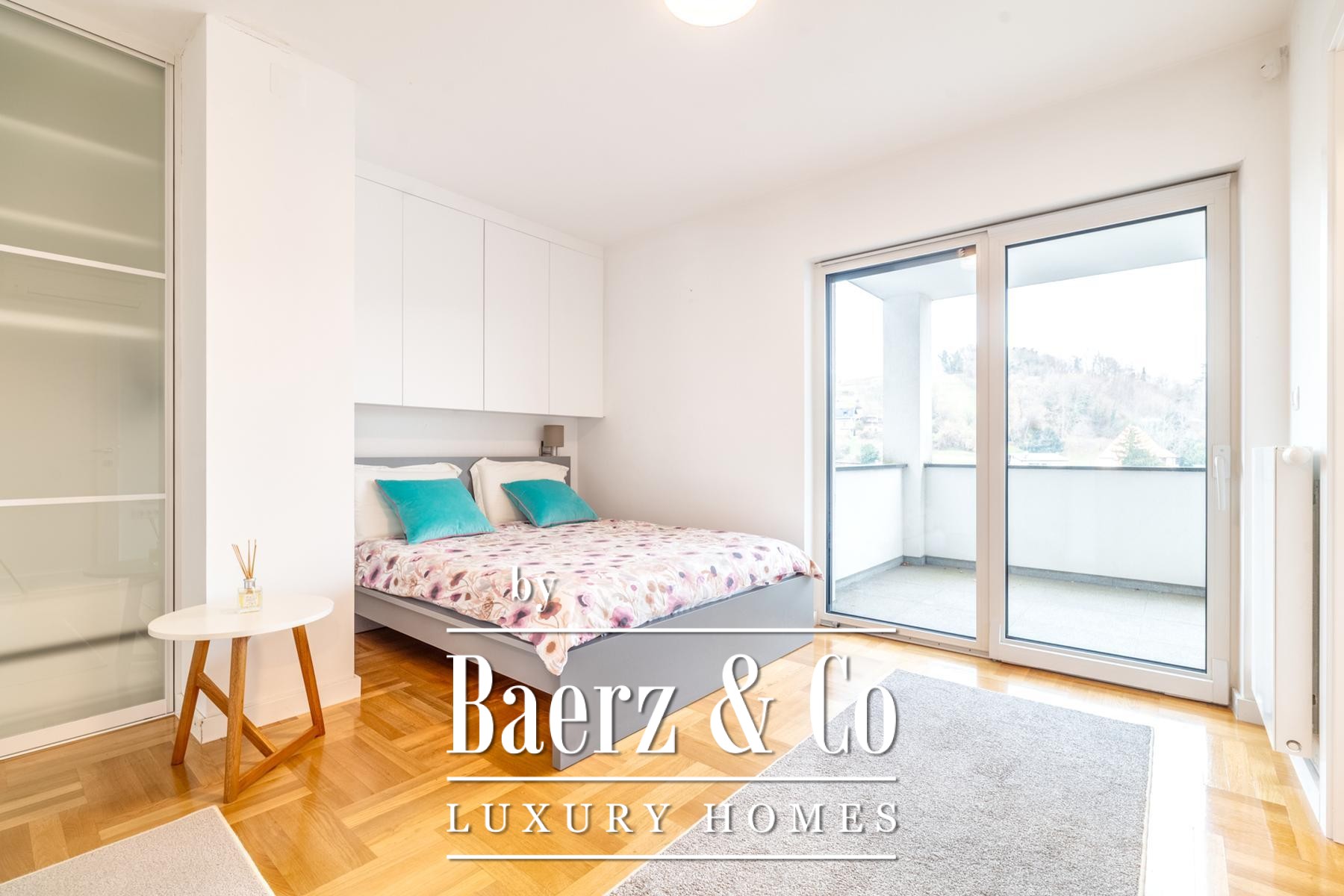 De begane grond herbergt een garage voor twee auto's, een wasruimte, wijnkelder, stookruimte en een binnenzwembad met douche, wat discreet comfort en gebruiksgemak garandeert. Op de verhoogde begane grond bevindt zich de hoofdentree, een royale woon- en eetruimte, een keuken met bijkeuken, gastentoilet en directe toegang tot het terras en de tuin. Eén slaapkamer en een badkamer completeren deze verdieping. De eerste etage biedt drie slaapkamers, elk met toegang tot een eigen terras of balkon, aangevuld met twee badkamers. Op de bovenste verdieping bevinden zich nog twee slaapkamers, een badkamer en terrassen met wijds uitzicht over de Medvednica en de oostelijke skyline.