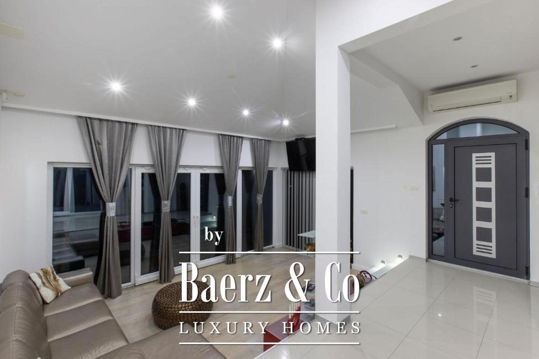 De bovenverdieping biedt een lichte leefruimte met keuken en eetgedeelte, twee slaapkamers en twee badkamers, waarbij elke hoofdruimte toegang biedt tot balkons met uitzicht op zee en zwembad. Flexibiliteit staat centraal, want de eerste verdieping kan worden gescheiden in zelfstandige appartementen om tegemoet te komen aan diverse woonwensen of voor eventuele gastverblijven. Verfijnde afwerkingen en hoogwaardige inrichting kenmerken elk detail, terwijl doordachte voorzieningen zoals een taverne met barbecue, een uitnodigende eet- en ontmoetingsruimte en een zonnige tuin bijdragen aan het wooncomfort. Drie parkeerplaatsen maken het geheel compleet, voor ontspanning en mogelijkheden aan de prachtige Kroatische kust.
