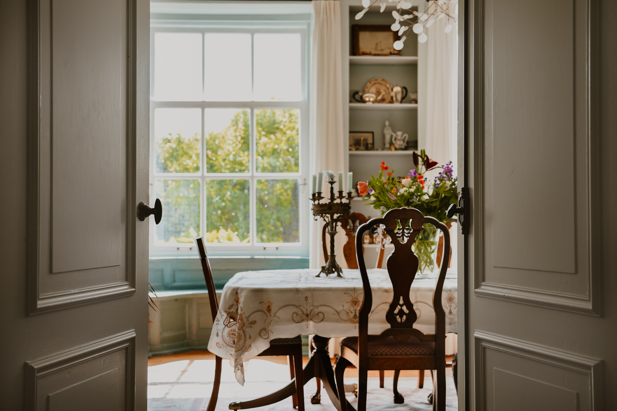 Fraaie dubbele en suite paneeldeuren leiden naar de tuingerichte eetkamer. Deze heeft prachtige zitvensterbanken onder de hoge roederamen, voorzien van authentieke binnenluiken, een inbouwkast en een stucplafond.