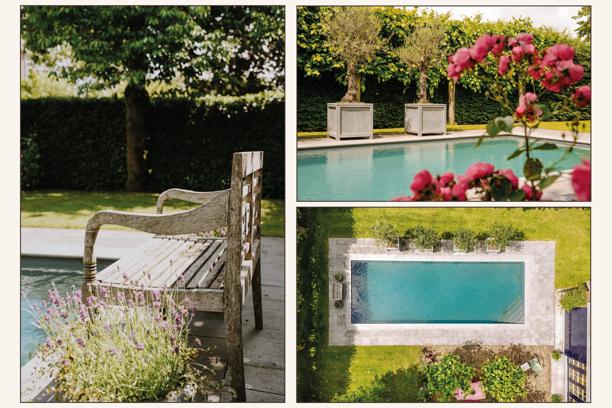 Het verwarmde zwembad van ruim 10 meter lang heeft een fraaie grijze liner, solardeck en een volautomatische regeling. Bij het zwembad is het heerlijk toeven op het grote zonneterras dat omgeven is door grote dakplatanen voor natuurlijke schaduwplekken. In de tuin staat een keur aan fruitbomen, waaronder diverse appelrassen, peren, pruimen, kersen, kweeperen en walnoten. Vanaf één van de terrassen leidt een rozenberceau naar de achteruitgang.