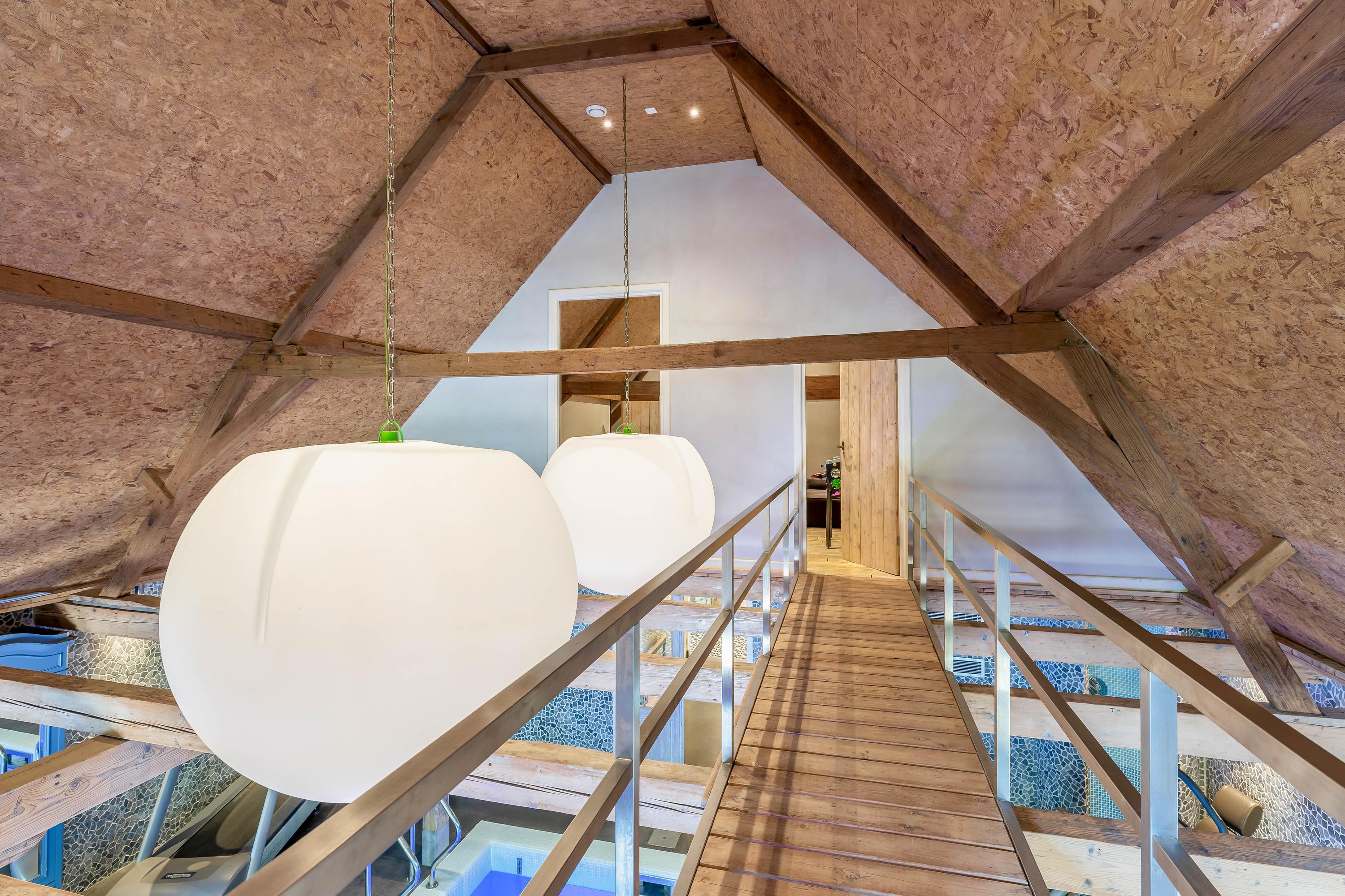 De absolute blikvanger is de wellnessruimte in de voormalige stal. Hier is een luxe binnenzwembad gerealiseerd met automatisch roldek, grote jacuzzi, fitnessruimte en voorbereidingen voor een sauna – alles omgeven door originele stalramen en robuuste houten spanten.