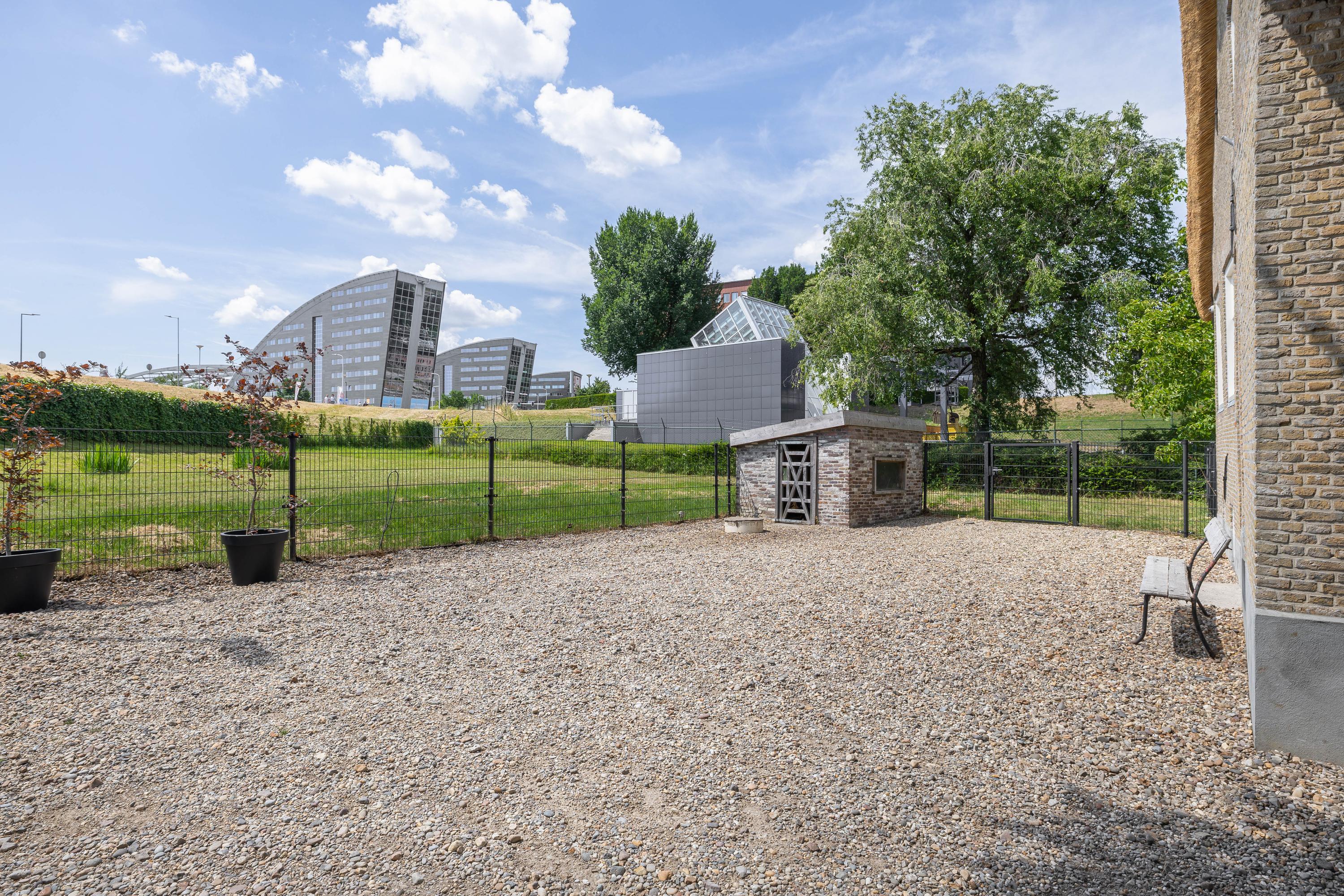 Het erf is voorzien van een royale garage/schuur van ruim 80m², een ruime kas, waar het ook op koelere dagen heerlijk vertoeven is, en een sfeervolle overkapping direct grenzend aan de keuken. Voor paardenliefhebbers zijn er drie paardenboxen aanwezig, in het verleden is er een gedraineerde all-weather rijbak en uitloopbak aangelegd. Het geheel is stijlvol afgezet met een dubbelspaaks hekwerk en toegankelijk via een automatische toegangspoort.