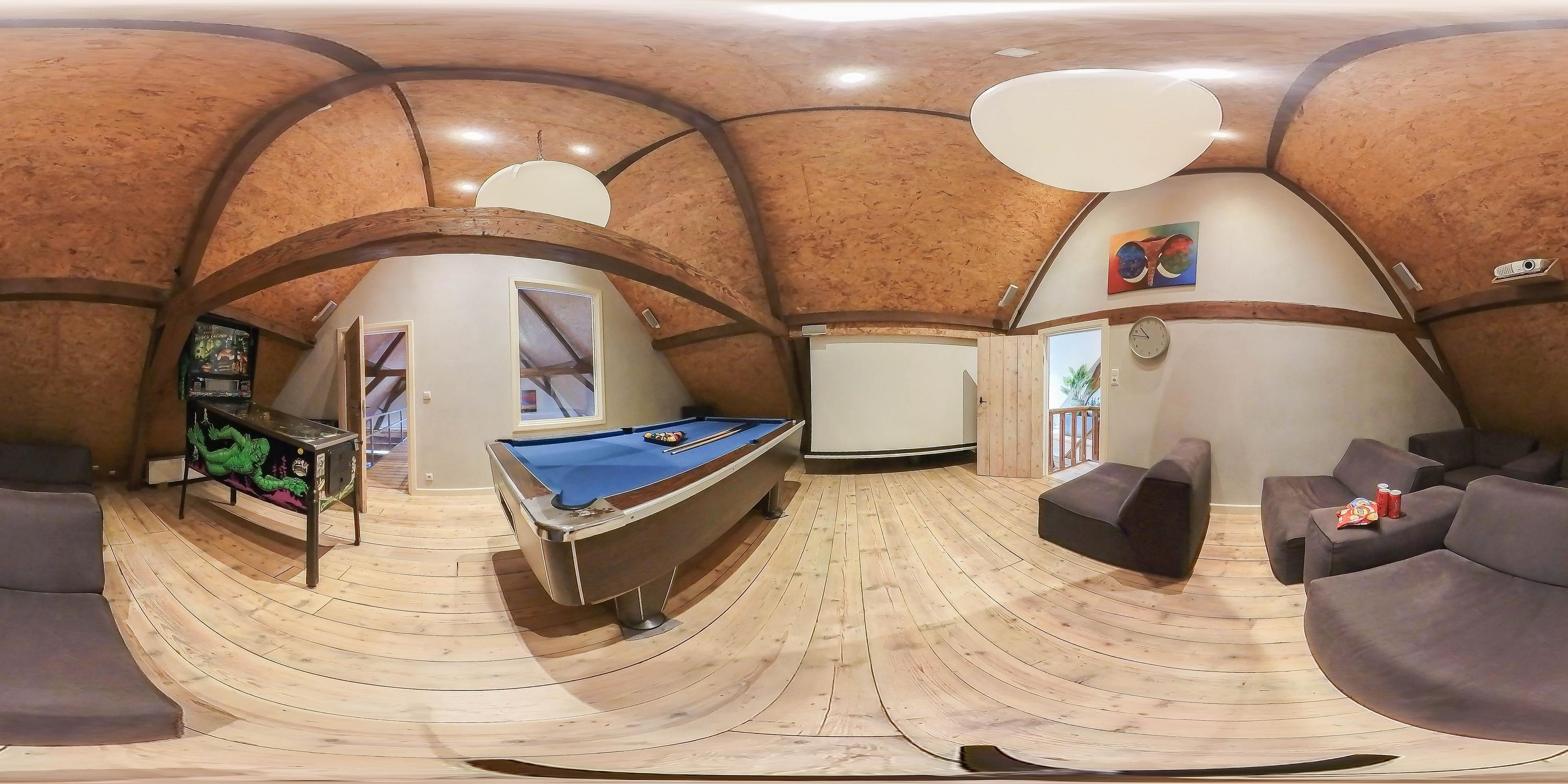 Een bijzondere toevoeging is de amusementsruimte op de verdieping met biljart en bioscoopopstelling, die ook eenvoudig kan worden ingezet als extra slaapkamer of gastenverblijf.
