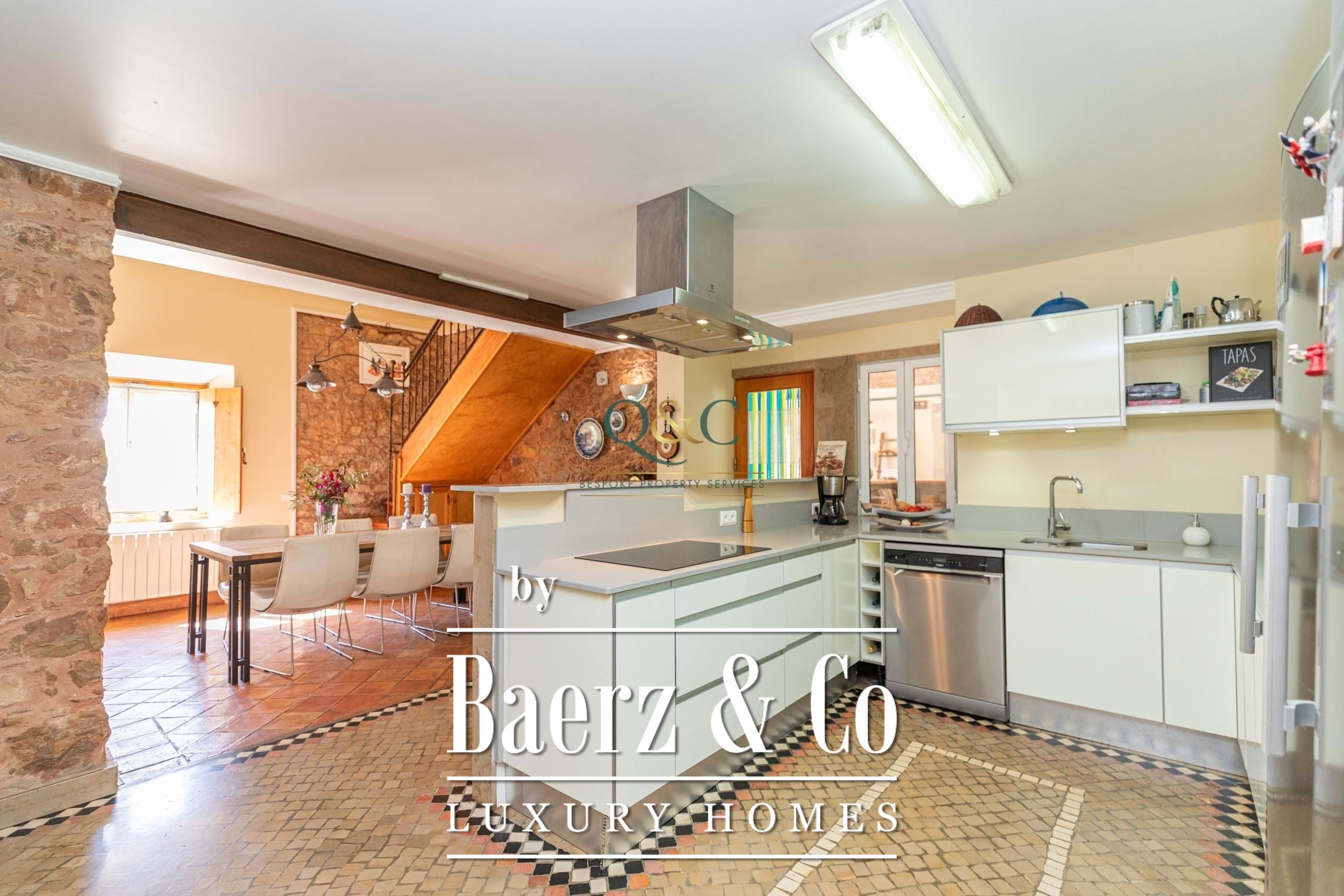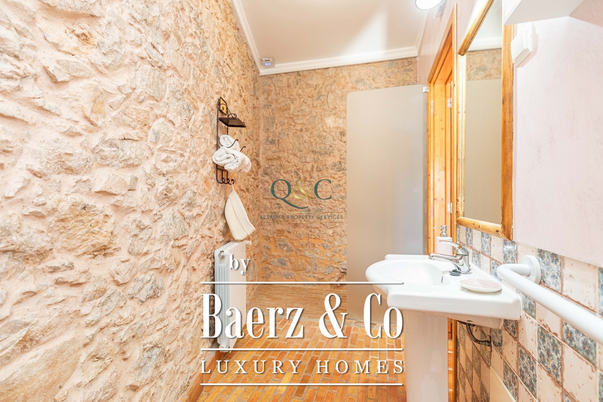 The right wing offers another equipped kitchen, dining room and living room with a cosy fireplace, three additional bedrooms, three bathrooms and plenty of storage space. The high ceilings with natural stone details create an inviting space.