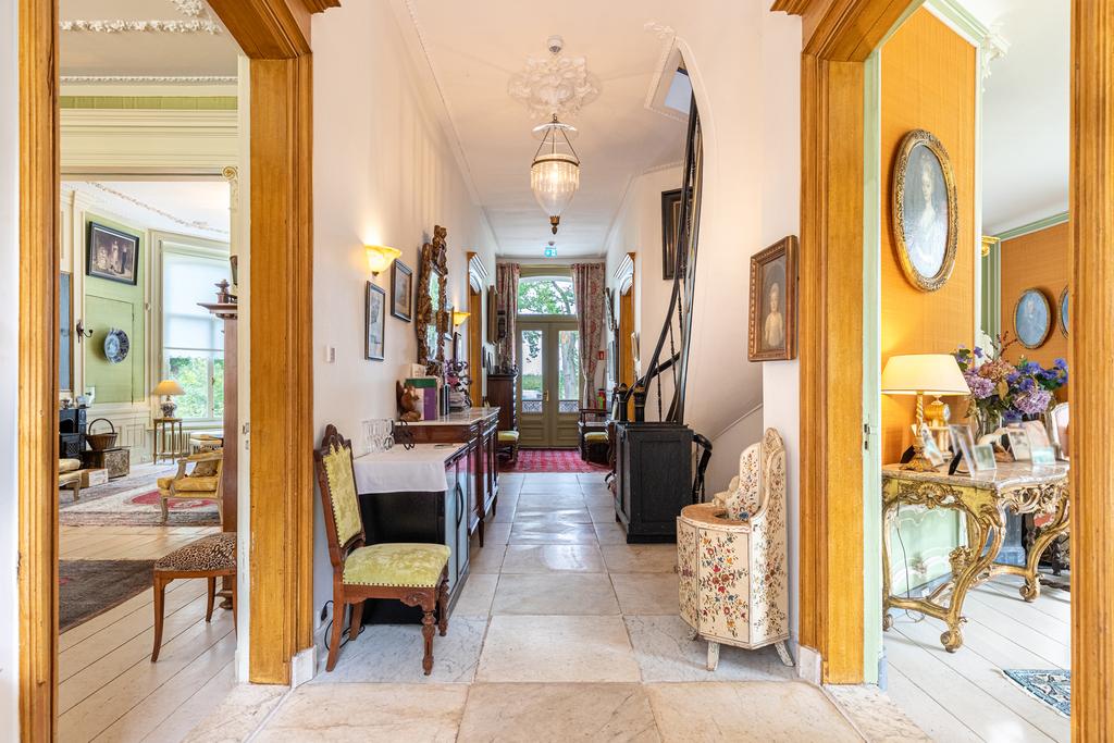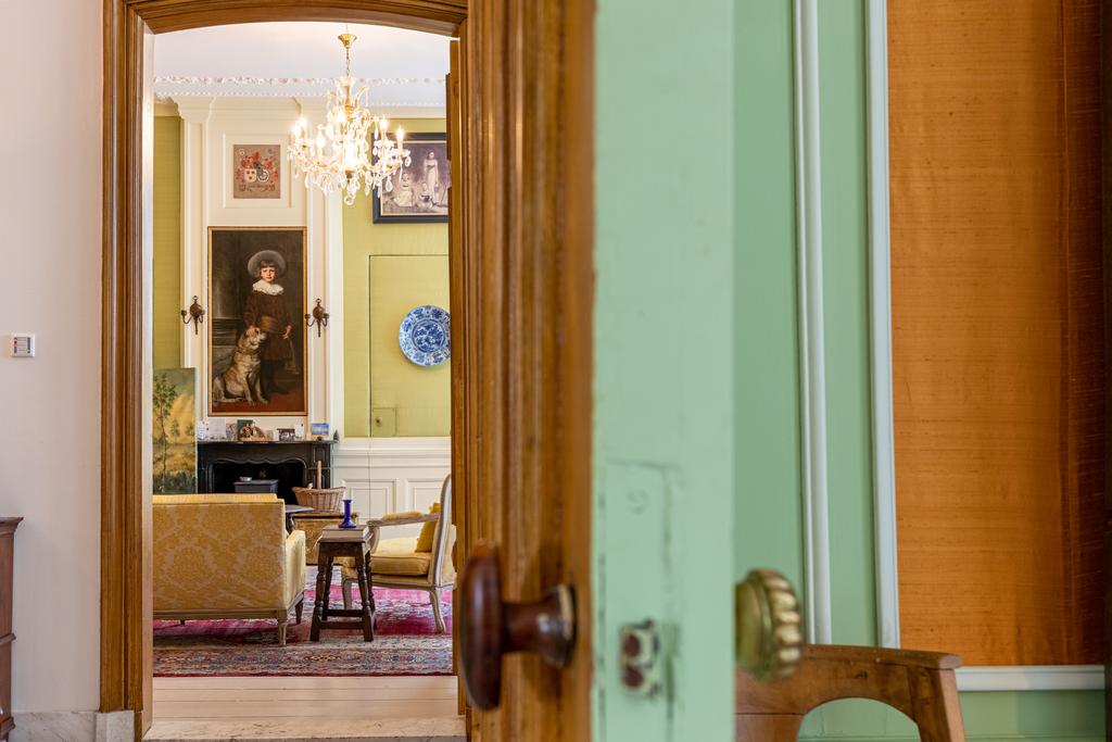 Aan de rechterzijde de salon en-suite en de fabelachtig mooie eetkamer. De wandbespanning in een fonkelend lindegroen is hier ook weer een prachtige blikvanger en een fraai décor voor de collectie erfstukken. Het kan prima zijn dat zelfs de verjaardag van de hond aanleiding genoeg vormt voor een uitgebreid diner met vrienden en familie, want deze ruimte vraagt om gezelligheid en samenzijn. In de hoek bevindt zich een ingebouwd kabinetje voor het pronkservies. Beide ruimtes hebben fraaie haardpartijen; de haard in de eetzaal stamt uit 1871, en wordt bekroond door een haardstuk aangebracht in 1931. Dit is het kinderportret van jonkheer Mr W.J.M., de grootvader van de huidige eigenaar.