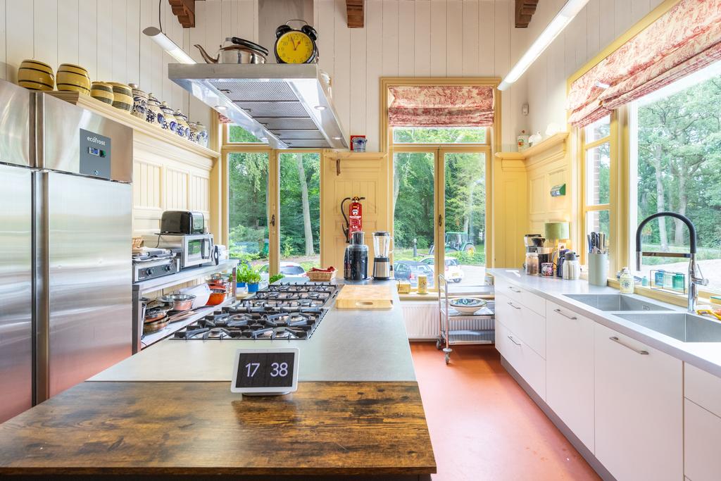 Twee deuren vanuit de salon en eetkamer, leiden naar de voormalige biljartkamer, thans de keuken: deze is geheel Gastronorm ingericht, met RVS werkbladen, een kookeiland met 10 gastpitten, horeca-afzuigkap en twee grote ijskasten. De onderbouwkasten hebben frisse matwitte fronten en bieden meer dan genoeg bergruimte. Twee grote spoelbakken met een flexibele kraan (Quooker). Het prachtige houtwerk in Bentheimer Geel en de Toile-de-Jouy valletjes geven de afkomst van deze keuken aan, dat daar geen misverstanden over bestaan; er kan hier weliswaar hard worden gewerkt, maar altijd in stijl en van grote klasse. In de hal, aan de achterzijde rechts, de WC, en in het midden het trappenhuis.