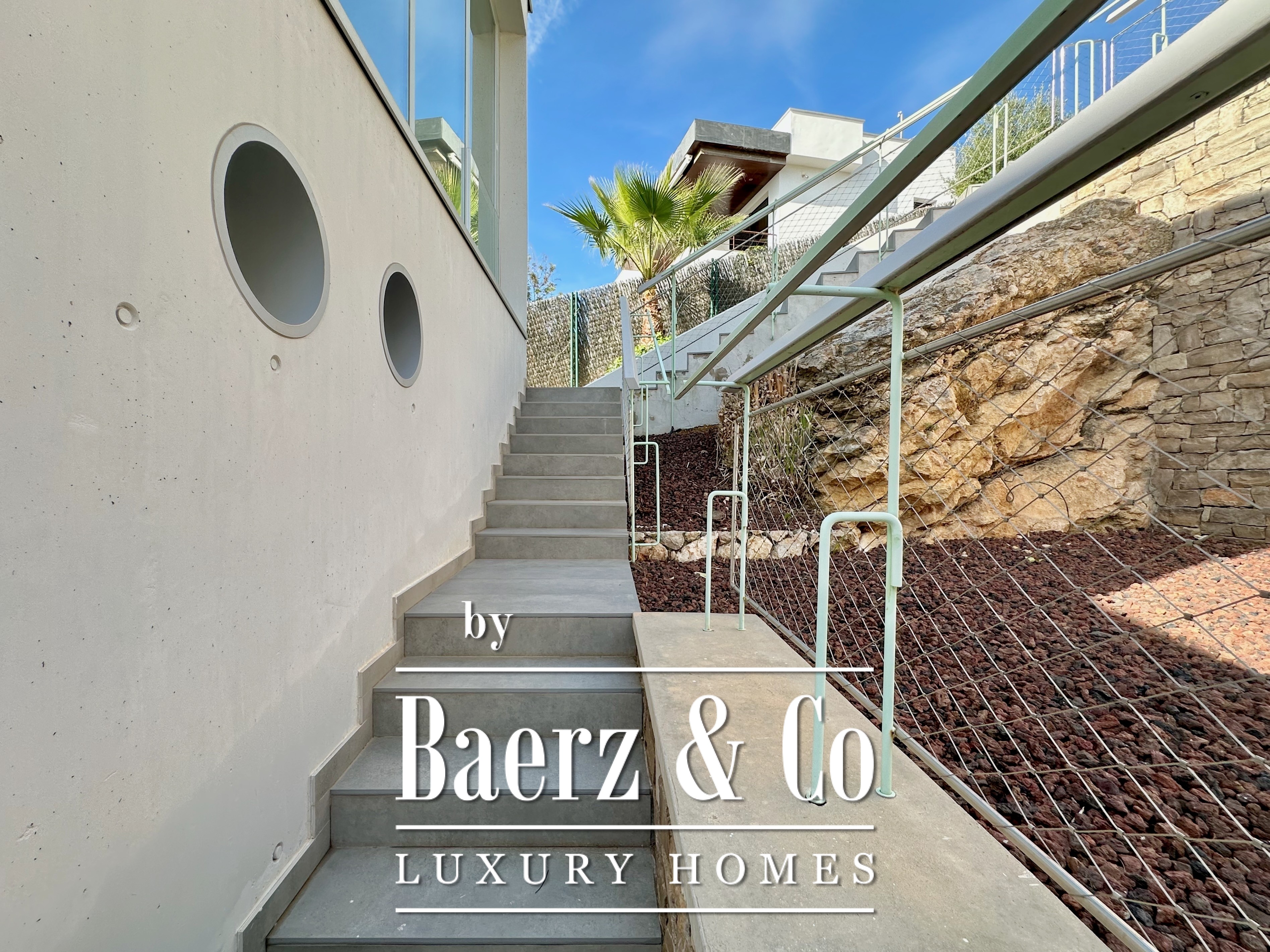 Boven de leefruimte leidt een zwevende loopbrug naar drie tweepersoonsslaapkamers, waarvan twee met eigen badkamer. Elke kamer grenst aan een terras gefilterd door metalen lamellen, wat openheid en privacy in balans brengt. Deze eigentijdse villa te koop in Sitges combineert architectonische precisie met een exclusieve kustbeleving.