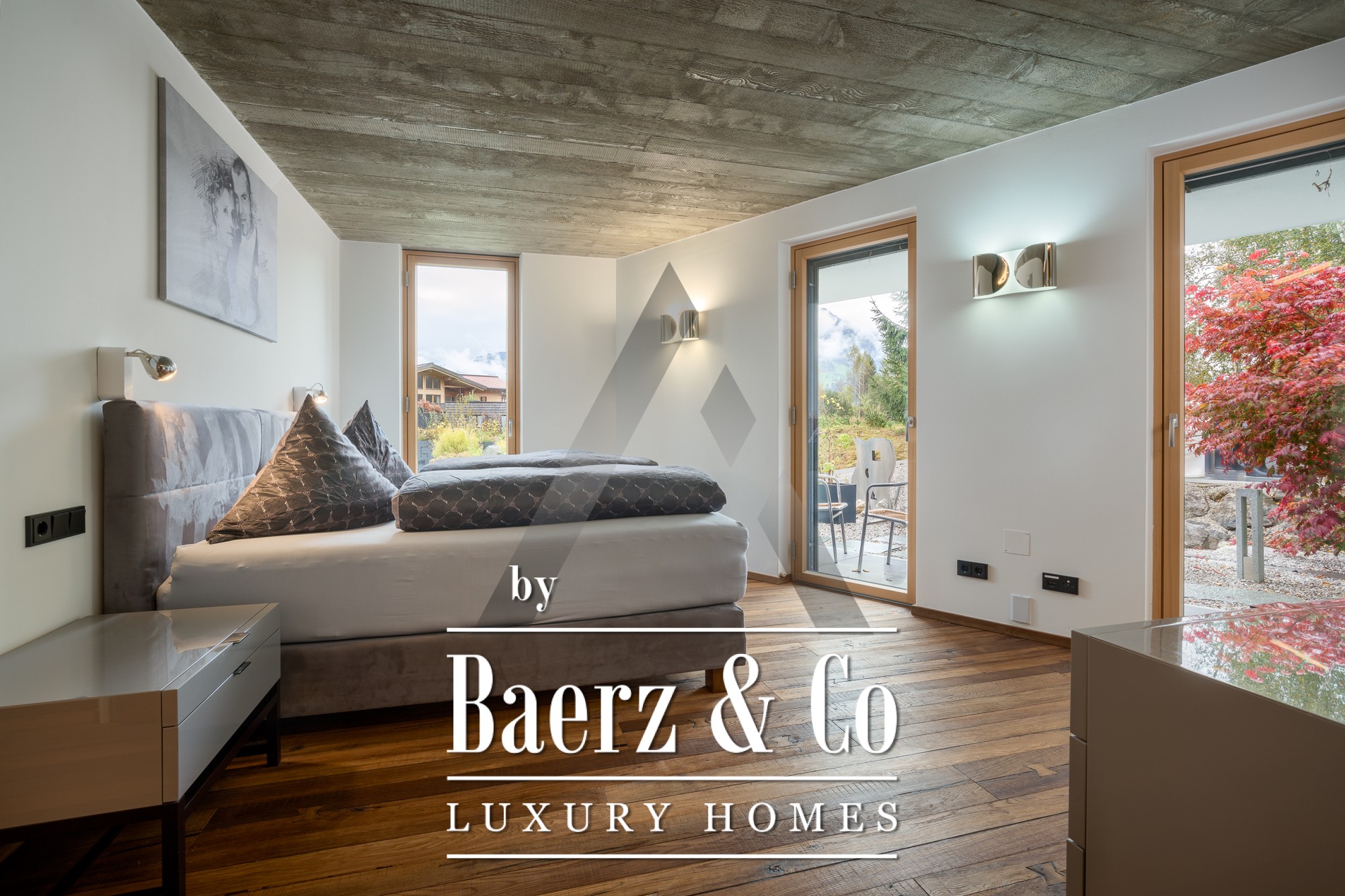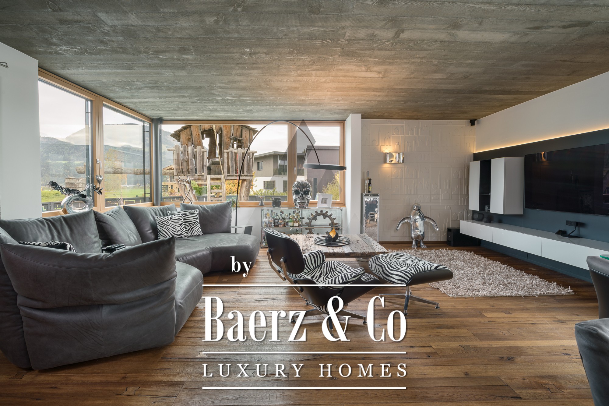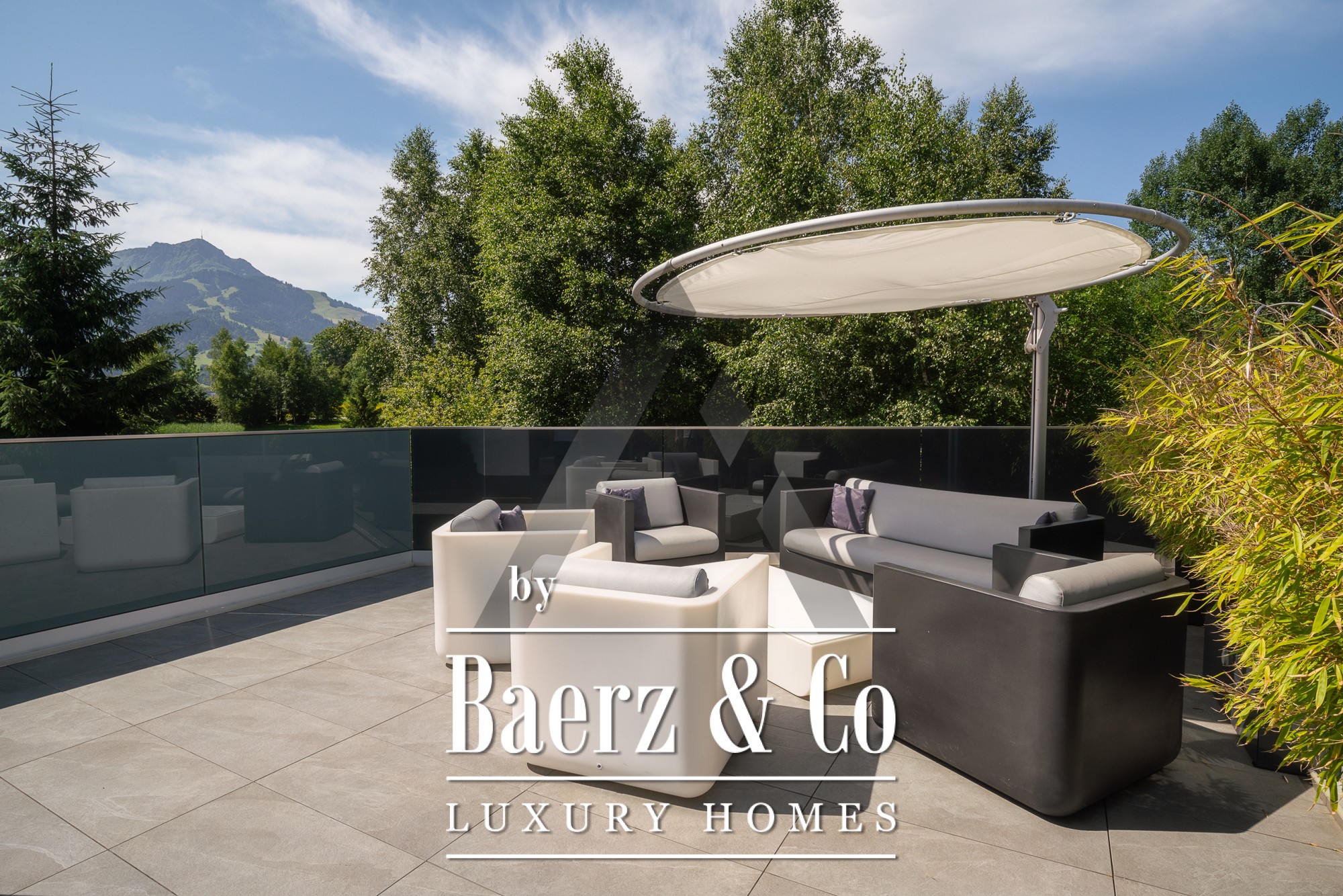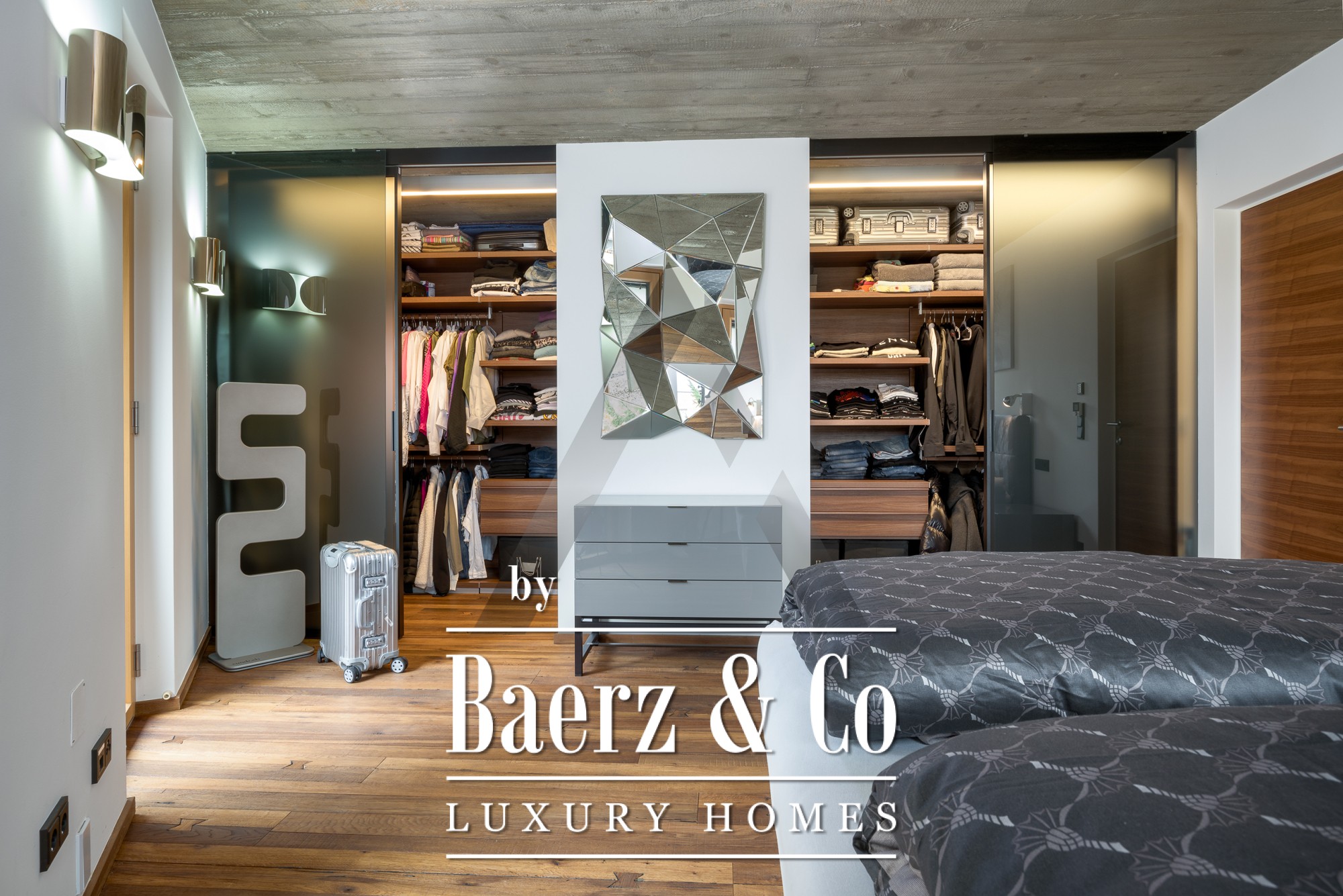 Binnen zorgen zichtbetonnen plafonds en gerecyclede eiken vloeren voor een subtiele verfijning. De open begane grond vormt het kloppend hart van de woning; panoramavensters vullen de woonkamer, eetkamer en de designkeuken van Miele met natuurlijk licht. Op de begane grond bevindt zich een mastersuite met dressing, een kinderkamer, ruime badkamers en praktische opbergruimte. Boven is een apart appartement met twee slaapkamers, een leefruimte met open haard en een dakterras met indrukwekkend bergzicht. Daarnaast is er op de verdieping een volledig geklimatiseerde fitnessruimte van 18 m² met toegang tot een eigen terras.