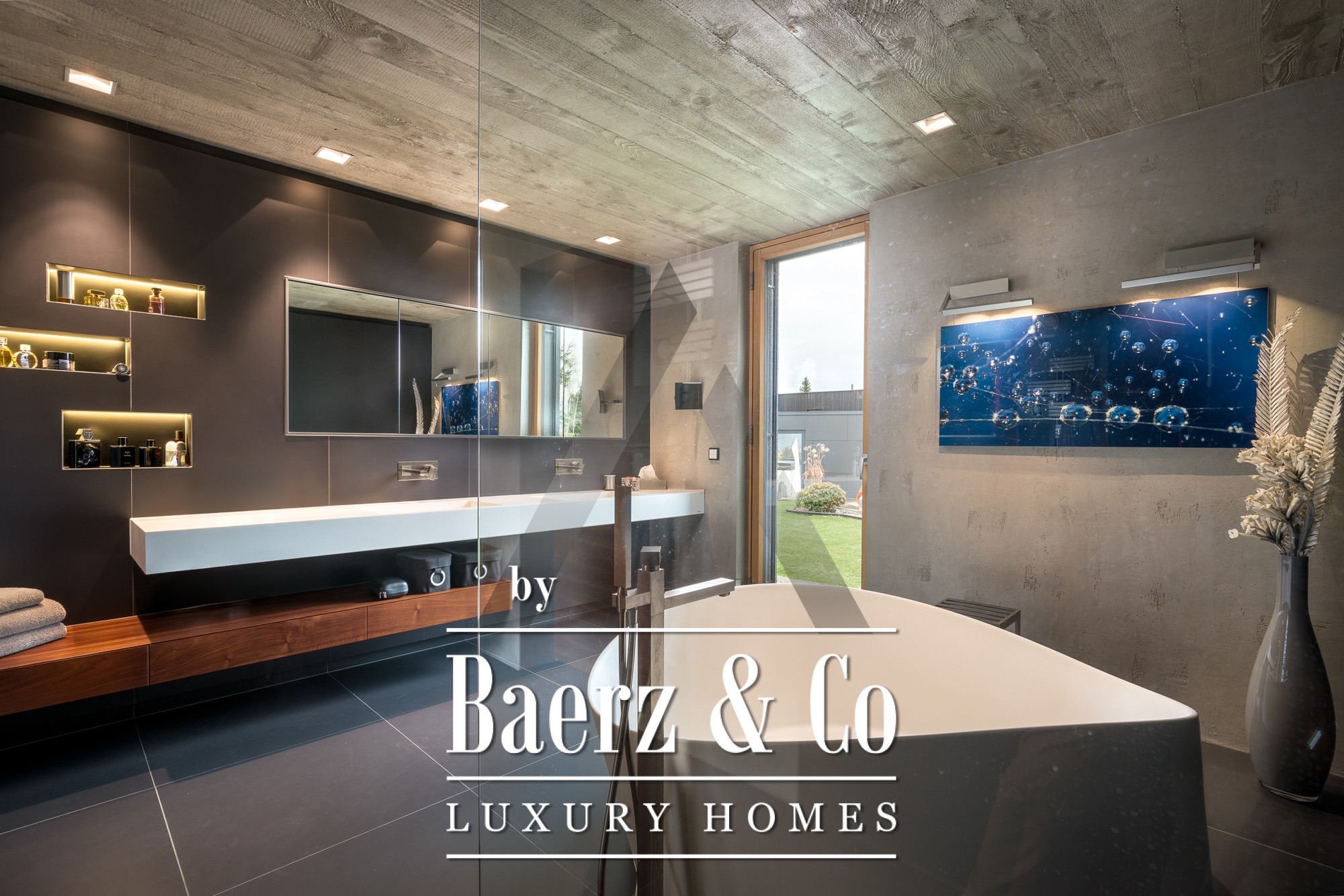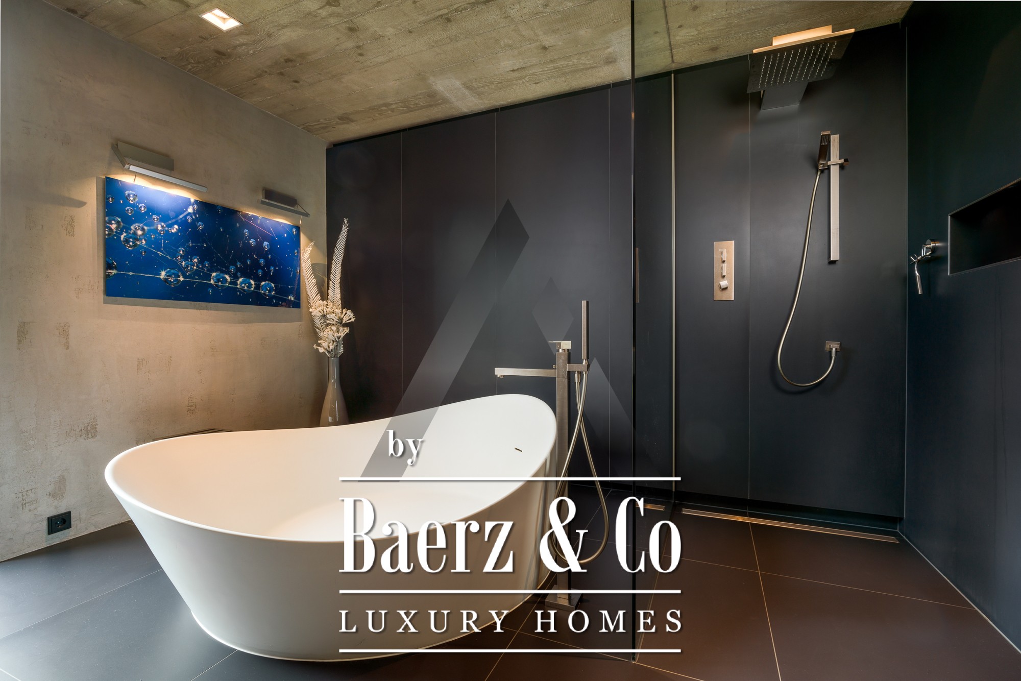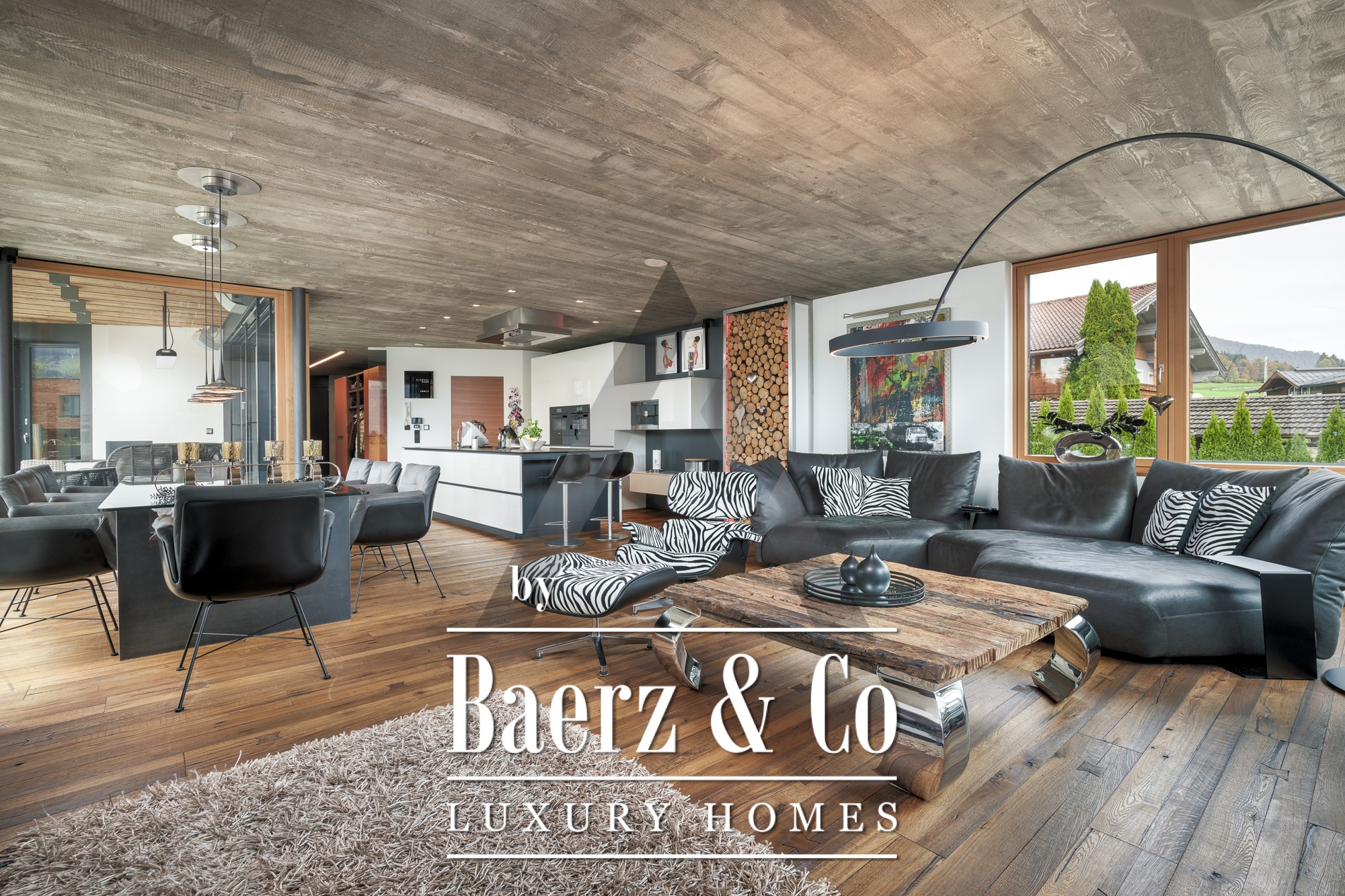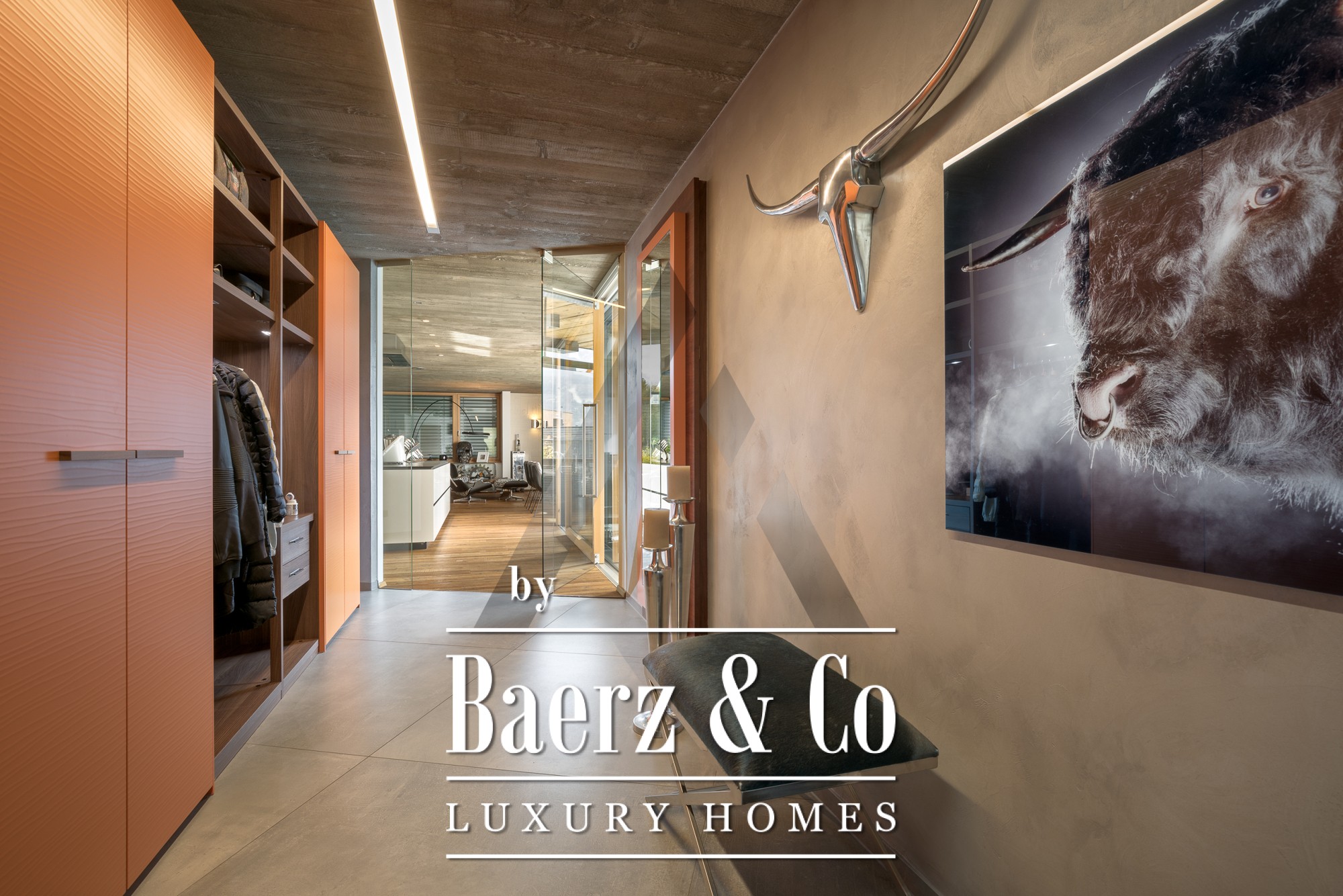 Binnen zorgen zichtbetonnen plafonds en gerecyclede eiken vloeren voor een subtiele verfijning. De open begane grond vormt het kloppend hart van de woning; panoramavensters vullen de woonkamer, eetkamer en de designkeuken van Miele met natuurlijk licht. Op de begane grond bevindt zich een mastersuite met dressing, een kinderkamer, ruime badkamers en praktische opbergruimte. Boven is een apart appartement met twee slaapkamers, een leefruimte met open haard en een dakterras met indrukwekkend bergzicht. Daarnaast is er op de verdieping een volledig geklimatiseerde fitnessruimte van 18 m² met toegang tot een eigen terras.