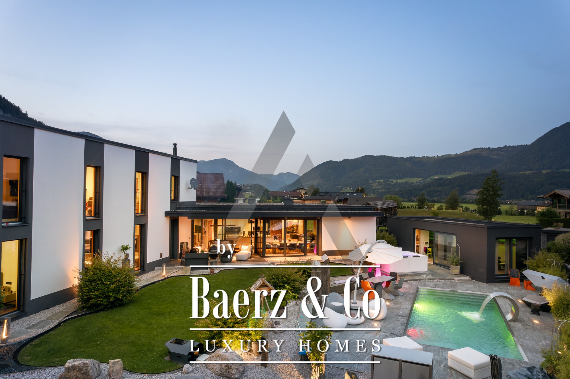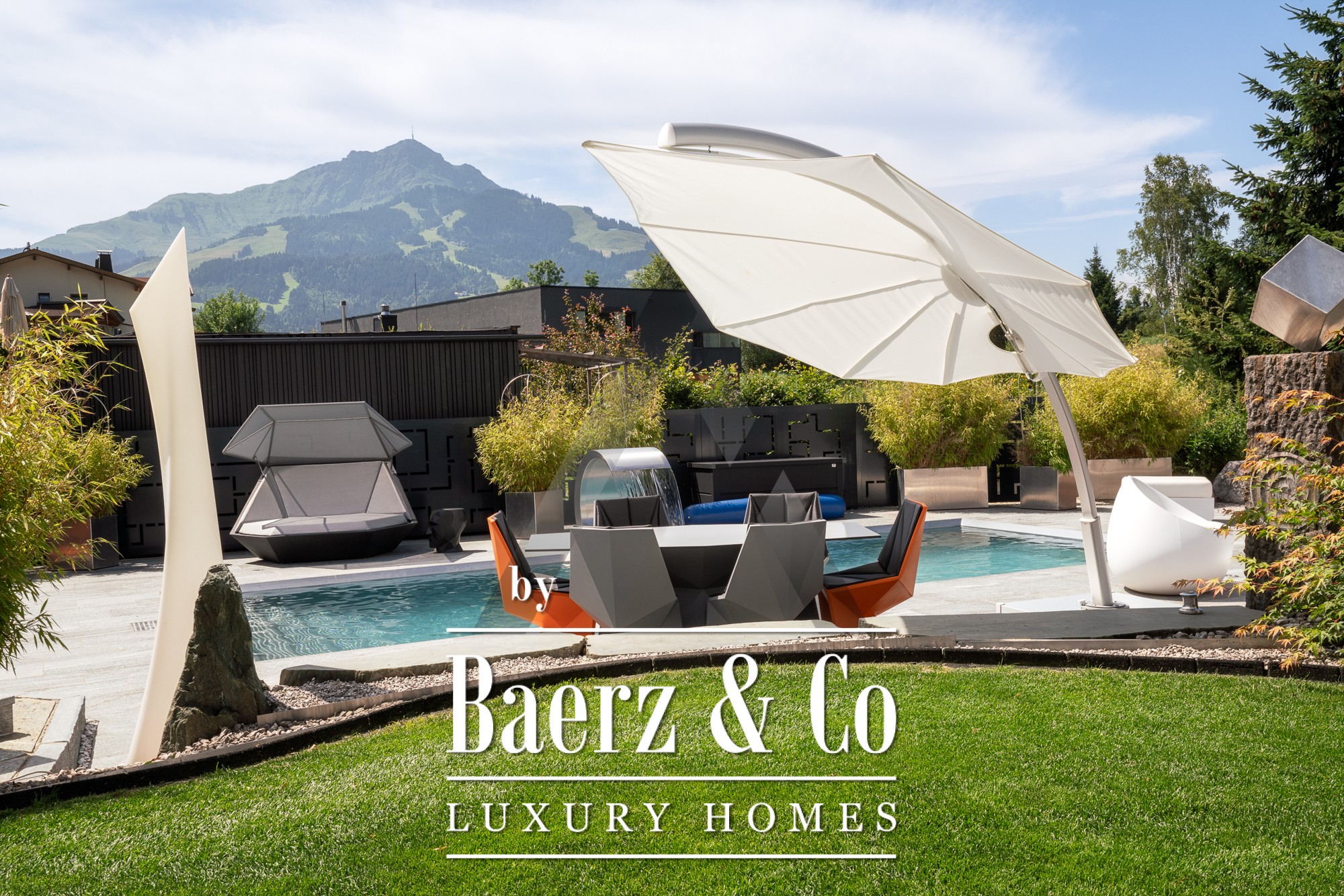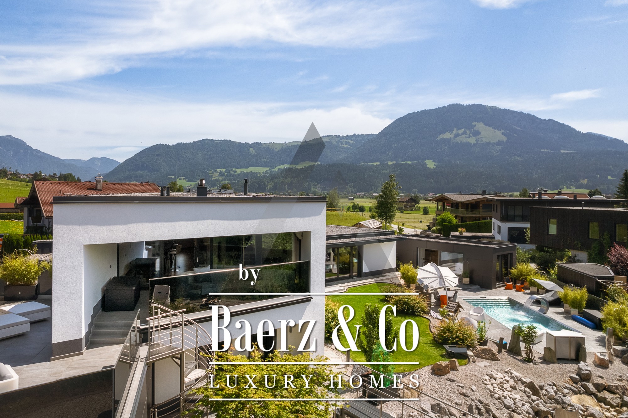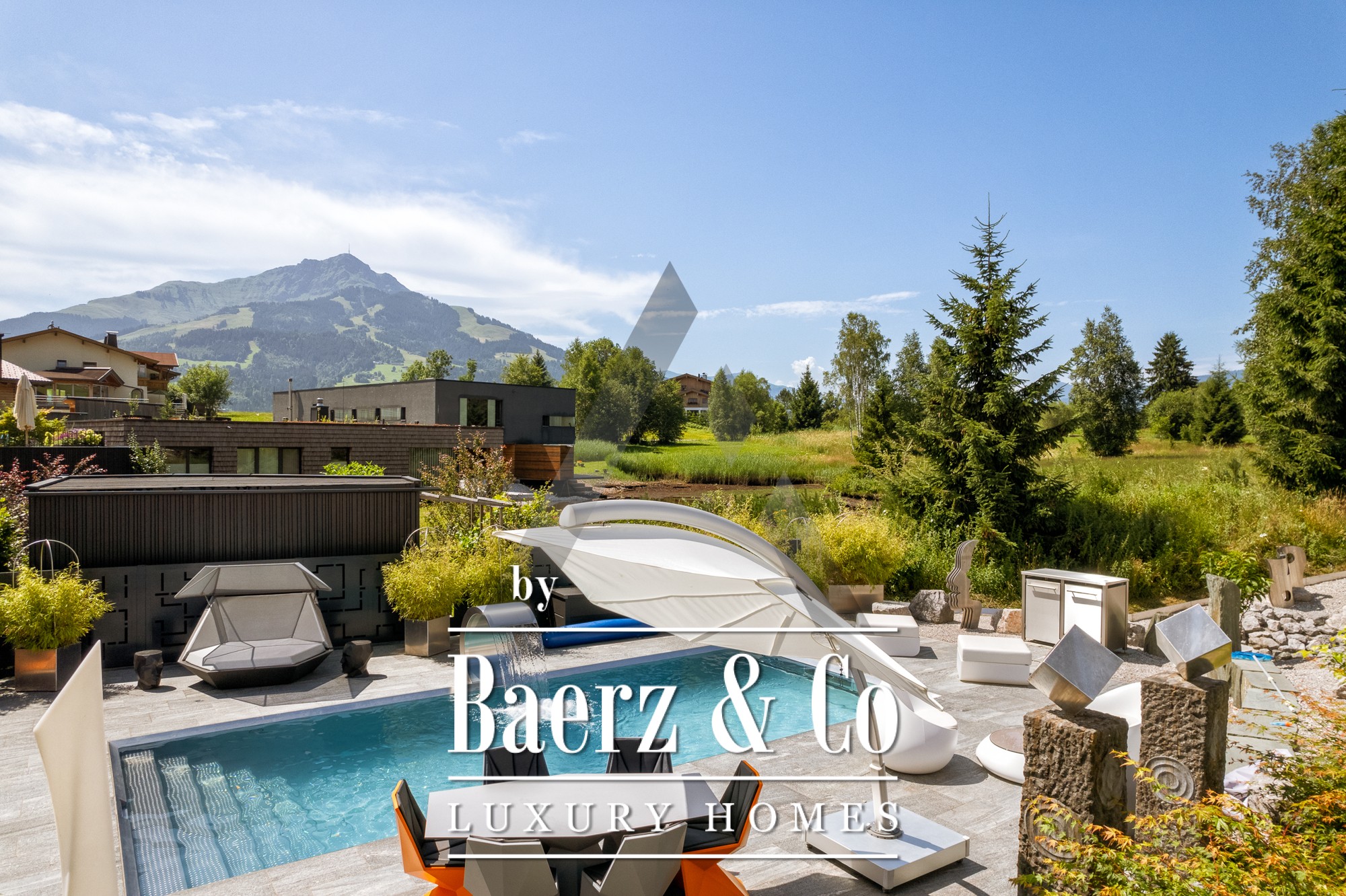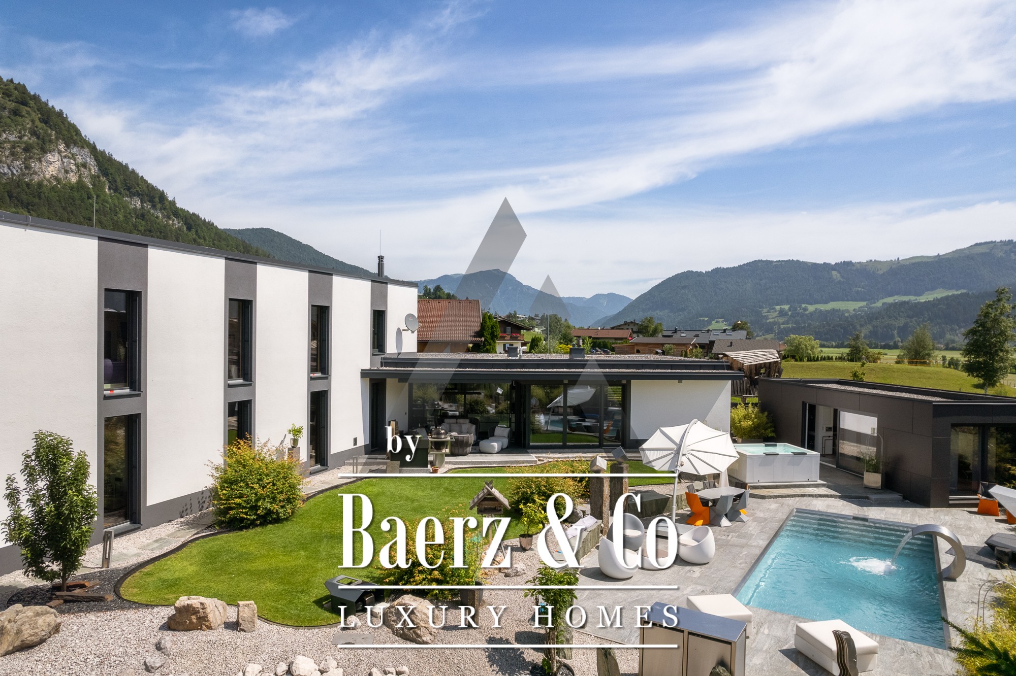 Vrijstaande woning St. Johann in Tirol is gelegen op een rustige, zonnige locatie met een weids uitzicht op de Kitzbüheler Horn en de Wilder Kaiser. Deze eigentijdse villa biedt 418 m² woonoppervlak op een perceel van 1.186 m² en belichaamt het verfijnde alpine leven. De idyllische tuin beschikt over een vijver, aangelegde beekjes, royale terrassen en een panoramisch berglandschap. Buiten geniet u van een roestvrijstalen zwembad, een Treesse designer whirlpool en een sauna, ideaal voor ontspannen ochtenden en verkwikkende middagen.
