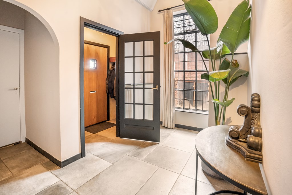 U komt binnen via de overdekte entree. De vestibule met garderobe leidt naar een royale hal met vide en bordestrap. Er worden charmante originele details gevonden, zoals het hoge glas-in-loodraam. In 2018 is het toilet gemoderniseerd. Ook bereikt u vanuit de hal de provisiekelder/wijnkelder van ca. 13 m², waar ook de aansluitingen zijn voor de wasmachine en droger.
