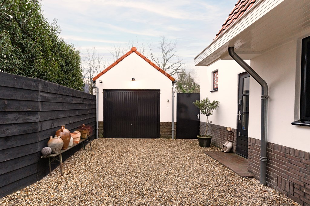 Er is een vrijstaande stenen berging van ca. 16 m² met elektra. Naast de woning ligt een brede, diepe oprit voor meerdere auto's.