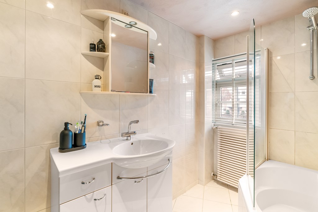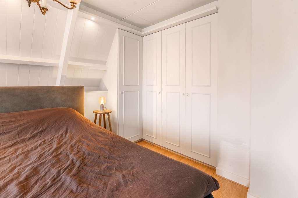 De bordestrap brengt u naar een sfeervolle verdieping met vide en glas-in-lood. Er zijn drie volwaardige slaapkamers van ca. 17 m², 14,5 m² en 7 m². De slaapkamer aan de achterzijde geeft toegang tot het grote zonnige balkon van ca. 15 m². Ook vaste kastruimte ontbreekt niet op de eerste verdieping. De comfortabele badkamer van ca. 5 m² is uitgevoerd in lichte kleurstelling. Deze beschikt over een ligbad met douchefunctie, een hangend toilet en een wastafelmeubel met spiegelkast. Het plafond is voorzien van inbouwspots.