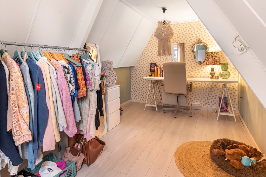 Op deze verdieping bevindt zich de vierde slaapkamer van ca. 7,3 m². De mogelijkheid bestaat om hier een vijfde kamer te realiseren. Achter de knieschotten zit verrassend veel bergruimte. Op deze verdieping én in de ouderslaapkamer op de eerste verdieping is een wastafel-aansluiting aanwezig.