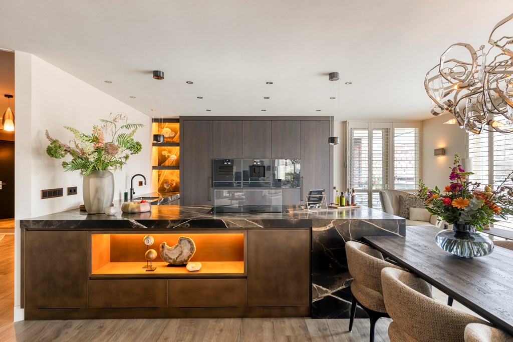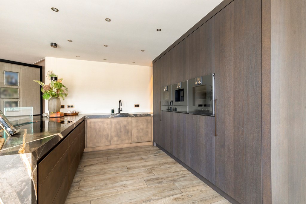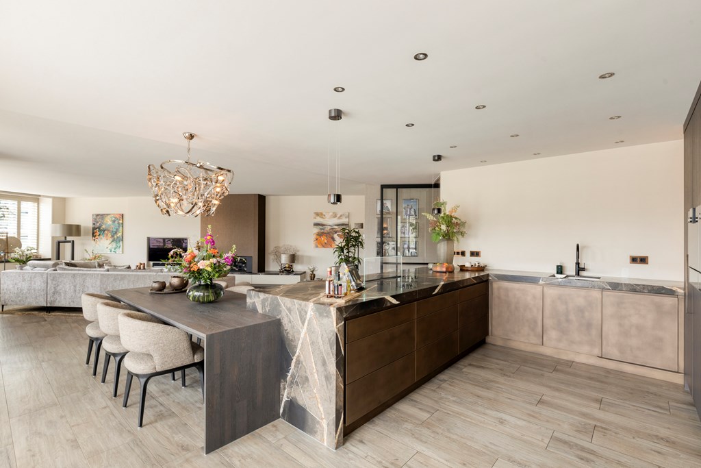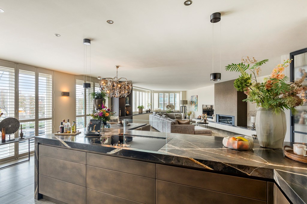 De luxe keuken vormt een waar pronkstuk. Het royale kookeiland nodigt uit tot lange diners en gezellige momenten, terwijl de hoogwaardige inbouwapparatuur van onder andere Gaggenau, waaronder een combi-oven, stoomoven, koffiemachine, inductiekookplaat met downdraft afzuiging, Quooker, vaatwasser, koelkast en vriezer, garant staat voor optimaal kookcomfort. Aansluitend bevindt zich de luxueuze eettafel, perfect gepositioneerd in het daglicht.