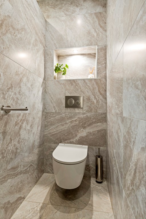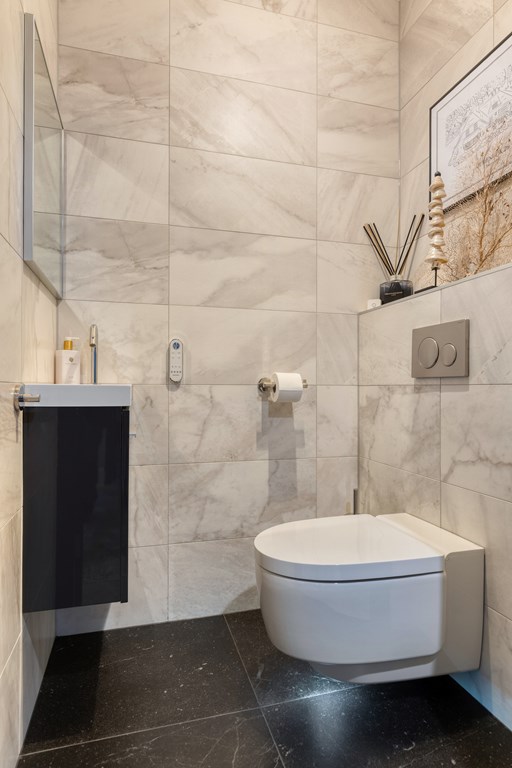 Binnengekomen in het appartement wordt u ontvangen in een ruime hal die direct de toon zet voor wat volgt. De afwerking is strak en rustig, met hoogwaardige materialen, zoals taatsdeuren en zorgvuldig gekozen verlichting. De gehele woning is van vloerverwarming voorzien. Vanuit hier heeft u toegang tot het separate toilet en de praktische bijkeuken, waar ruimte is voor witgoed en bergruimte, netjes uit het zicht maar perfect geïntegreerd in het geheel. Vervolgens opent de woning zich richting de indrukwekkende leefruimte, waar wonen, koken en eten naadloos in elkaar overlopen. De woonkamer is royaal en licht, met grote raampartijen en een sfeervolle elektrische haard die het zitgedeelte extra karakter geeft.