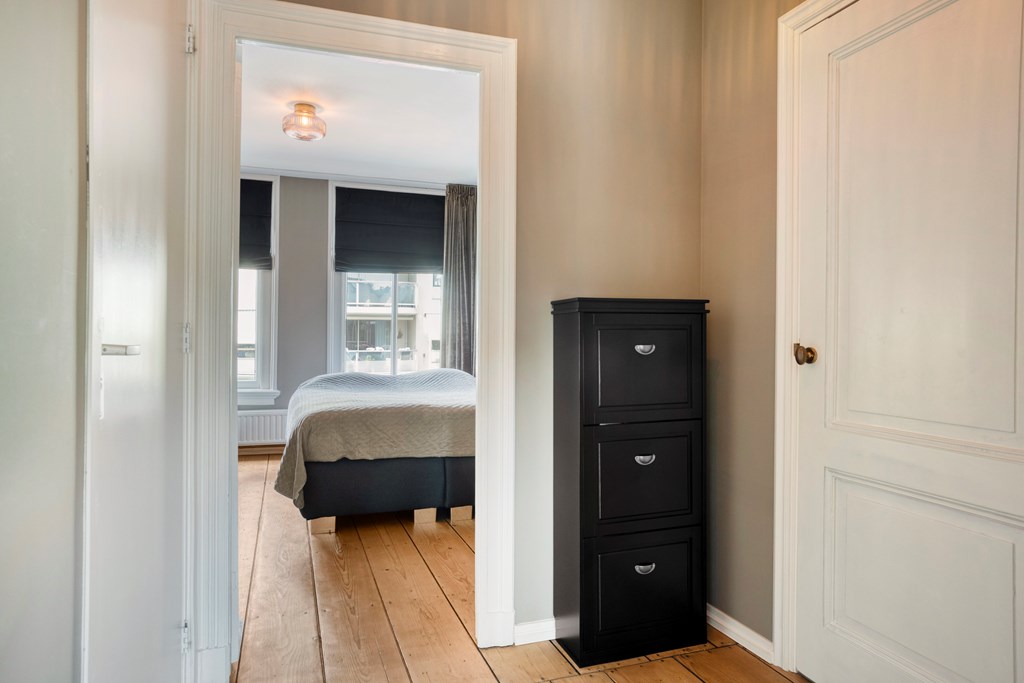 Op de tweede verdieping wordt u verrast door een royale, open ruimte met een bijzondere indeling. Meteen valt de warme uitstraling op dankzij de fraaie vloer en de zichtbare houten spanten die deze etage een bijzonder karakter en aangename sfeer geven. De verdieping is zo ingedeeld dat het slaapgedeelte, de loungehoek en werk/studeerplek met elkaar in verbinding staan. Deze verdieping beschikt tevens over een eigen pantry met origineel granito aanrechtblad , een eigen badkamer, stijlvol afgewerkt met houtlook tegelwerk, witte wandtegels en zwarte balkdetails. De badkamer is uitgerust met een inloop regendouche, een wandcloset en ook hier vindt u een waskom op een robuust eiken blad en geïntegreerde kraan. Een heerlijke luxe toevoeging, waardoor deze verdieping uitstekend kan functioneren als thuiskantoor, zelfstandig (gasten)verblijf , loft voor één van uw kinderen, of uw royale master suite!