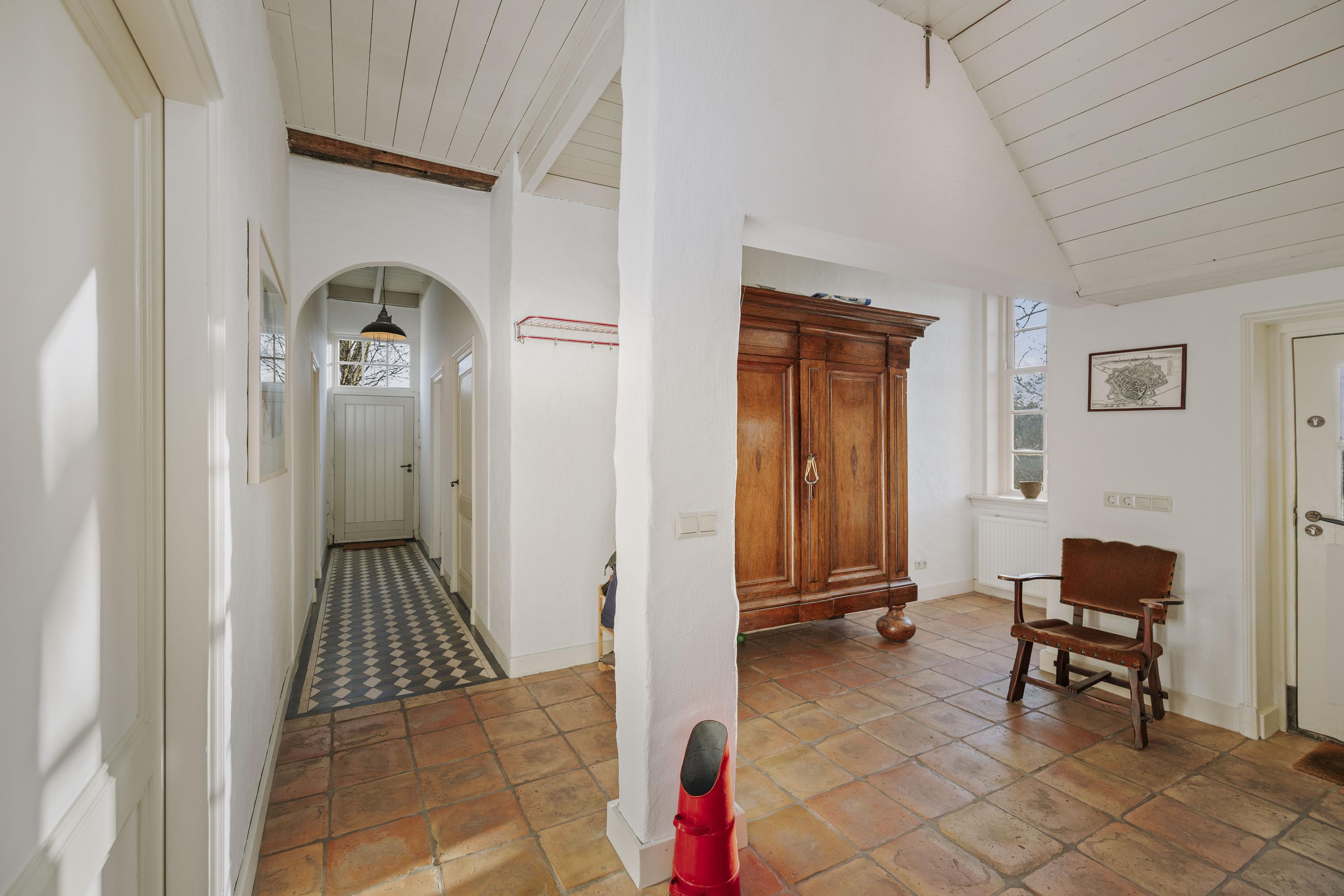 De met grind verharde oprit brengt ons bij de deel. In de Achterhoek is het een goed gebruik om ‘achterom’ binnen te komen en aan de achterzijde van het huis, met de indrukwekkende vergezichten over de belendende landerijen, bevindt zich de entree. In het programma is de klassieke indeling bewaard gebleven, want ook aan de voorzijde bevindt zich de traditionele voordeur. De hal, met de hoge plafonds, is zonnig en royaal, en op de vloer liggen de traditionele estrikken, die zo typerend zijn voor deze streek. De formele hal is voorzien van een Esscher plavuizen vloer en het geheel wordt fraai gecontrasteerd door de friswitte wanden en het roomkleurige houtwerk. In de hal is er toegang tot de WC en de badkamer op de begane grond, de eetkamer, de kelder en de opkamer die nu in gebruik is als kantoor met pantry, maar die ook perfect dienstdoet als gastenkamer.