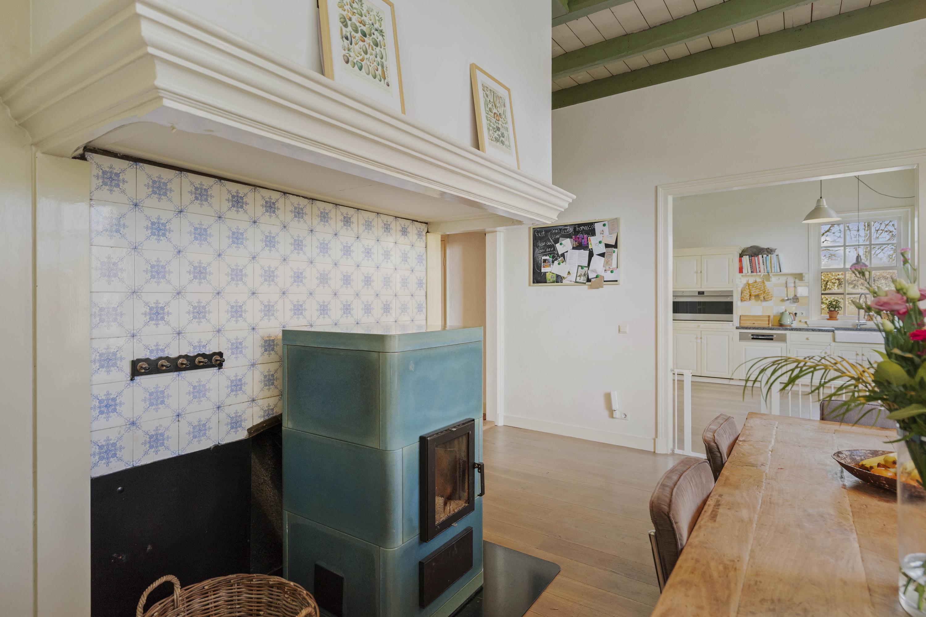 Aan de tuinzijde, in het voorhuis, bevinden zich de gezellige eetkamer en keuken. Ook hier ligt weer de fraaie eiken vloer. Een moderne tigchelkachel met aquablauw geglazuurde tegels houdt deze ruimte met gemak warm.