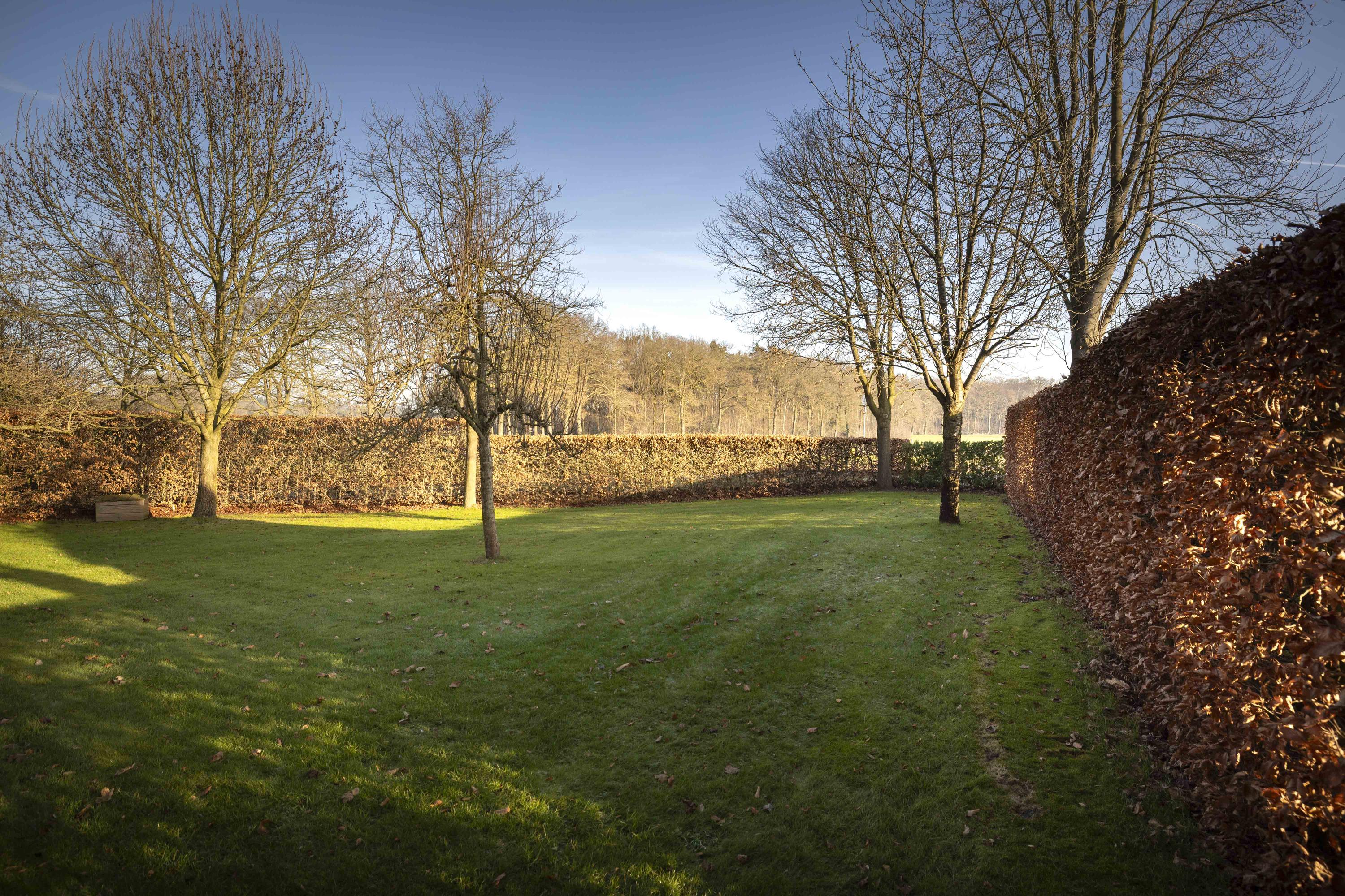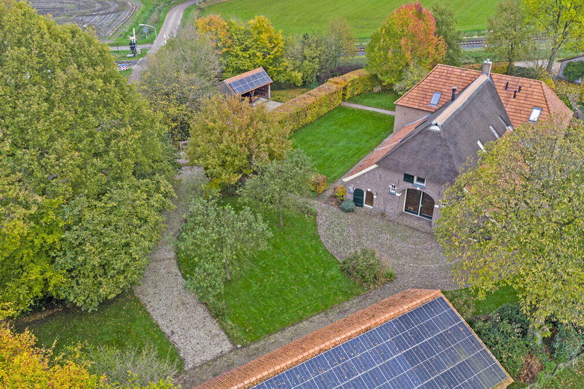 Het huis wordt omringd door een beeldige tuin. Er is een schuur met carport en aan de achterkant een afsluitbare tuingereedschapsberging (met op het dak 39 zonnepanelen - mooi uit het zicht), dus de auto’s staan droog, evenals de tuinspullen. Daarnaast is er een tweede houten bijgebouw (met op het dak 6 zonnepanelen) aanwezig, uitgevoerd in een landelijke stijl met potdekselwerk, Oud-Hollandse dakpannen en robuuste gebinten. Het bijgebouw biedt ruimte aan het parkeren van twee auto’s. Door de oriëntatie van het huis ligt er achter de woning een fijn zonneterras. Zowel aan de voor- als achterzijde zijn er grote gazons en de privacy wordt gewaarborgd door de manshoge beukenhagen. De gazons worden automatisch beregend via een ondergronds Rain Bird beregeningssysteem met pop-up sproeiers, aangesloten op een eigen grondwaterpomp en eenvoudig te bedienen via een app. Hierdoor kunnen het gras en de beplanting efficiënt en duurzaam worden bewaterd. Naast de beukenhagen beschikt de tuin eveneens over volwassen geboomte, waaronder vier appelbomen, een perenboom, een monumentale tamme kastanje alsmede een monumentale walnotenboom.