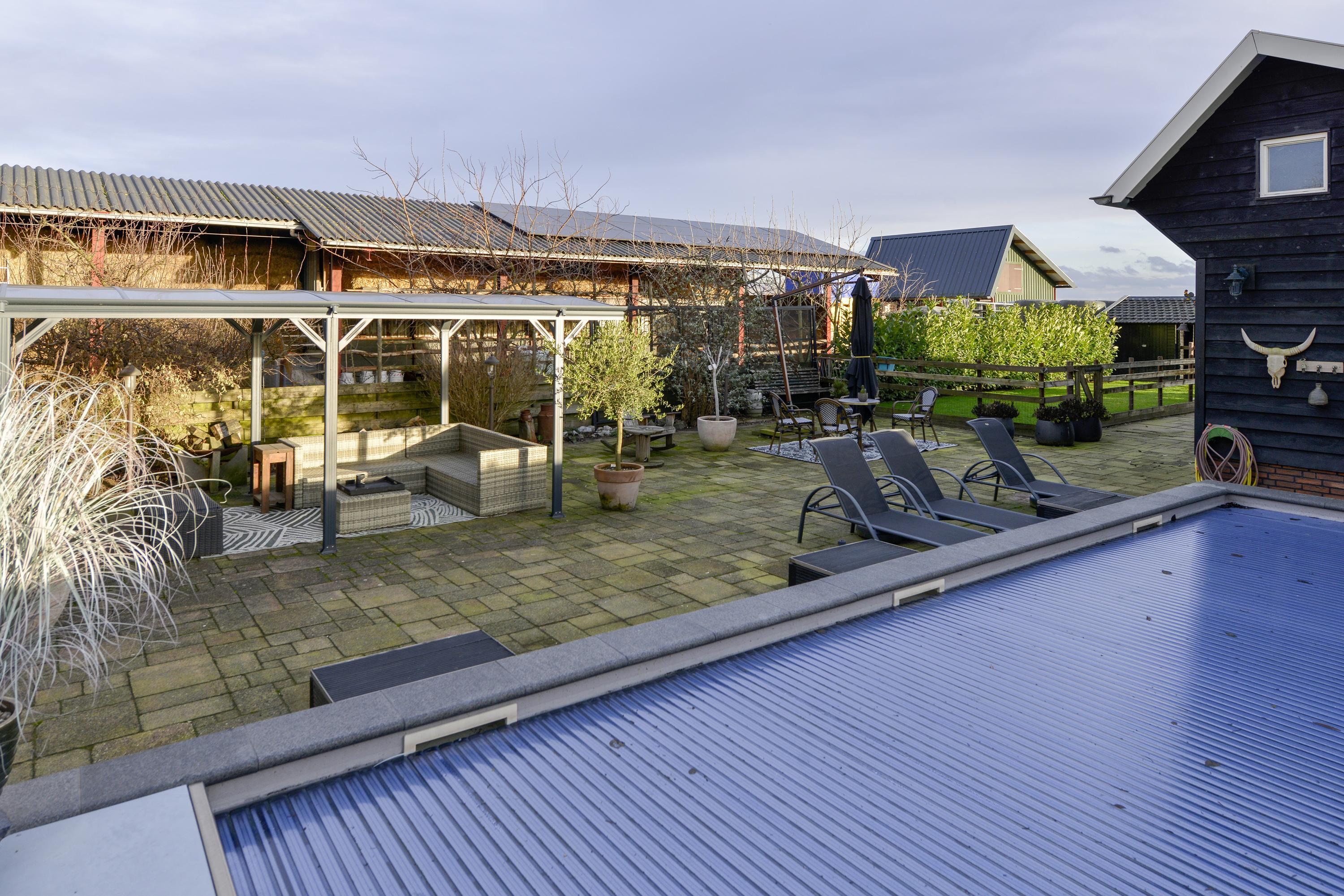 Tuin: diepe tuin met onder andere een overkapping met buitenkeuken, weiland met fruitbomen en een verwarmd zwembad.