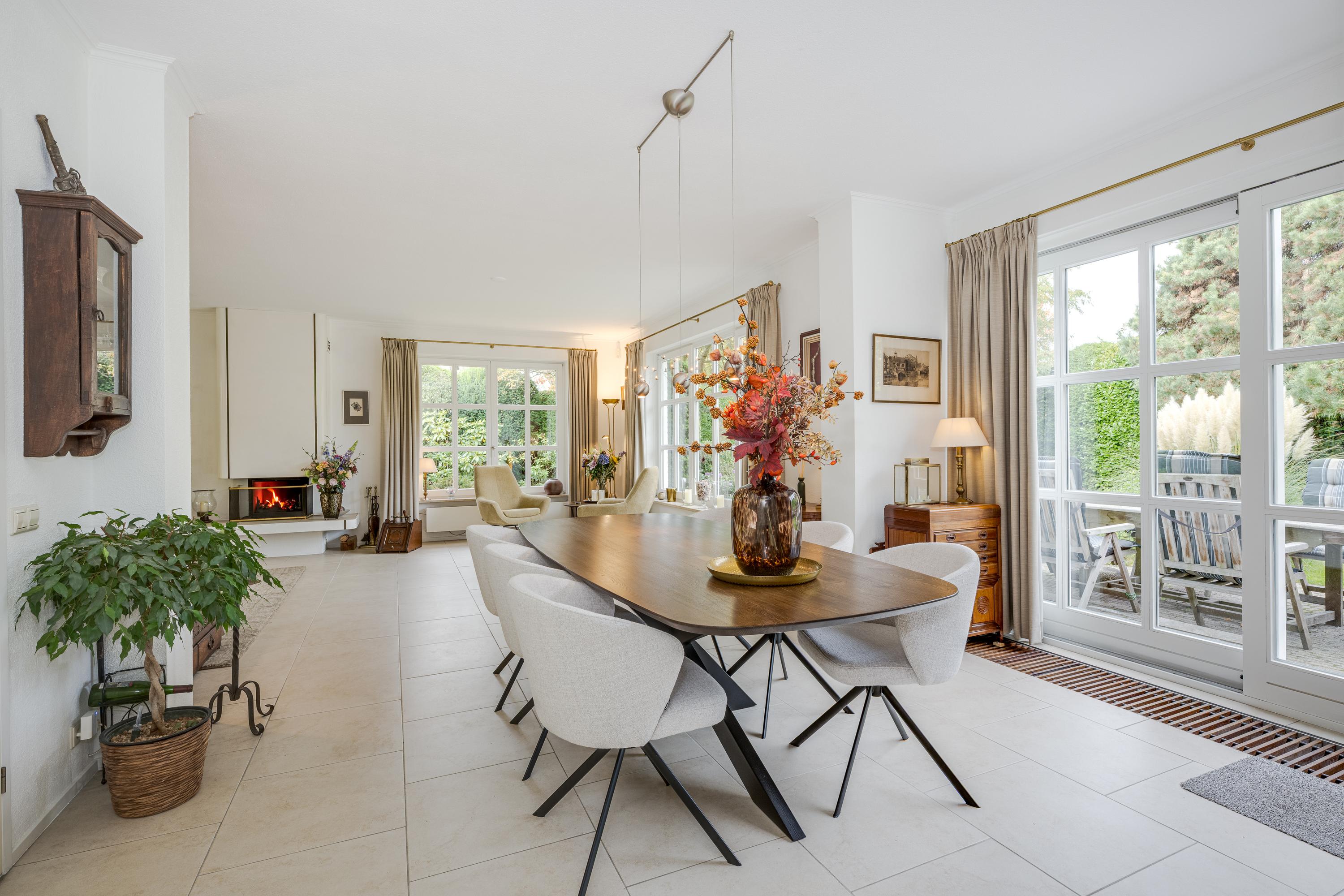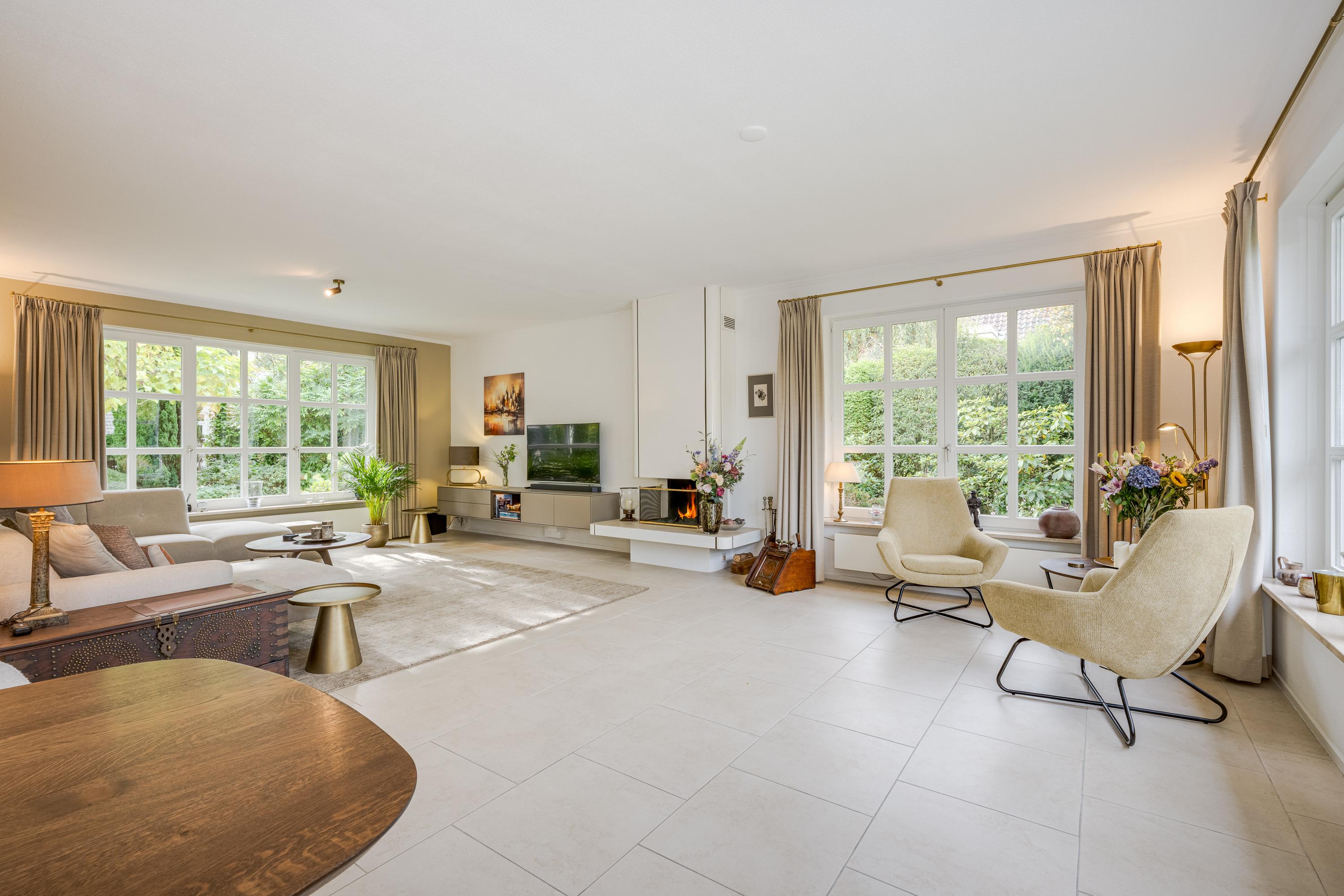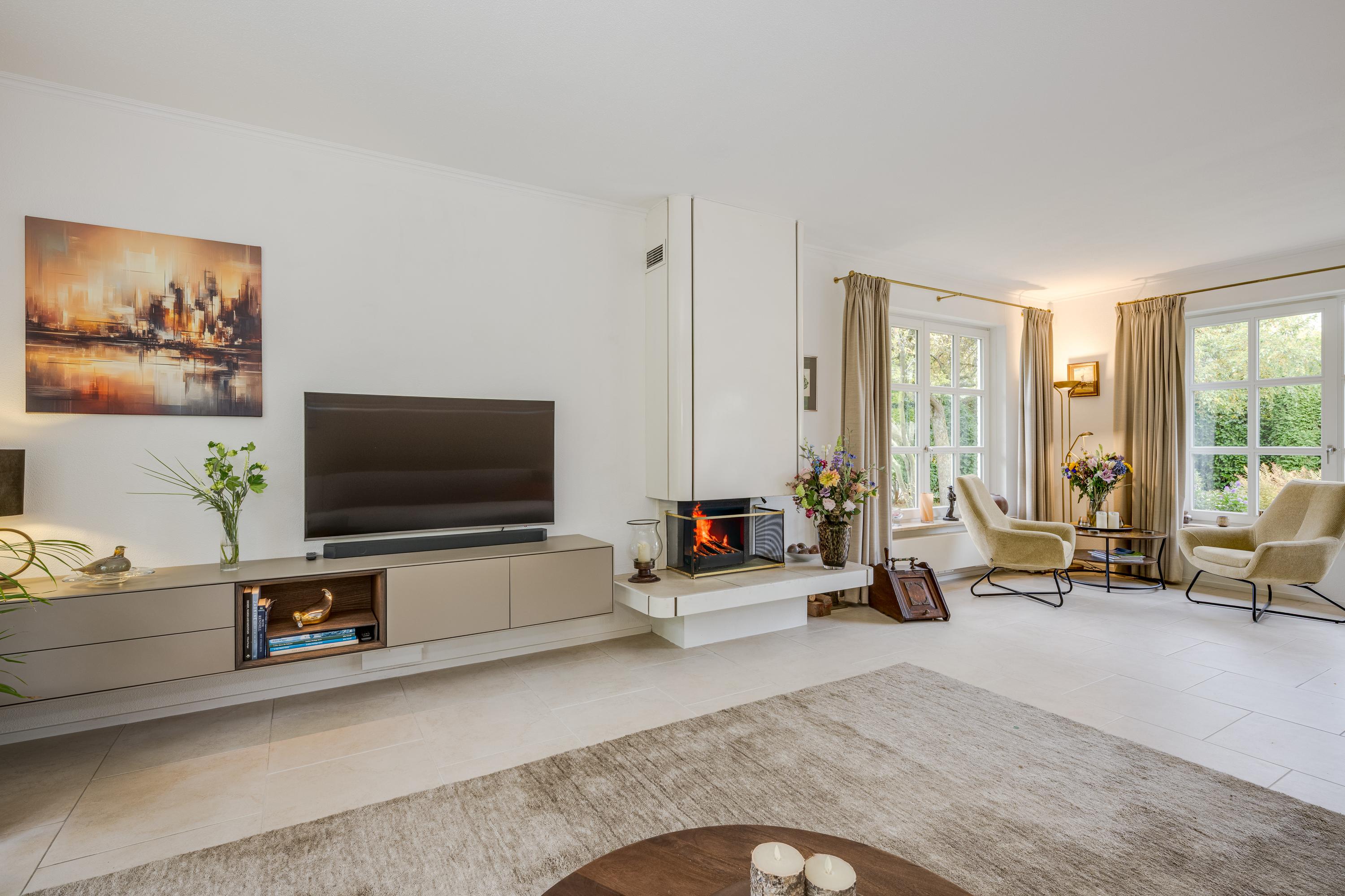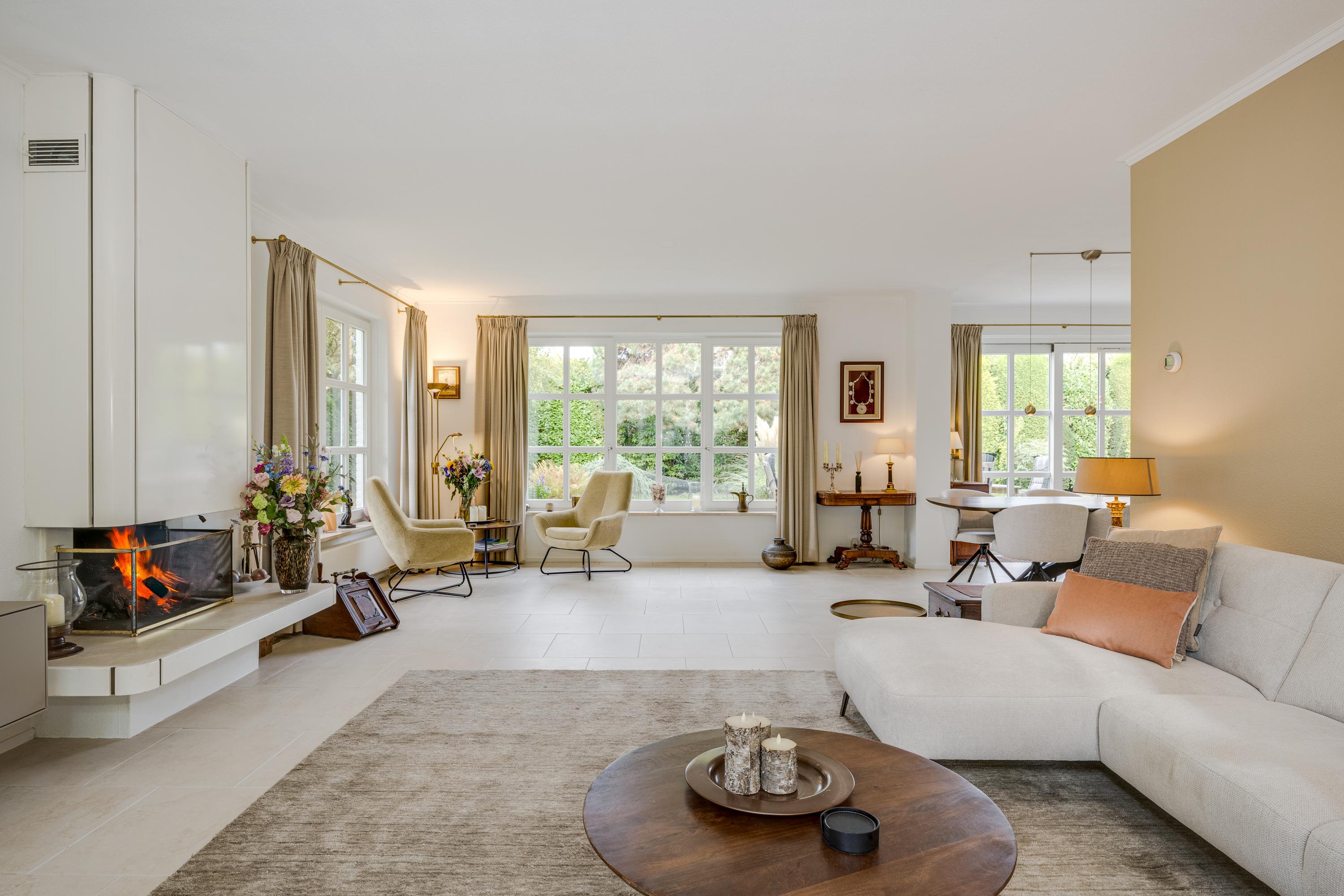 Entree met ruime hal, toilet en garderobe. Dubbele deuren geven toegang tot de lichte en riante woon-/eetkamer van ca. 55 m², met grote raampartijen, een schuifpui naar het terras en een sfeervolle houtgestookte open haard.