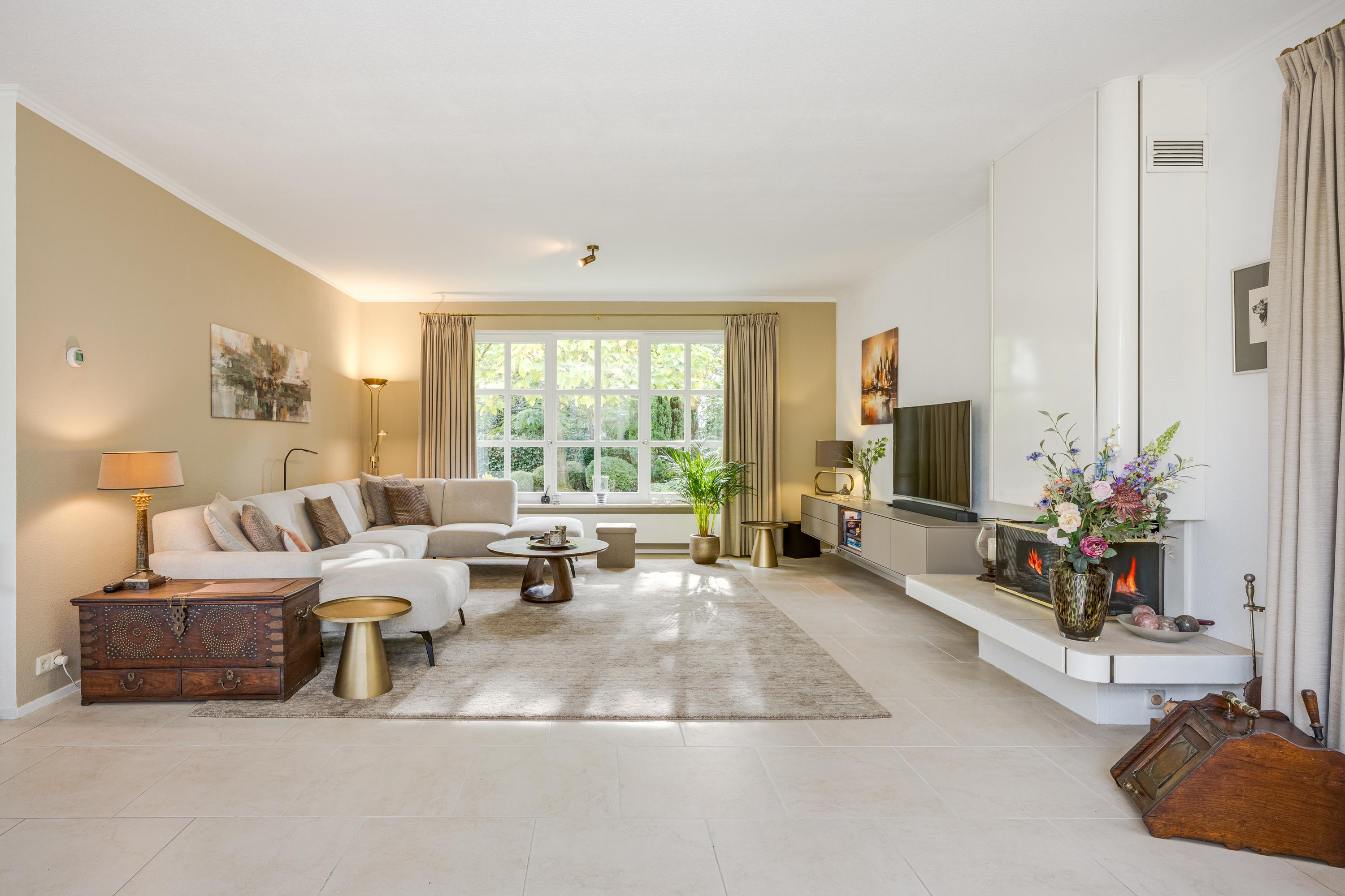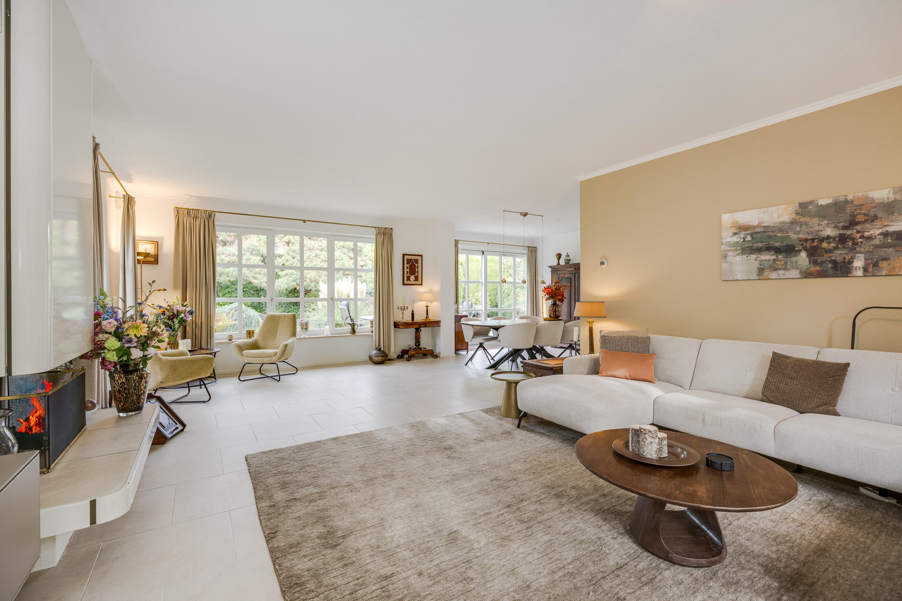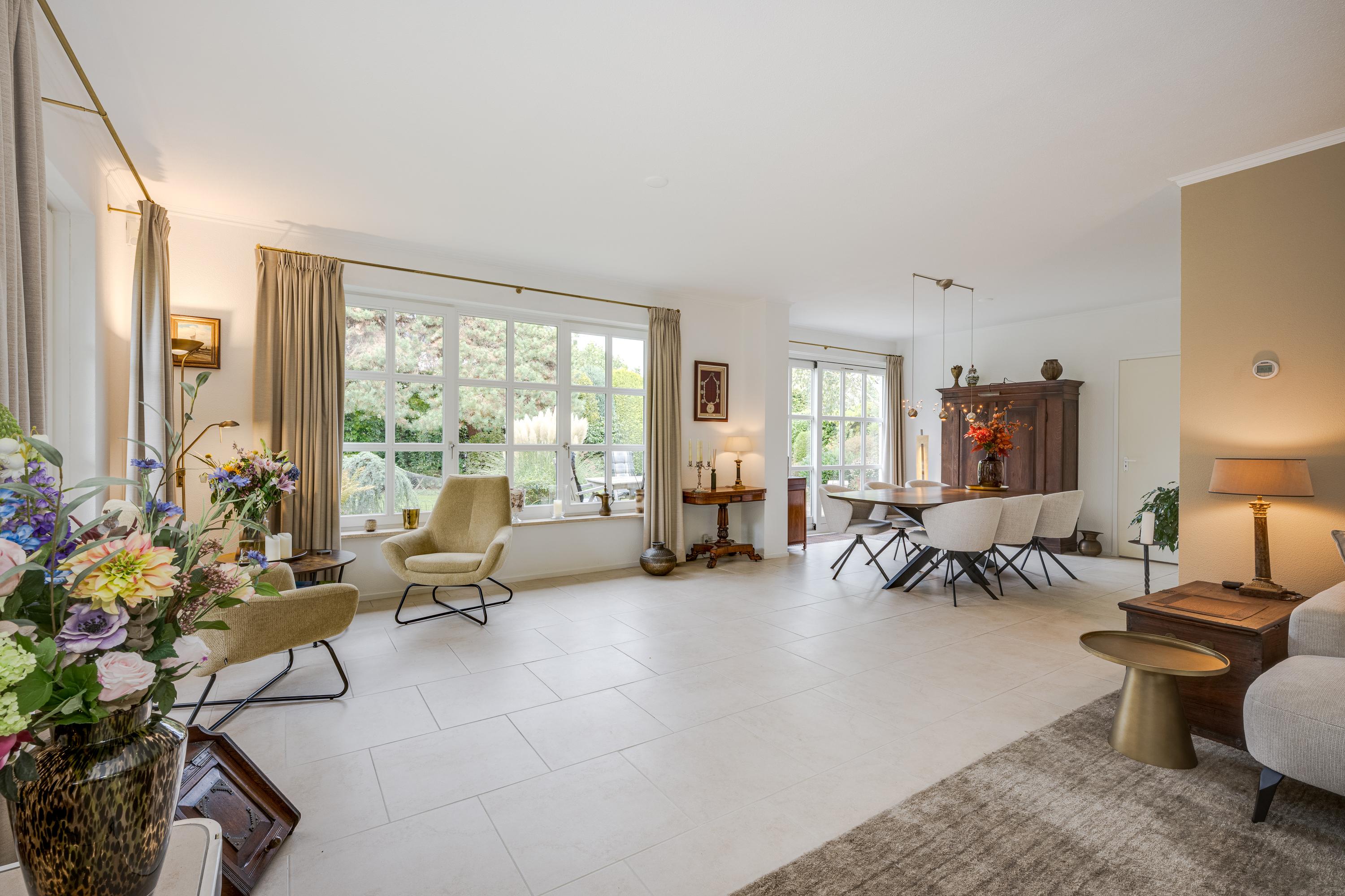 Entree met ruime hal, toilet en garderobe. Dubbele deuren geven toegang tot de lichte en riante woon-/eetkamer van ca. 55 m², met grote raampartijen, een schuifpui naar het terras en een sfeervolle houtgestookte open haard.