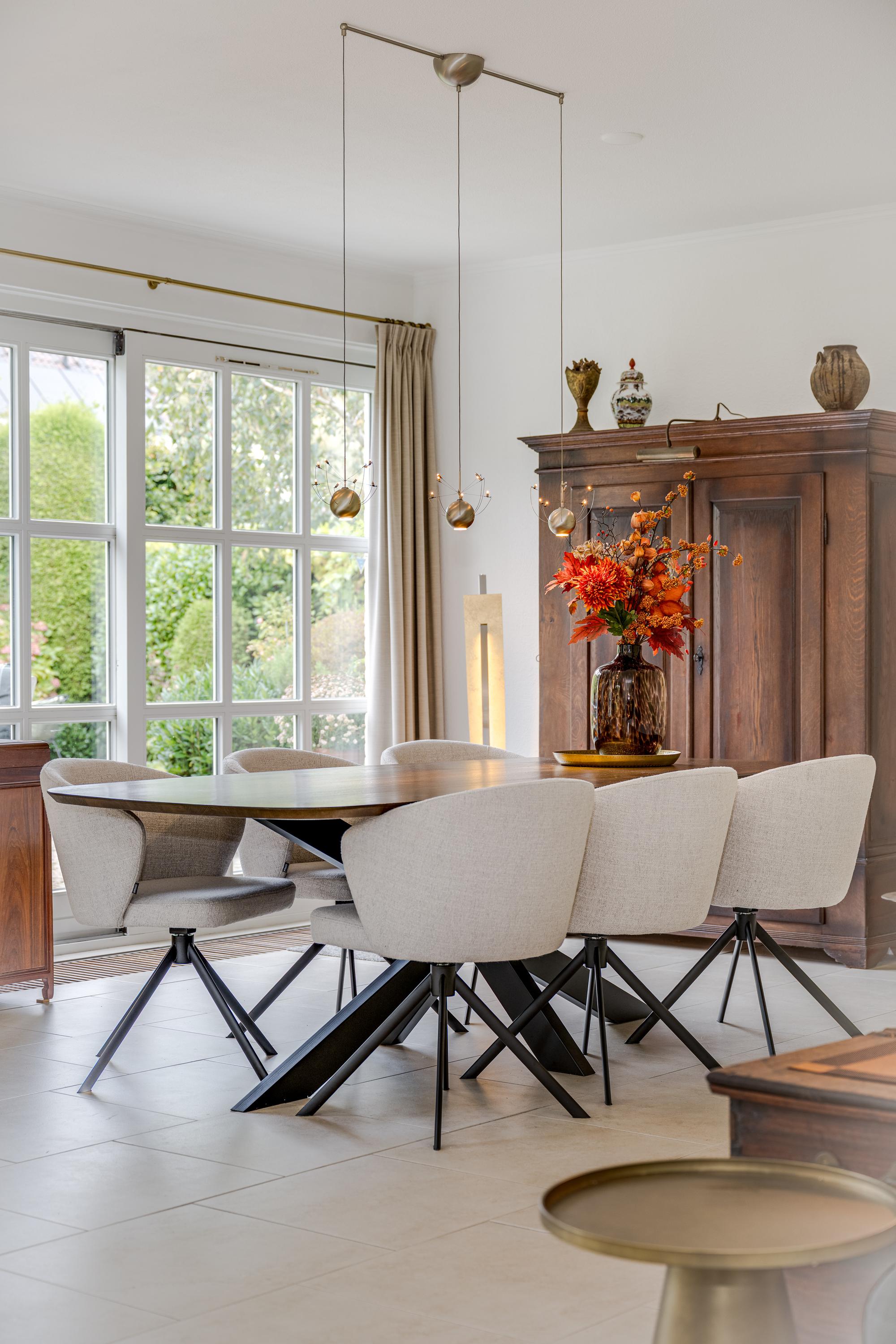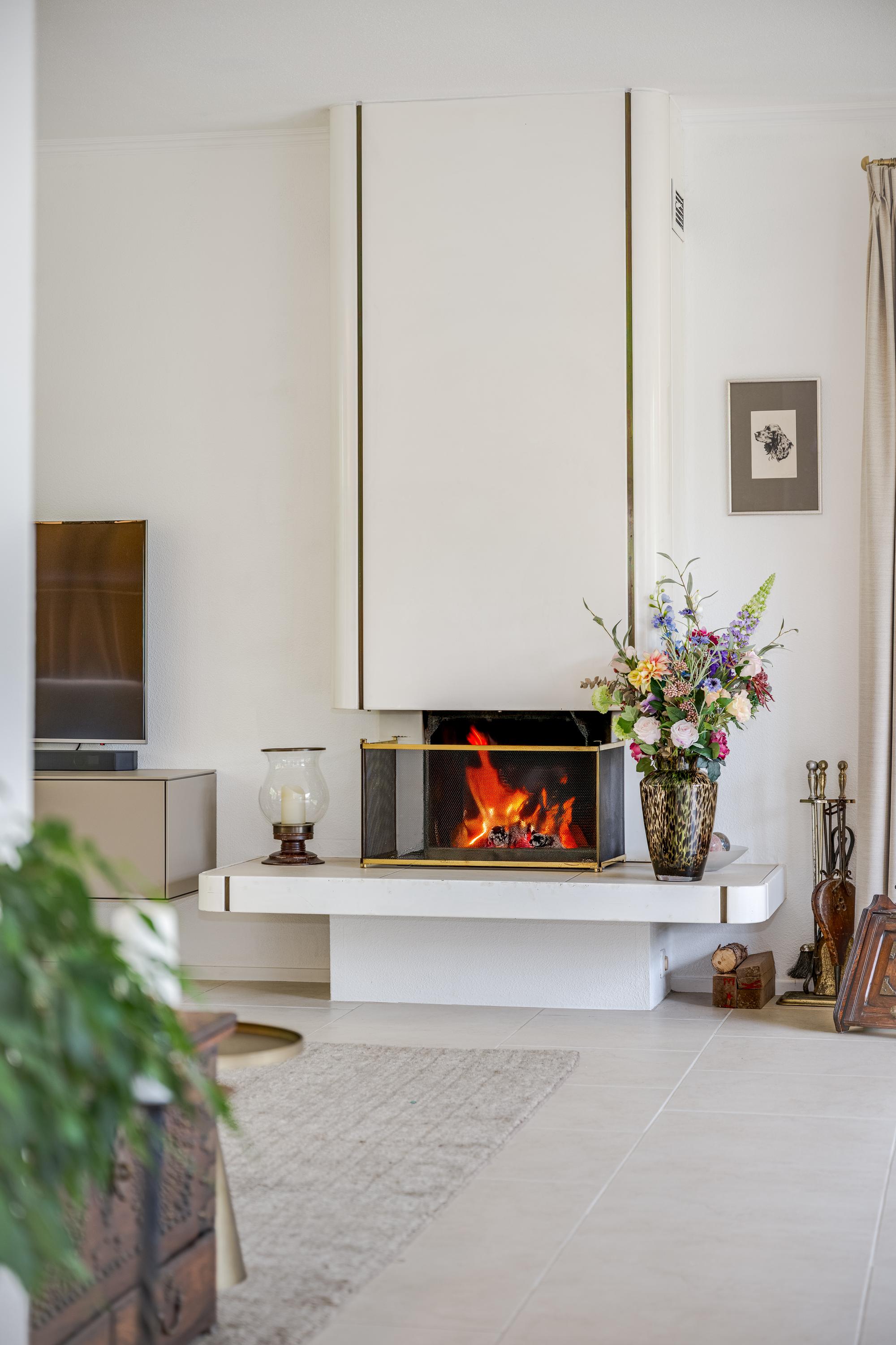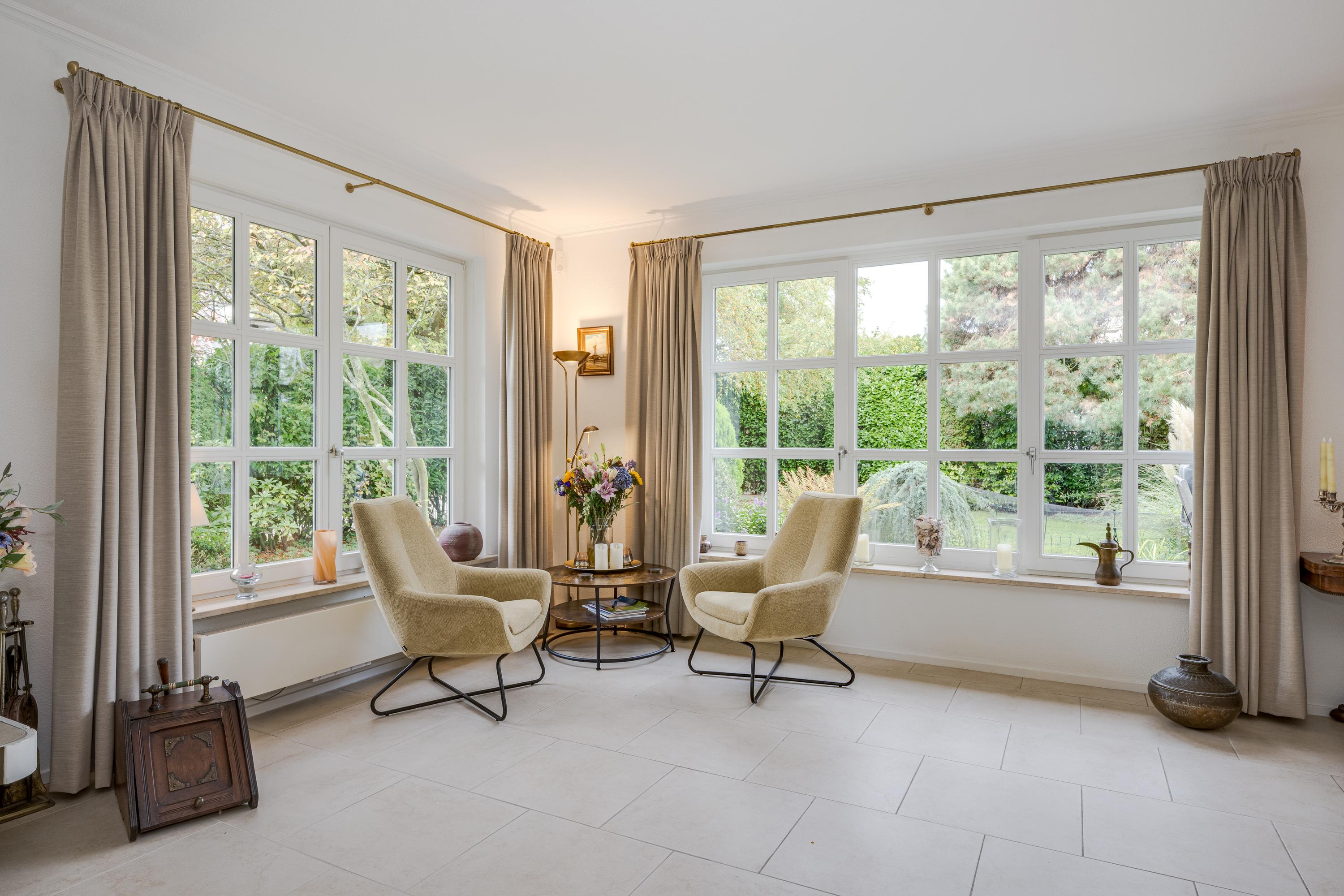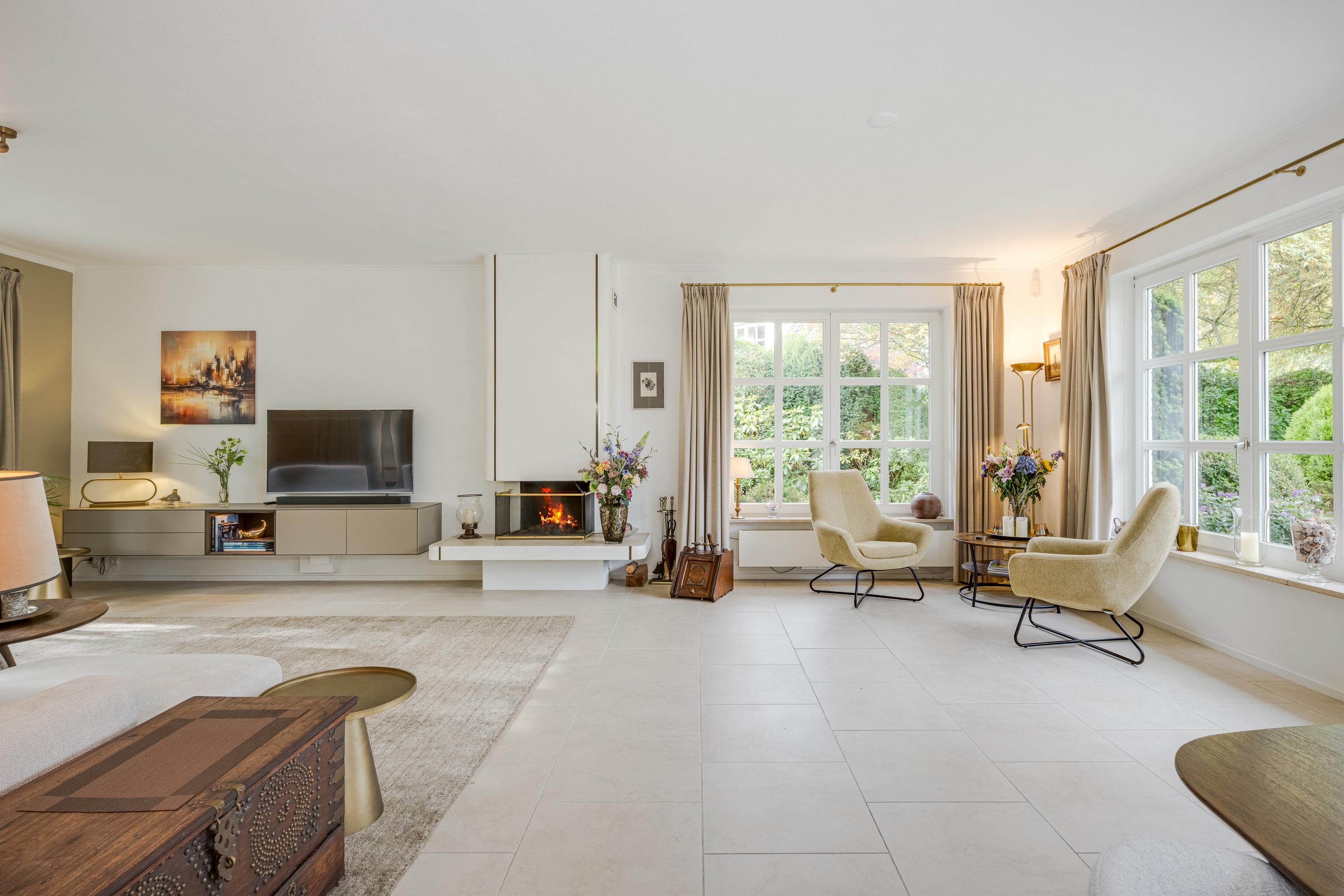 Entree met ruime hal, toilet en garderobe. Dubbele deuren geven toegang tot de lichte en riante woon-/eetkamer van ca. 55 m², met grote raampartijen, een schuifpui naar het terras en een sfeervolle houtgestookte open haard.