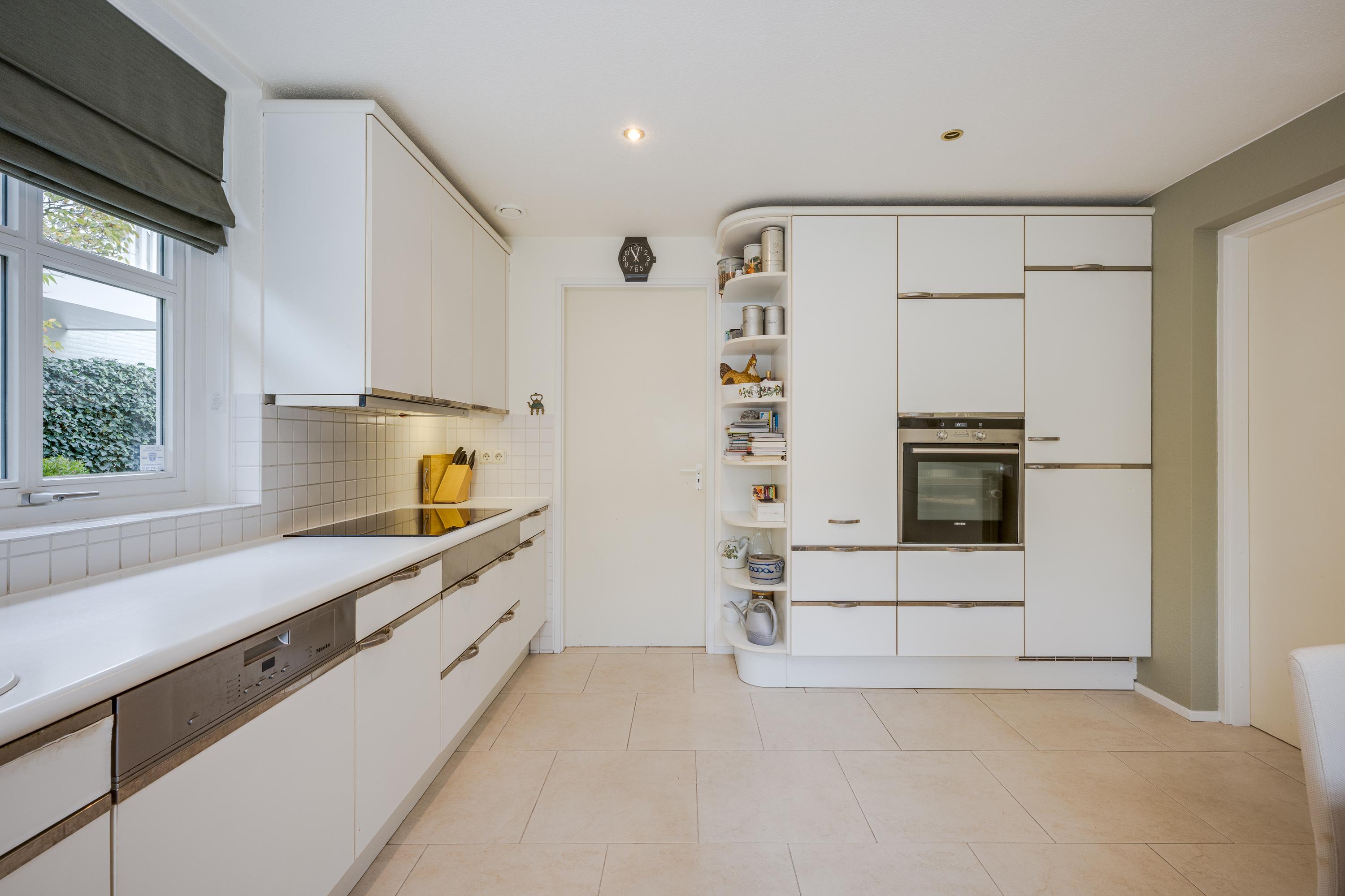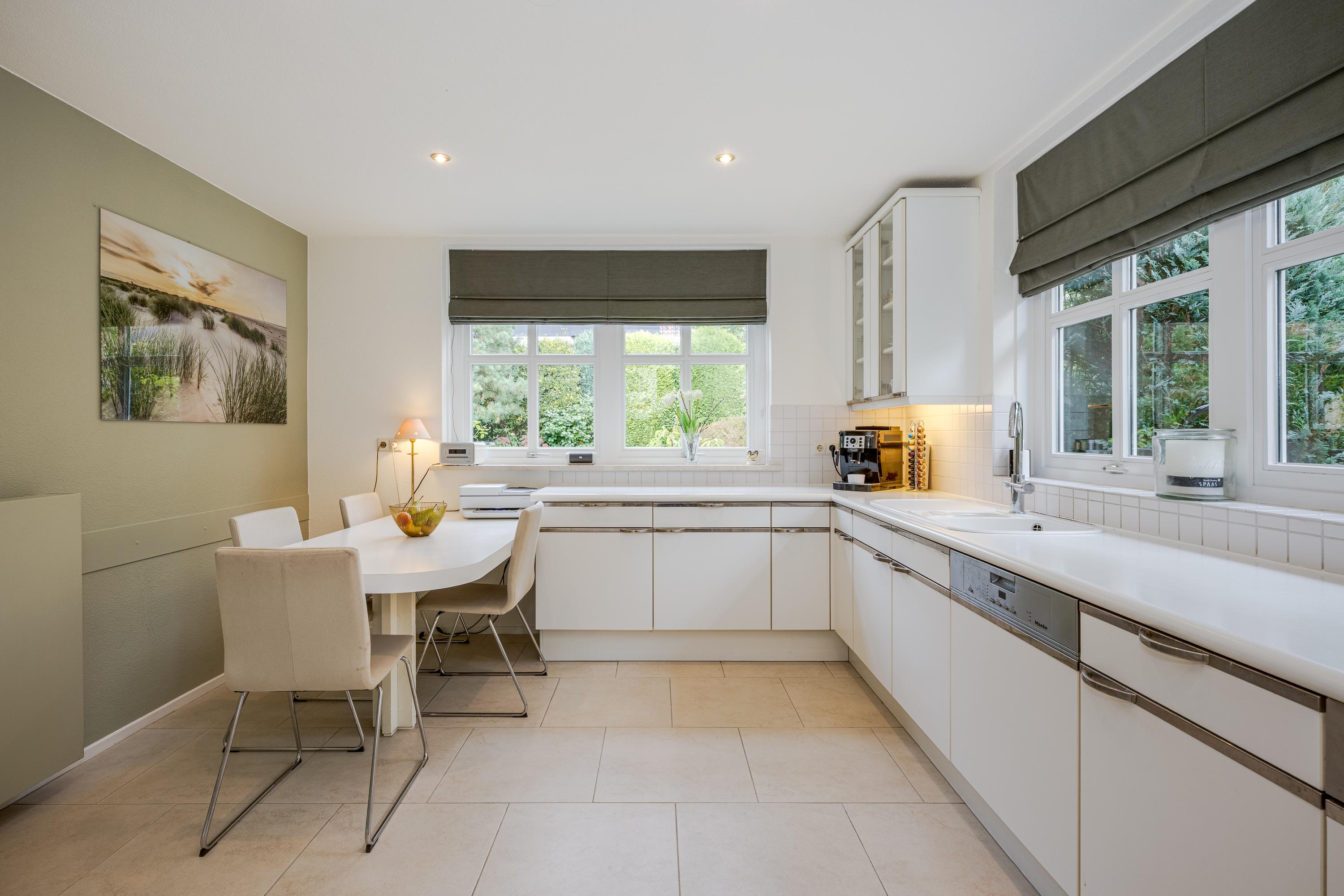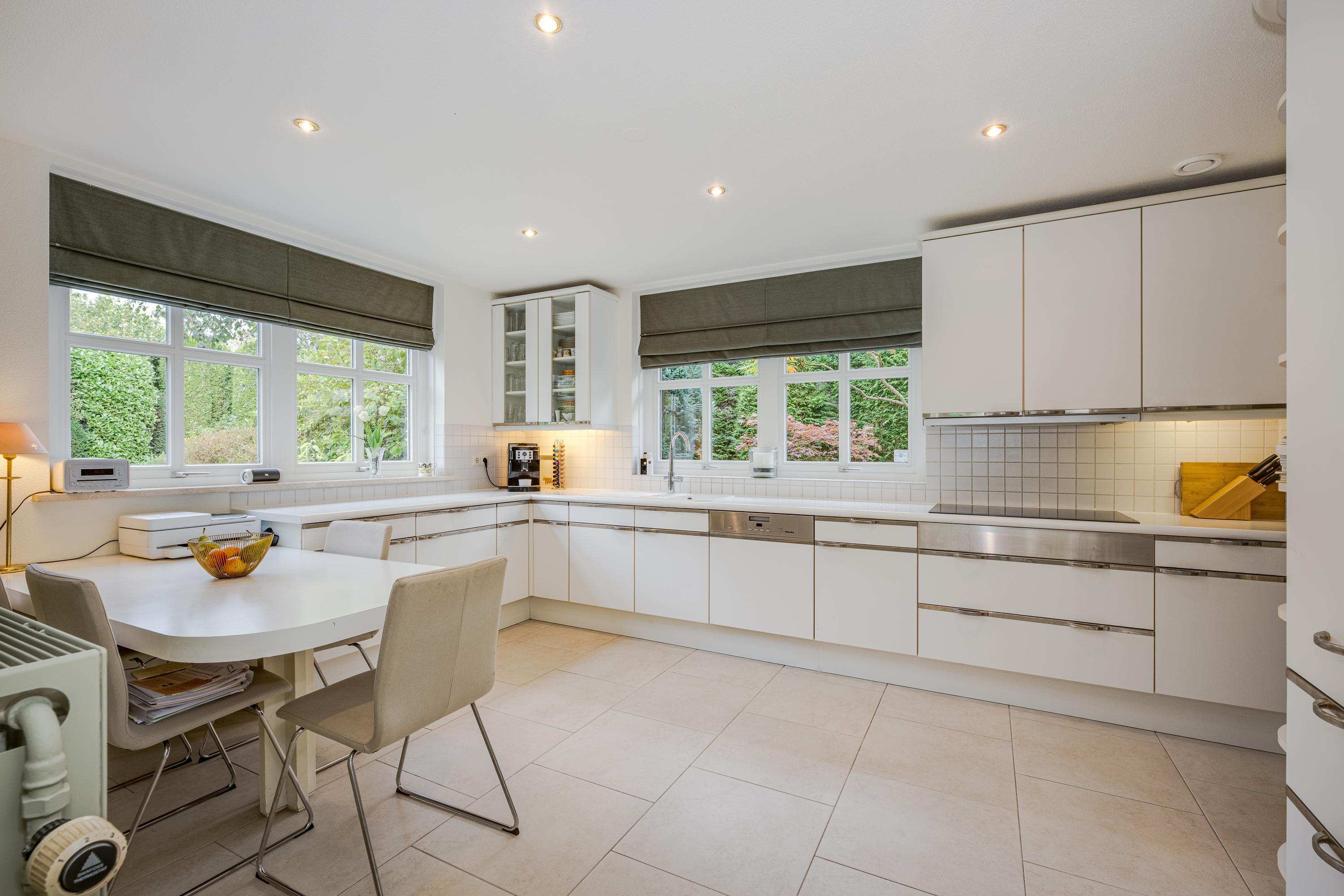 De ruime, lichte eetkeuken is voorzien van alle gebruikelijke inbouwapparatuur en veel kastruimte. Aangrenzend bevindt zich een bijkeuken met aansluitingen voor wasmachine en droger, plus een luik naar de (wijn-)kelder (ca. 2,3 x 1,4 m). Vanuit de bijkeuken is de inpandige garage (ca. 5,4 x 3,1 m) bereikbaar.