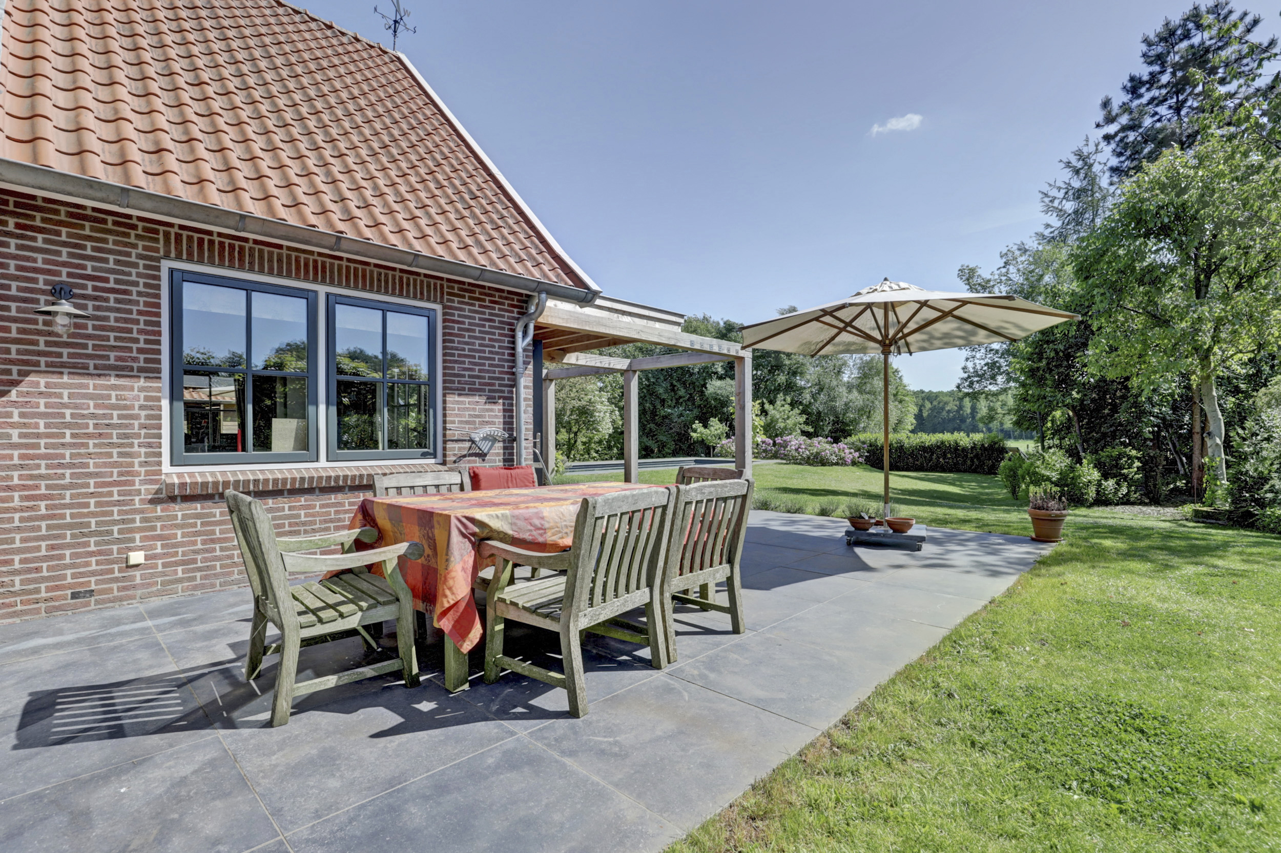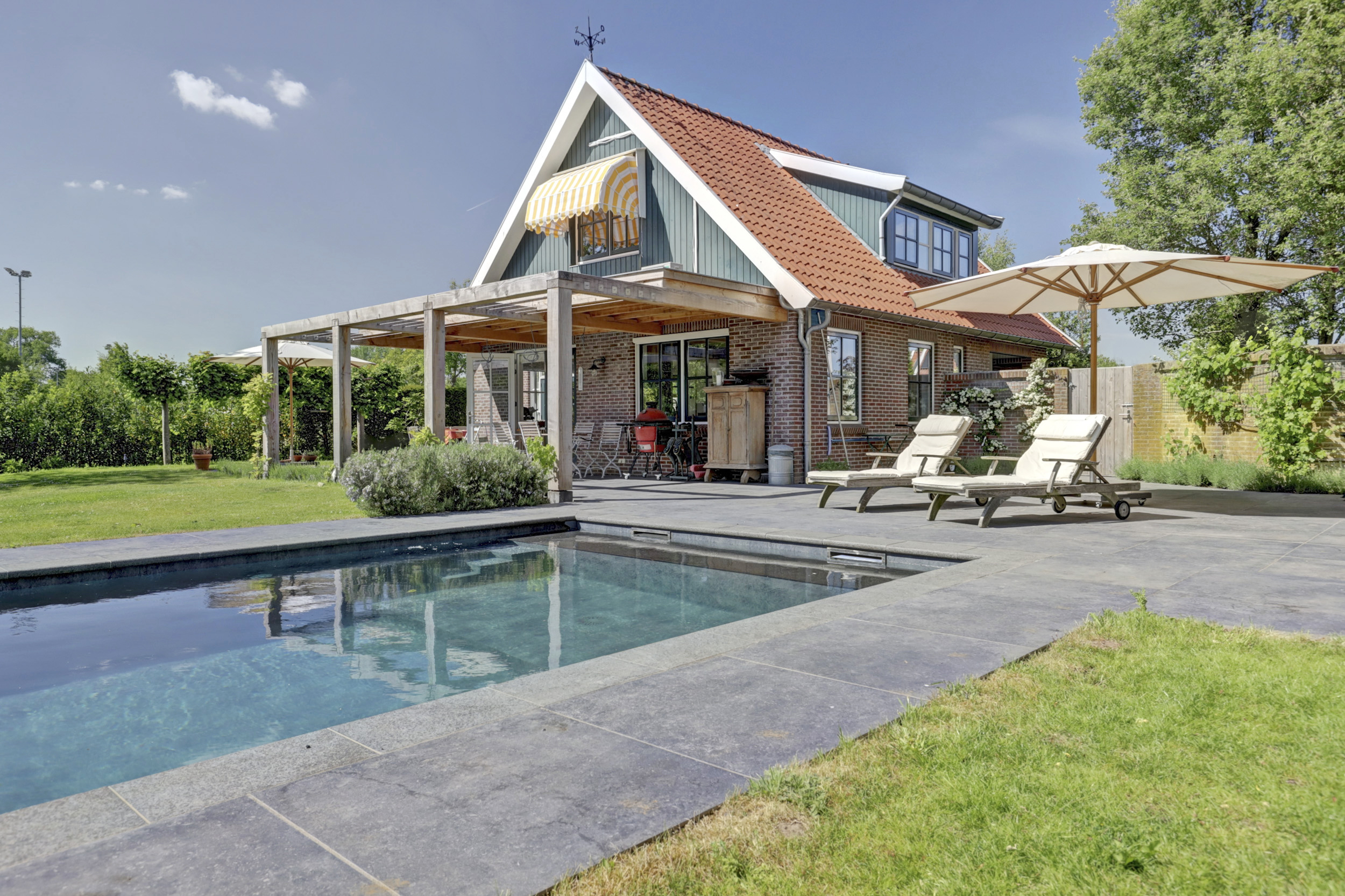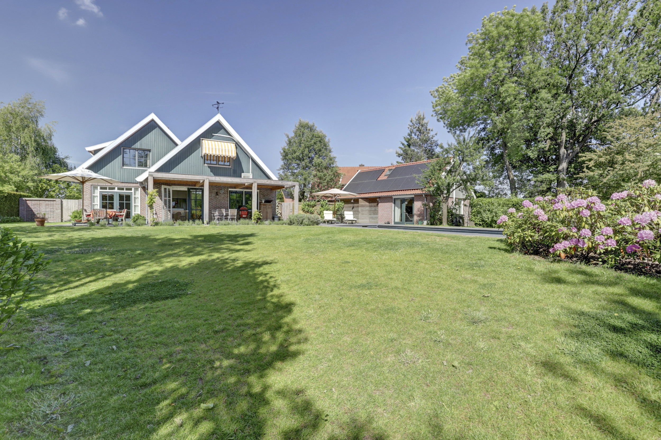 Deze aantrekkelijke villa werd gebouwd in 2002 en heeft – net als de andere woningen in deze wijk - de herkenbaarheid van de boerderijen uit deze streek; een zadelkap met rode kleipannen, gevels in rode baksteen en een houten topgevel. Die herkenbaarheid maakt dat dit moderne huis perfect landt in de omgeving. In 2023 werd de villa flink geüpdated. Er werd een nieuwe keuken geplaatst en ook werd er een flinke slag in de verduurzaming gemaakt: men legde een schitterend zwembad aan, installeerde een lucht-luchtwarmtepomp voor de verwarming ervan. Op de daken en uit het zicht in de tuin werden maar liefst 47 zonnepanelen gelegd. De gehele benedenverdieping en de badkamer is bovendien voorzien van een comfortabele vloerverwarming.