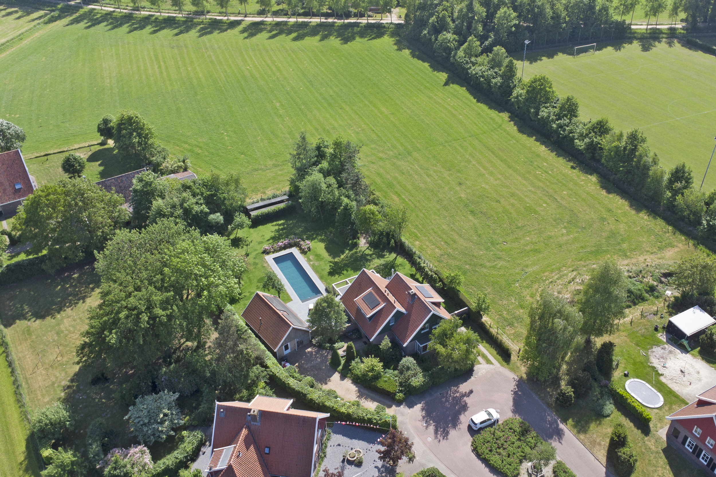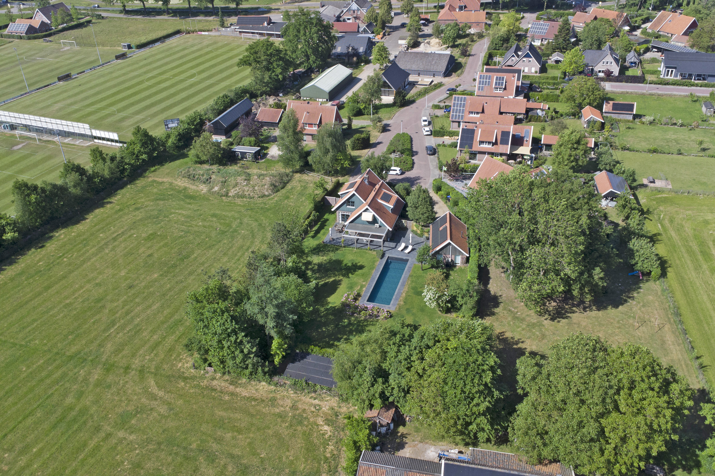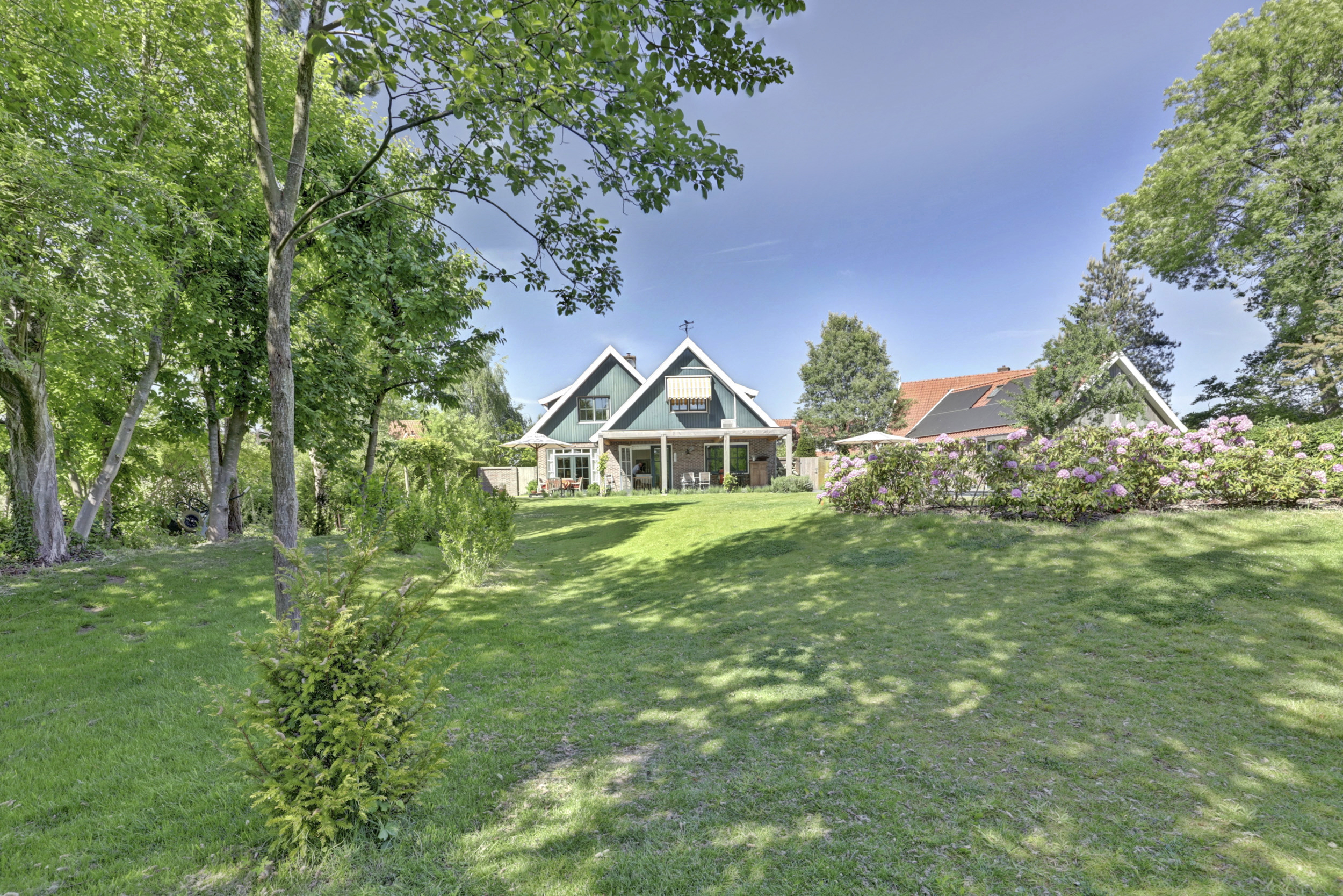Deze aantrekkelijke villa werd gebouwd in 2002 en heeft – net als de andere woningen in deze wijk - de herkenbaarheid van de boerderijen uit deze streek; een zadelkap met rode kleipannen, gevels in rode baksteen en een houten topgevel. Die herkenbaarheid maakt dat dit moderne huis perfect landt in de omgeving. In 2023 werd de villa flink geüpdated. Er werd een nieuwe keuken geplaatst en ook werd er een flinke slag in de verduurzaming gemaakt: men legde een schitterend zwembad aan, installeerde een lucht-luchtwarmtepomp voor de verwarming ervan. Op de daken en uit het zicht in de tuin werden maar liefst 47 zonnepanelen gelegd. De gehele benedenverdieping en de badkamer is bovendien voorzien van een comfortabele vloerverwarming.