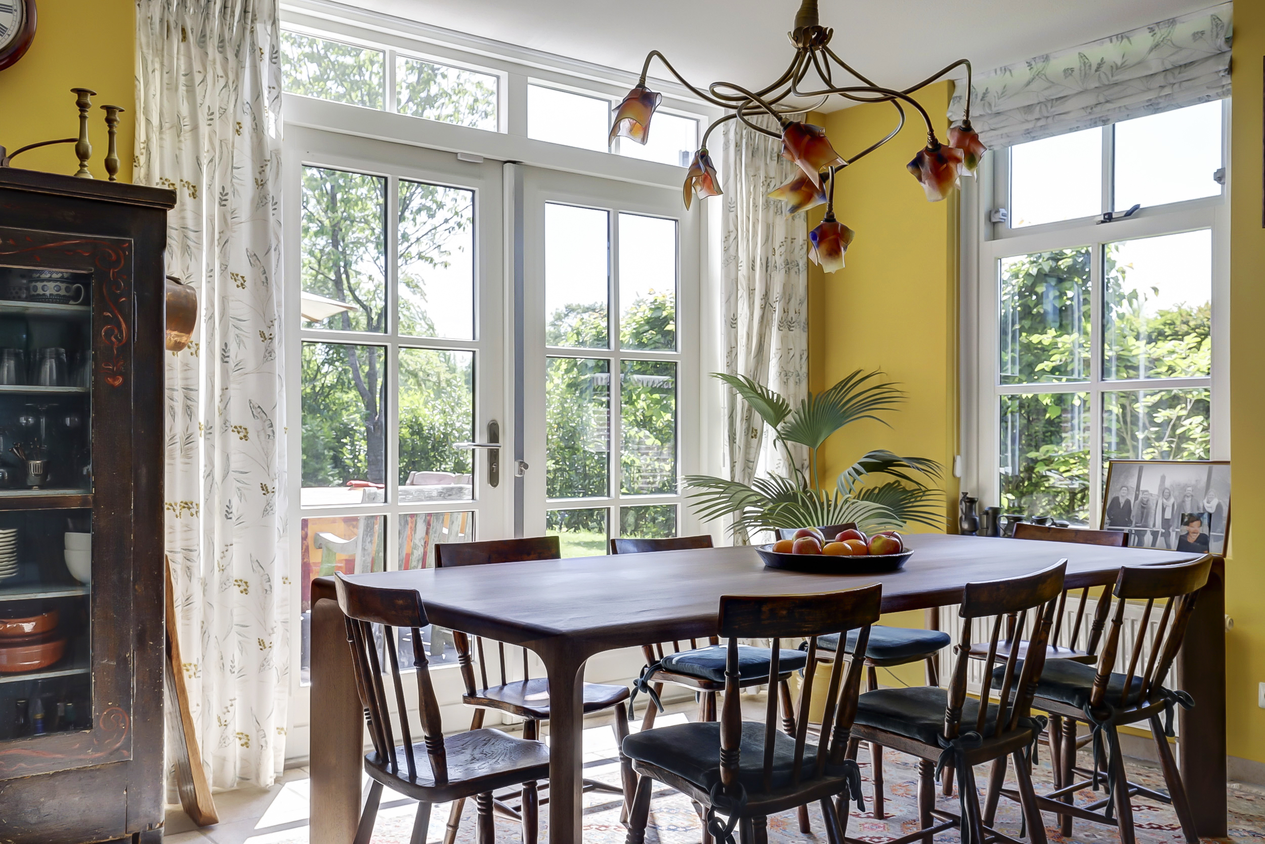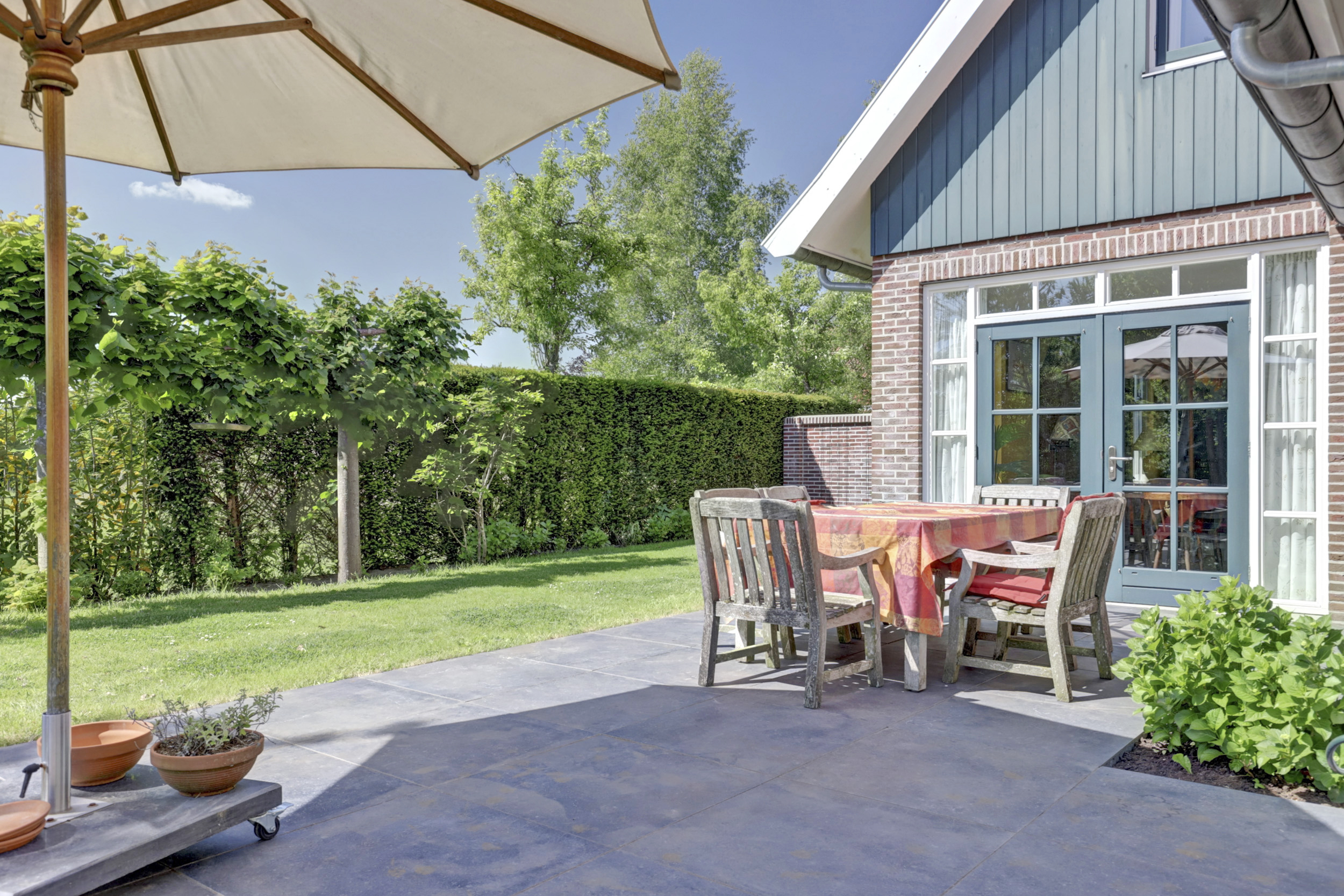Achter de keuken het heerlijke zonneterras met veranda. De siertuin is prachtig, met een groot gazon, een vruchtenboomgaard en fraai ingerichte borders en bloemperken. De tuin is voorzien van een beregeningsinstallatie op grondwater en de automatische grasmaaier zorgt ervoor dat het gazon er als een biljartlaken bij ligt.