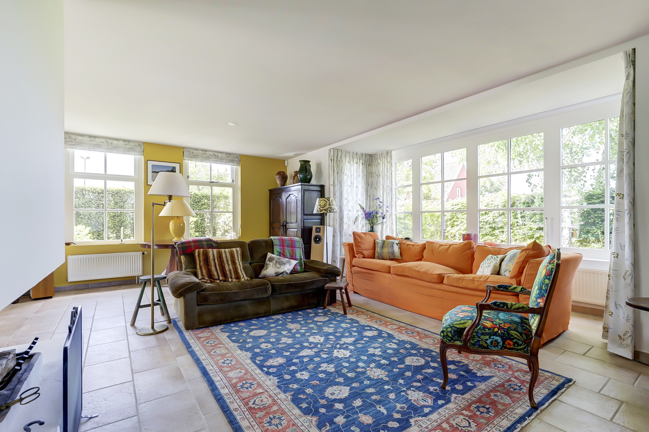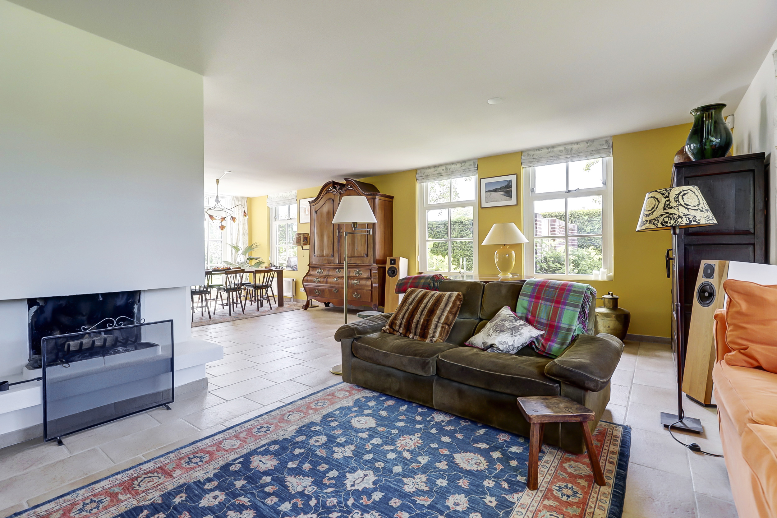 Het huis beschikt over een royale, lichte living met een erker en een sfeervolle open haard. De woonkamer is lekker licht door de grote raampartijen en de openslaande tuindeuren. De living staat in een open verbinding met de ruime eetkeuken, die plaats genoeg heeft voor een grote eettafel. Ook hier zijn openslaande tuindeuren die openen naar het zonnige terras met veranda.