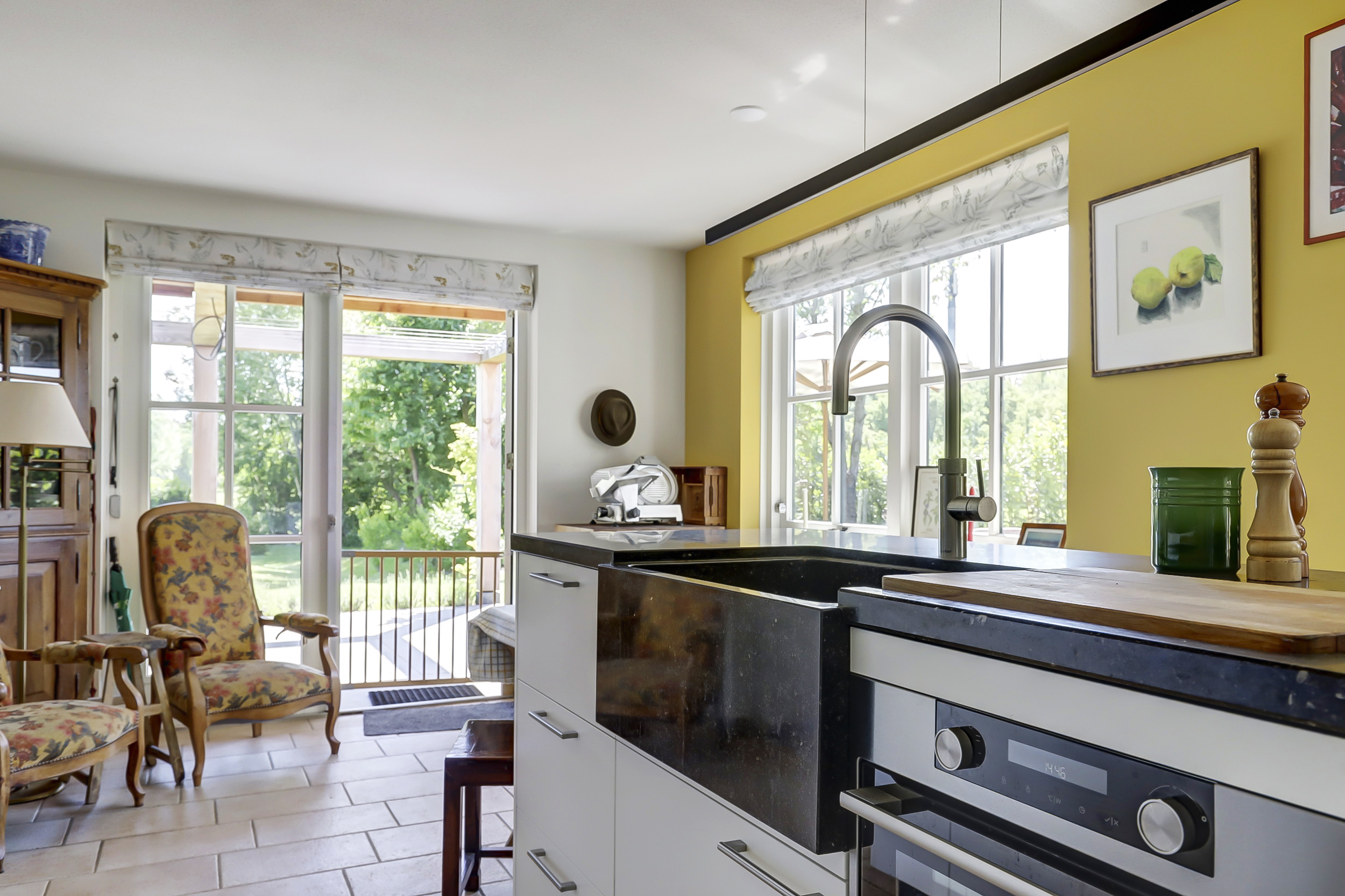 In de tuin staat de vrijstaande B&B, compleet met een eigen ontbijtkeuken (incl. Quooker) en badkamer met douche, wastafel en WC. Ook hier is een afgescheiden wijnklimaatkast aanwezig, dus u heeft in dit huis twee uitstekende mogelijkheden om uw wijncollectie op peil te houden.