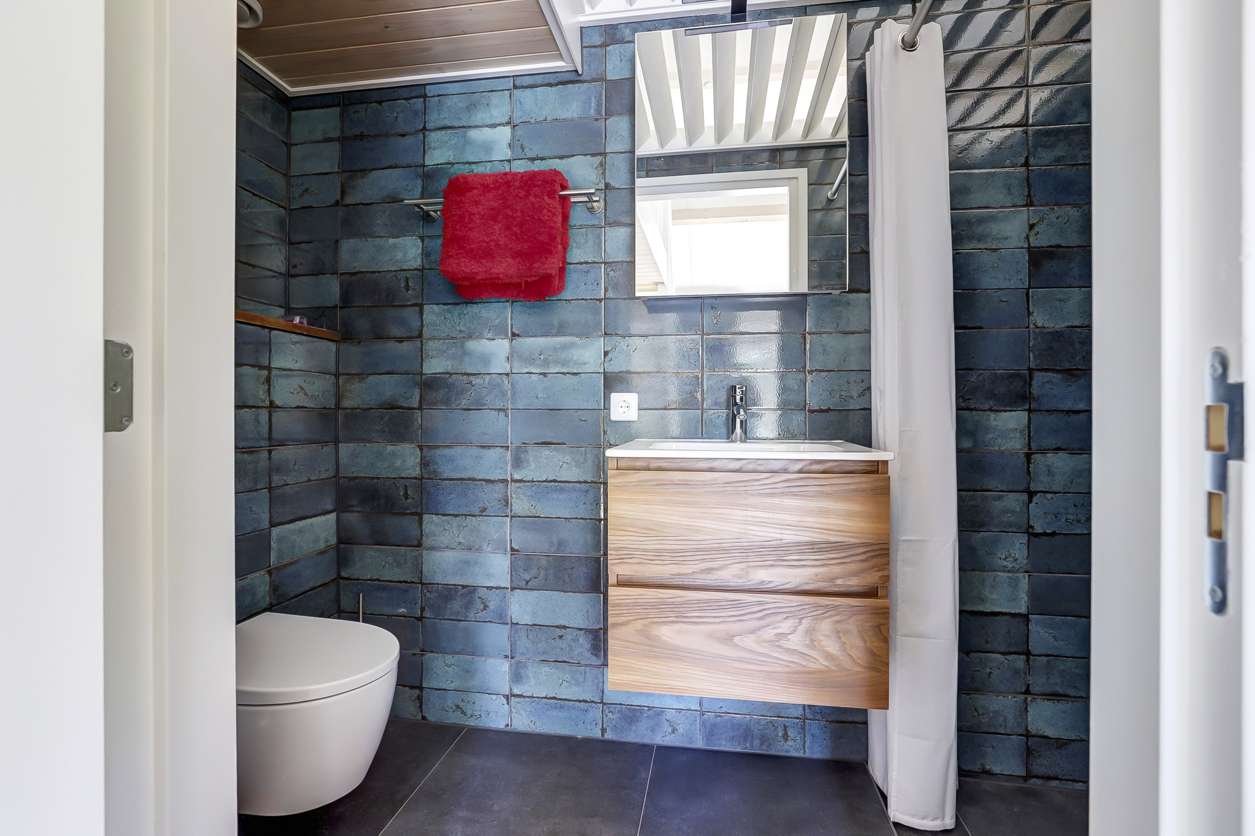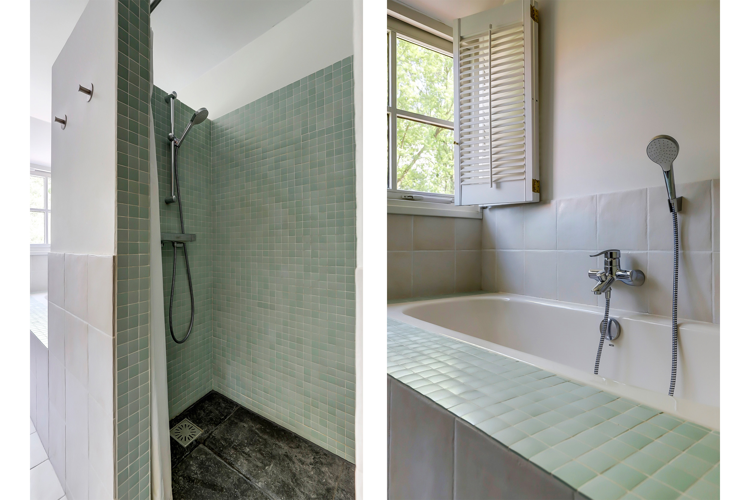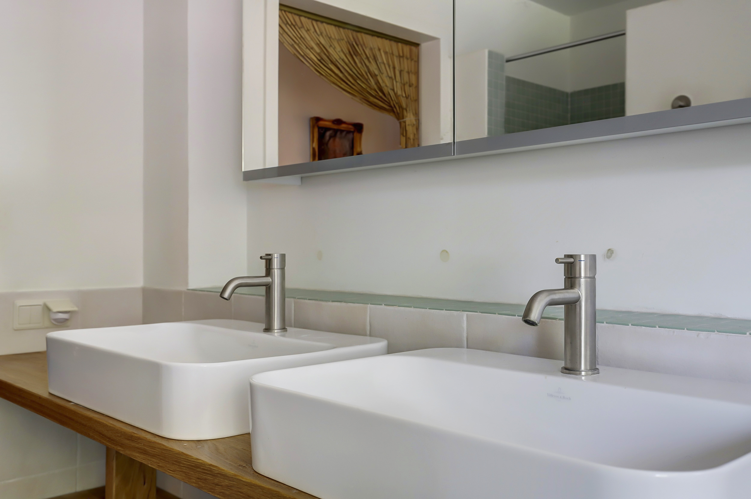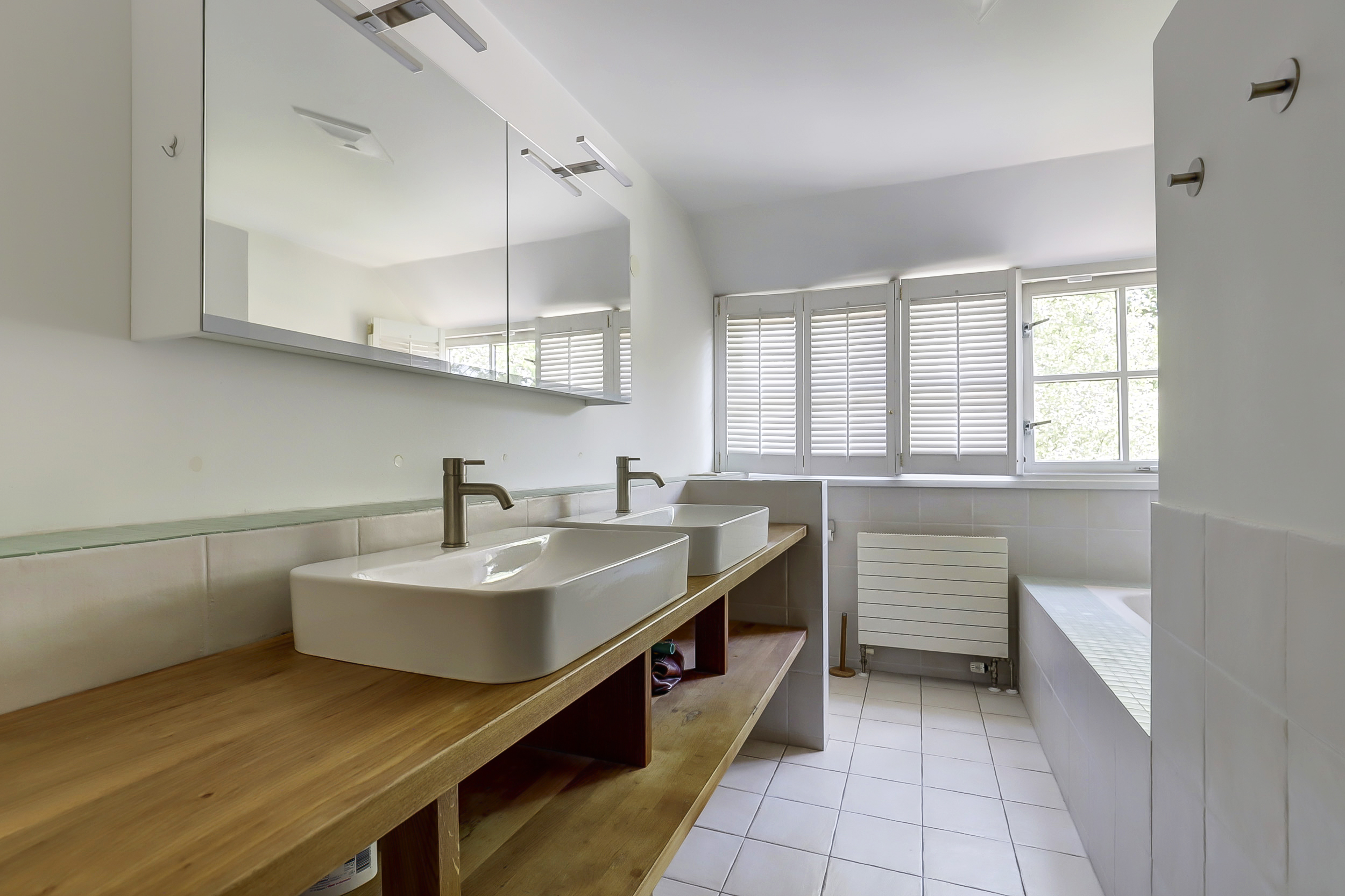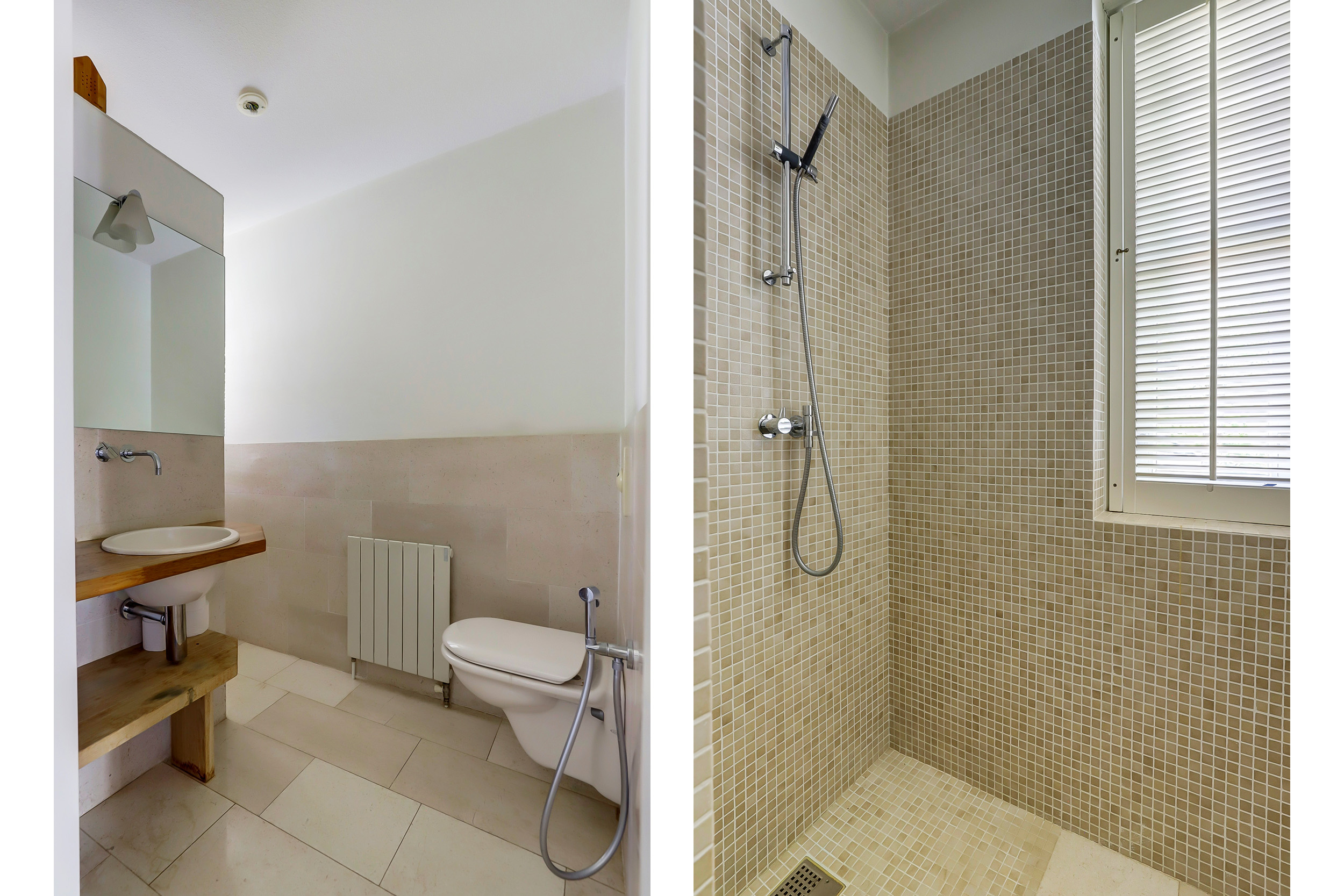 De badkamer is voorzien van douche, ligbad, een dubbele wastafel en een WC met bidet-handdouche.