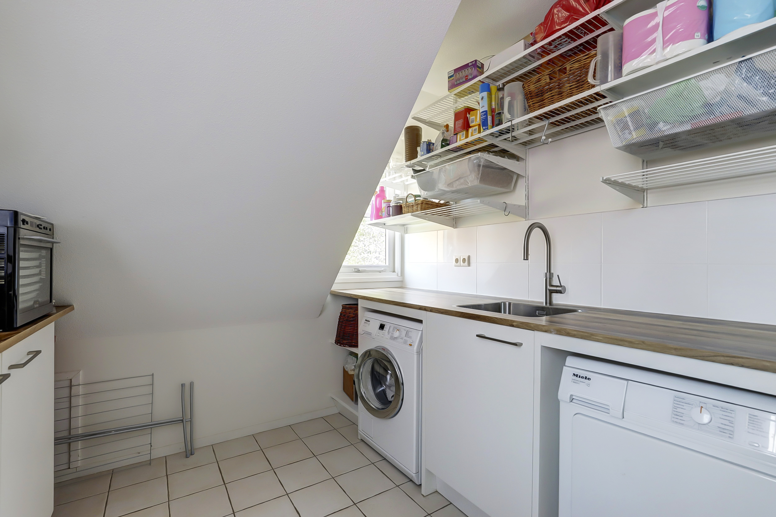 Boven een grote overloop met drie slaapkamers, een badkamer en een separate praktische bijkeuken, met keukenblokje, een kokendwaterkraan (Quooker) en de aansluitingen voor wasmachine en -droger.