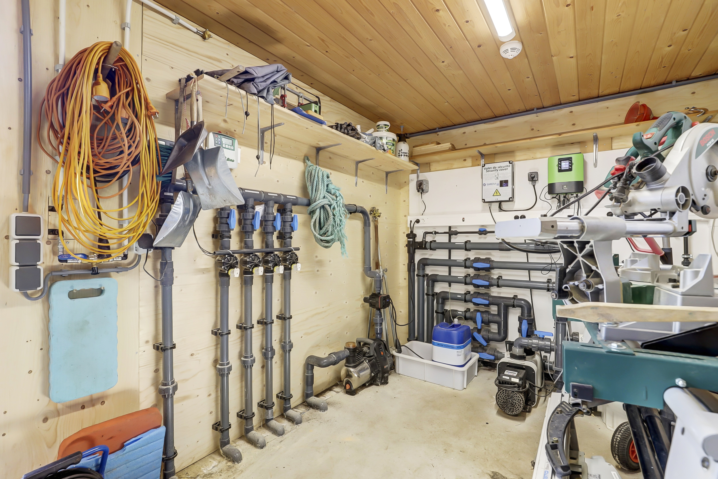 In de schuur van het bijgebouw vindt u een technische ruimte met daarin de zwembad- en sproei-installatie. Hier is er tevens ruimte om uw fietsen en uw gereedschap te stallen.