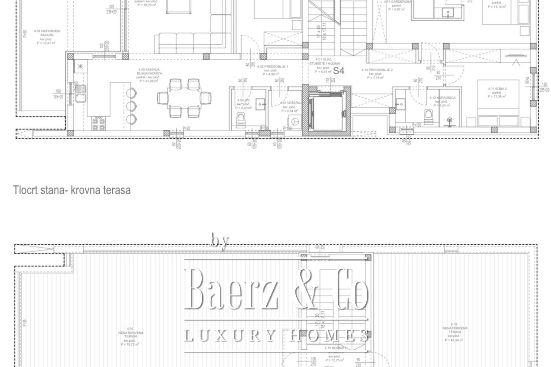 Penthouse Zadar - Okolica bevindt zich op het snijpunt van verfijnd kustdesign en ongeëvenaarde privacy. Gelegen op de tweede verdieping van een eigentijds nieuwbouwcomplex in Kožino, op slechts 200 meter van de Adriatische Zee, biedt dit penthouse directe toegang tot de serene levensstijl aan het water. De woning beschikt over 176,66 m² aan binnenruimte, met een open keuken en leefruimte die uitkomt op een overdekt balkon en loggia. Alle drie de slaapkamers zijn en suite; de master suite onderscheidt zich door de walk-in closet, waardoor deze woning een harmonieus toevluchtsoord vormt, geschikt voor zowel bewoning als investering.