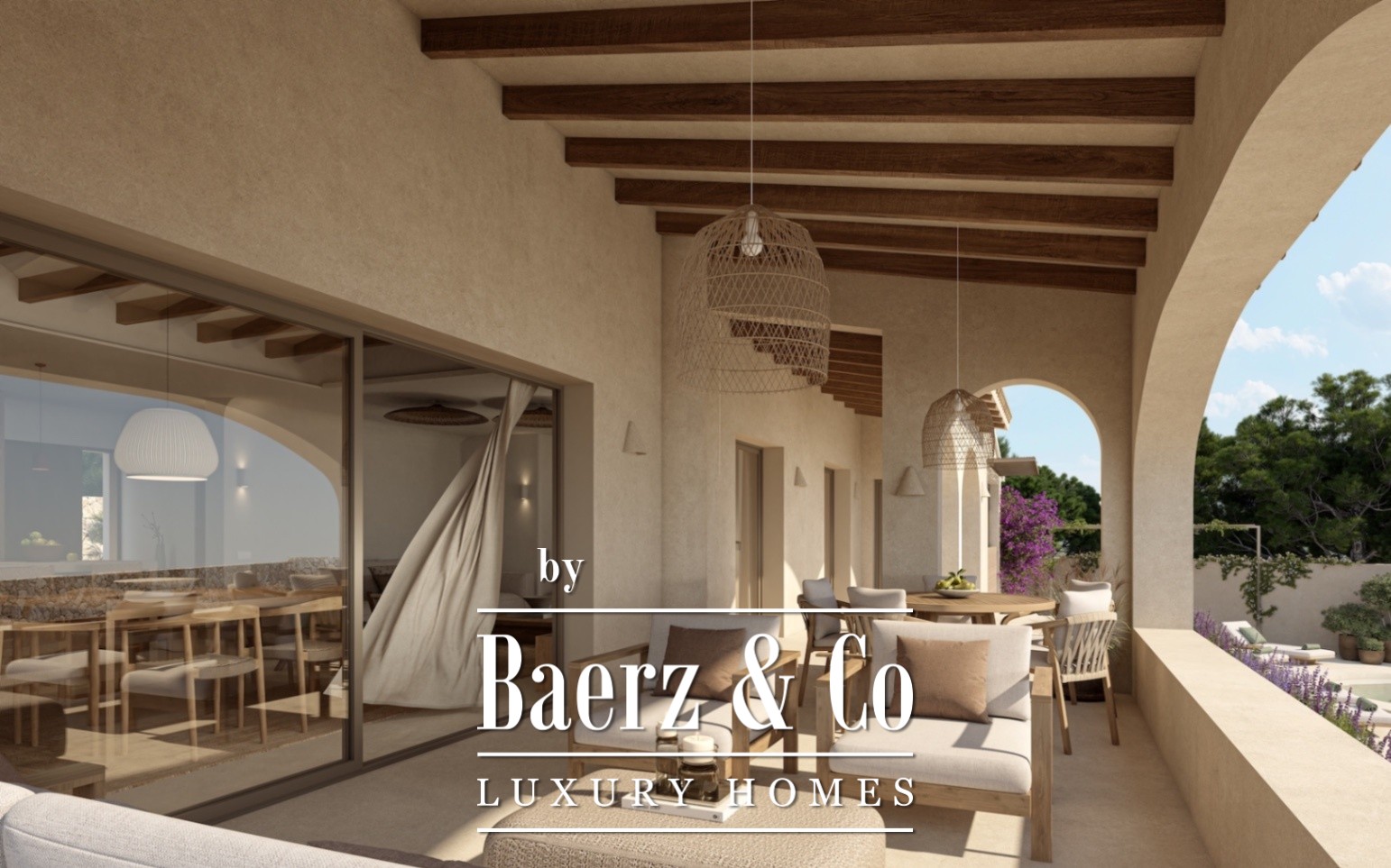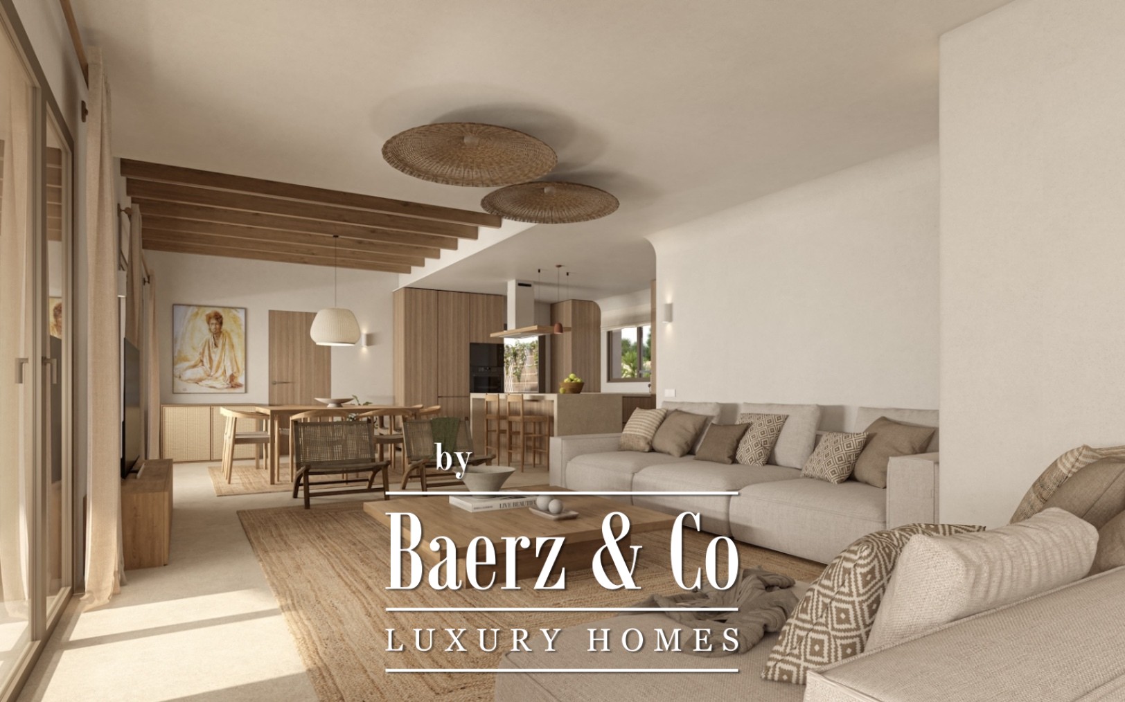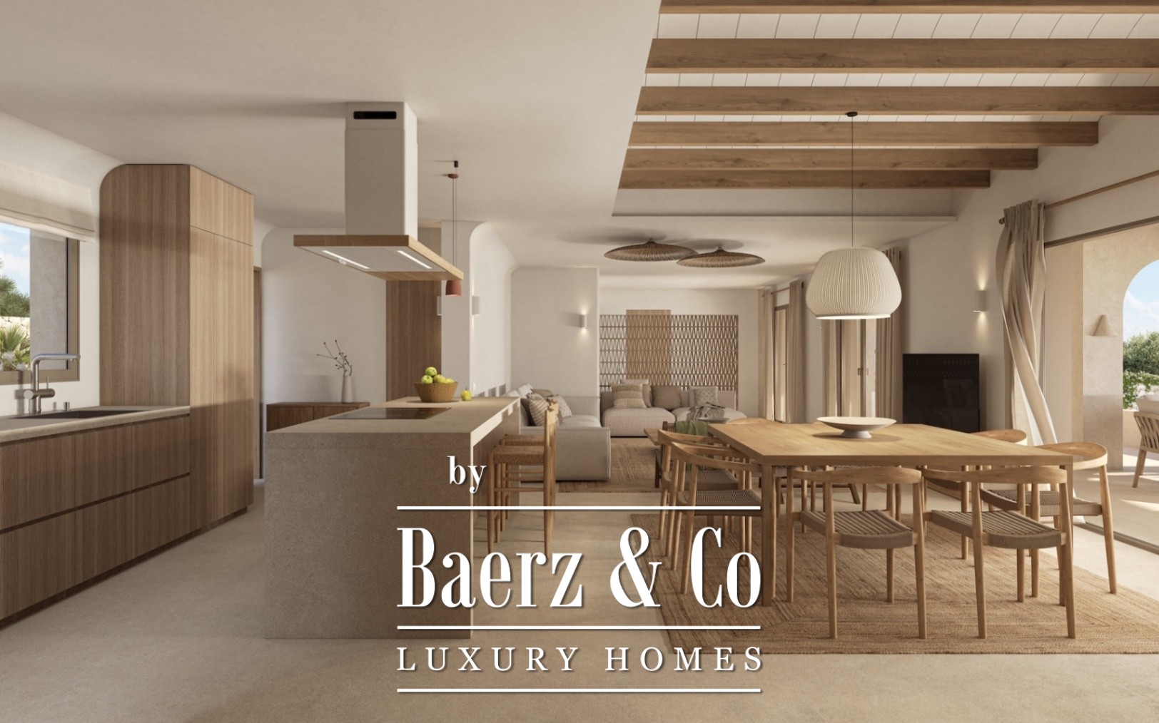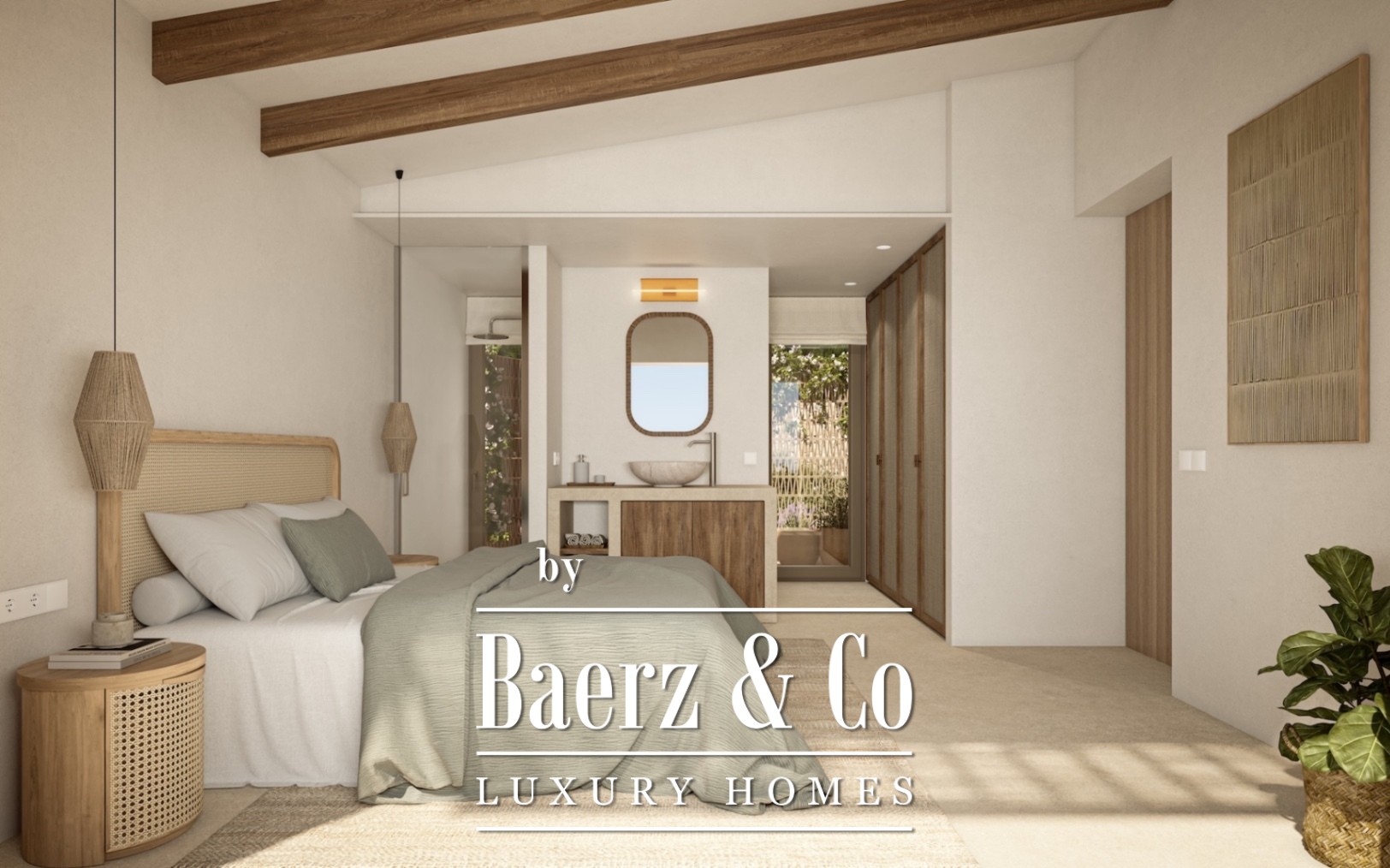 Вас встречает крытая парковка, окруженная бугенвиллиями и ажурными перегородками. Внутри объединённая гостиная, столовая и кухня оформлены с видимыми деревянными балками и декоративной штукатуркой под известь, а всюду используются мягкие природные оттенки. Кухня оборудована островом и техникой Bosch, что обеспечивает практичность для повседневной жизни и приёма гостей. Просторные окна органично интегрируют внешний и внутренний пространства, открывая доступ к крытой веранде и террасе у бассейна.