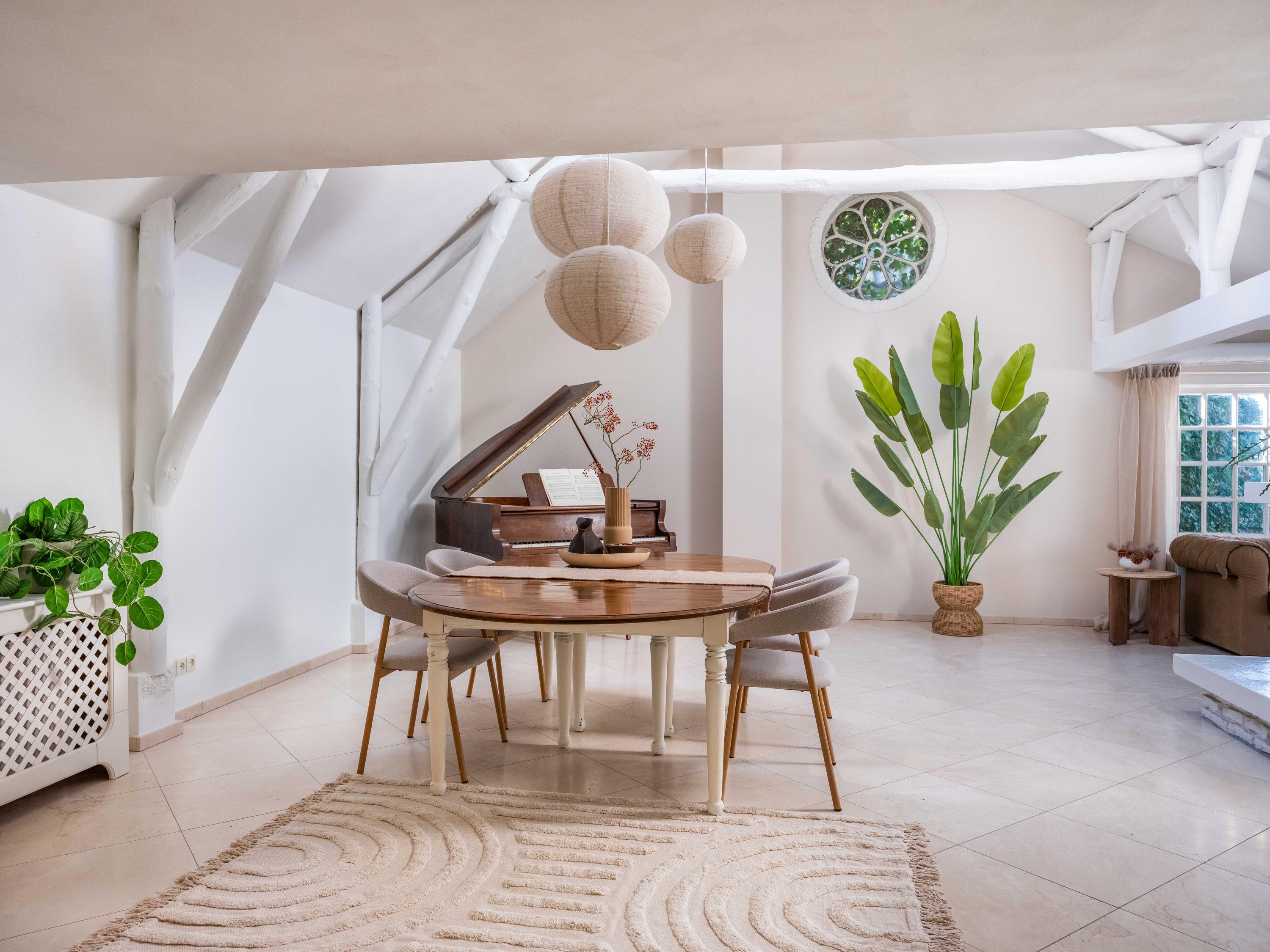 Гостиная оформлена с акцентом на камин с газовым топливом, открытые балки и витражные окна, подчеркивающие исторический стиль виллы. Высокие потолки наполняют пространство дневным светом; примыкающая кухня оборудована встроенной техникой и переходит в хозяйственное помещение с современными удобствами. На верхнем этаже главная спальня выходит на просторную террасу на крыше, где можно наблюдать закаты над сельской местностью. Ванная комната на втором этаже, обновлённая в 2018 году, оснащена ванной, душем с легким входом и двумя раковинами.